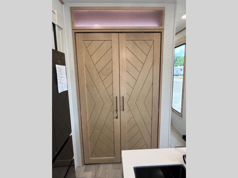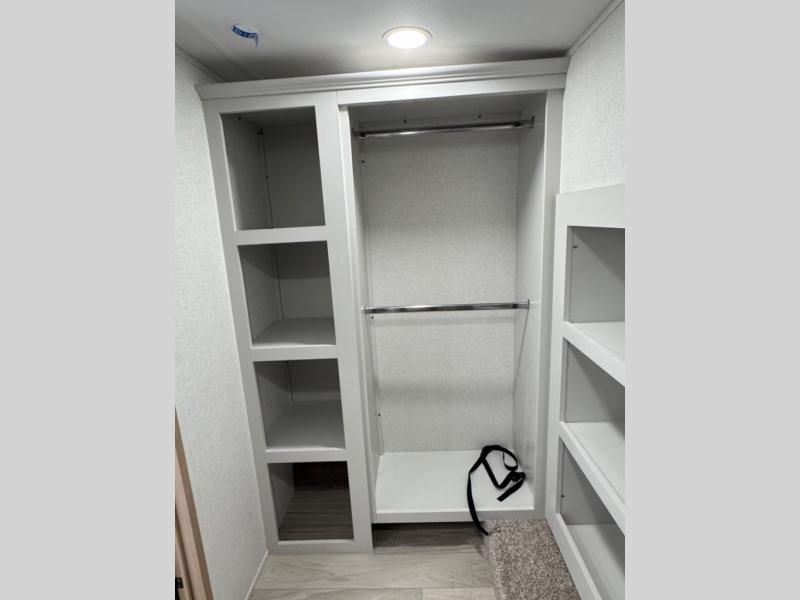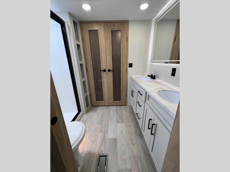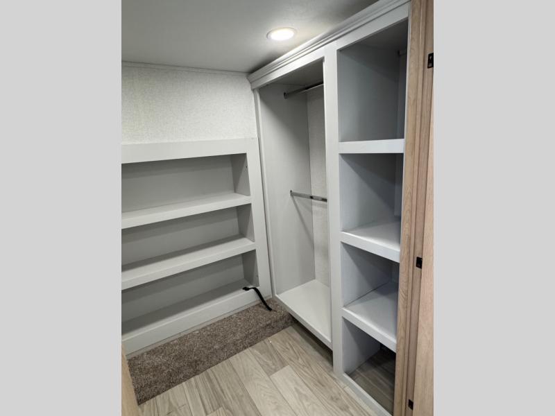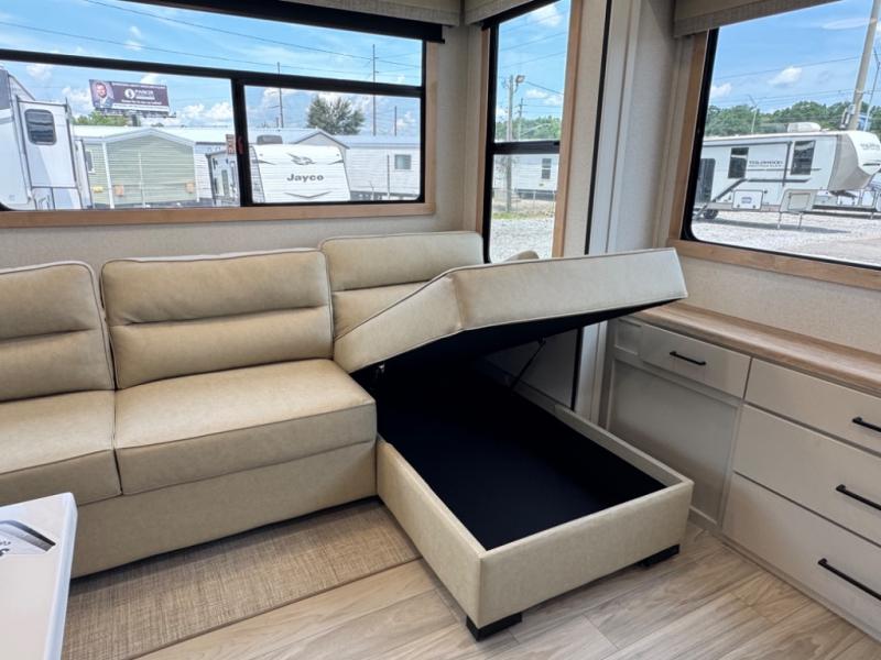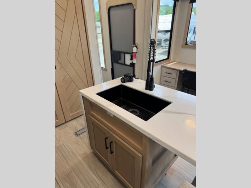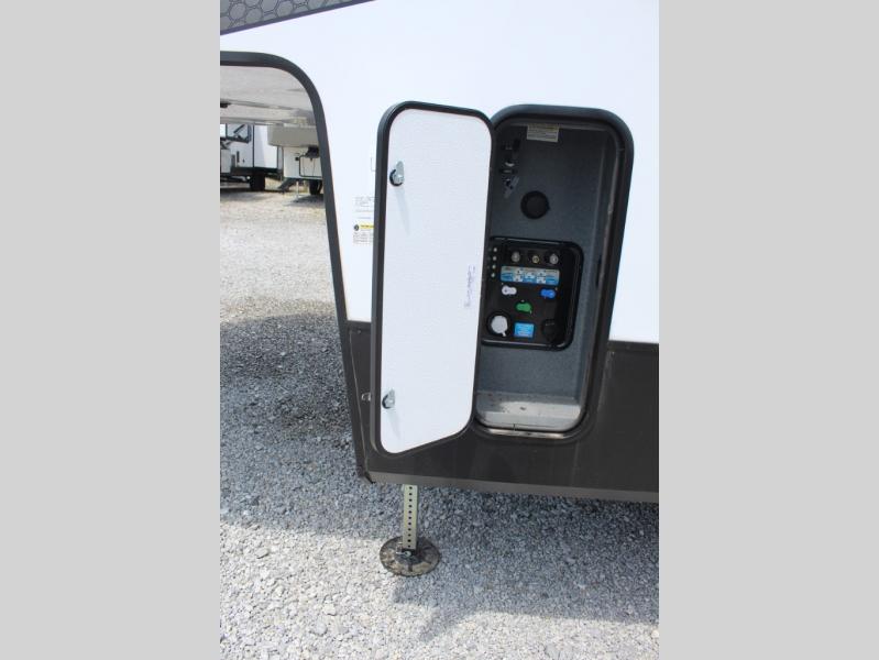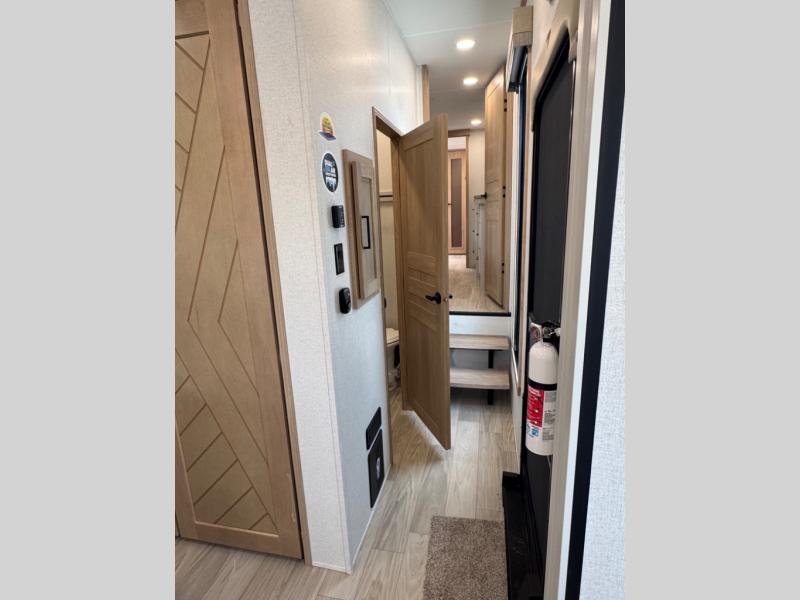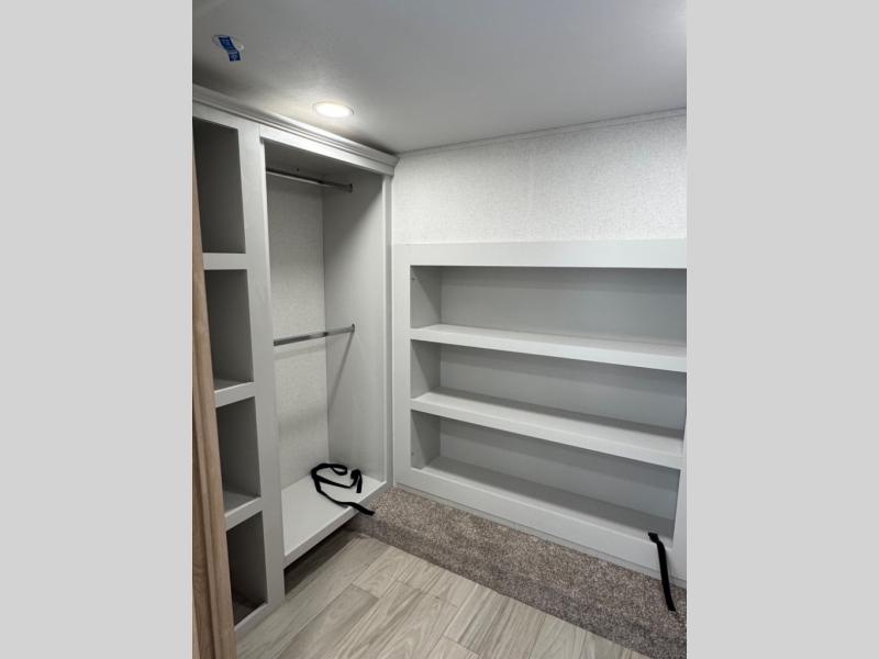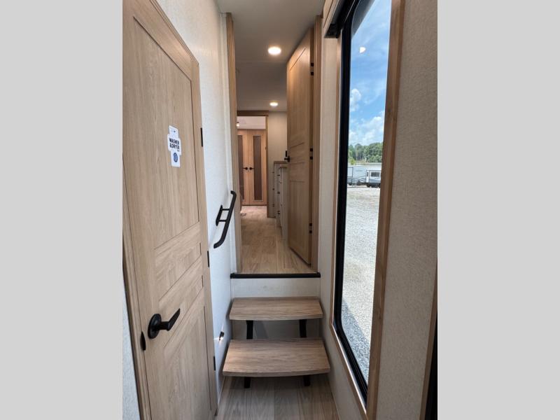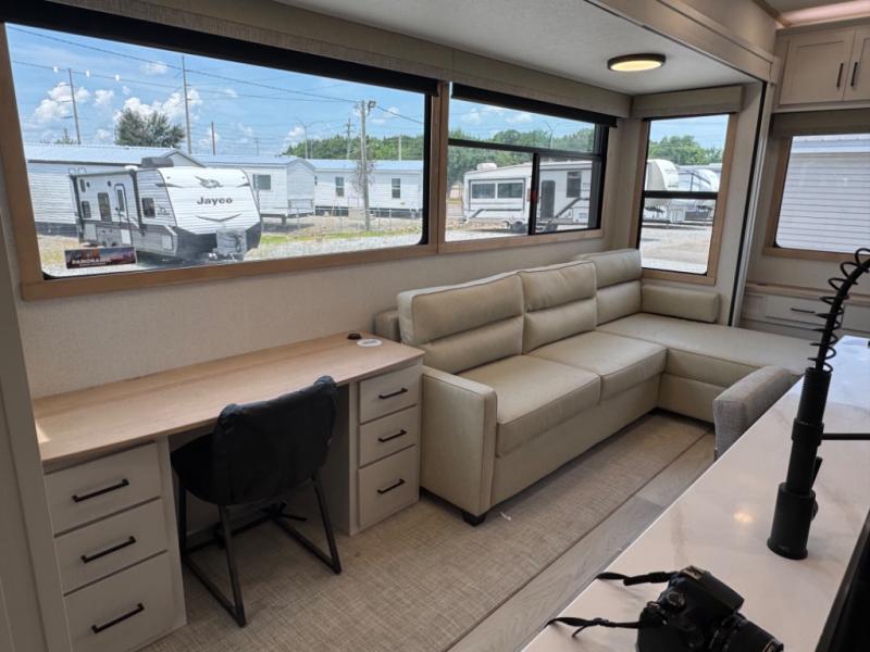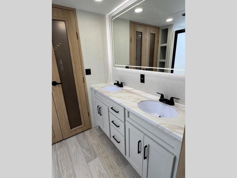 It will be easier than ever to enjoy camping trips in this triple slide out fifth wheel, or even go full-time! The combined kitchen and living area features dual opposing slides for ample space, an L-shaped sofa with a chaise lounge, and a fireplace with a hidden pantry behind for snacks! A desk with a chair and a USB port will provide a place to work if you need to send some emails, and the large kitchen island will give you ample room to prep dinner when you get hungry. There are also pendant lights here, along with a waterfall edge and barstools for dining space. The mid-coach half bath includes a toilet, sink, plus washer and dryer prep, giving you the option to make this the perfect laundry room! The master bedroom up front may be your favorite place to unwind in this unit. There is a king bed slide, a small dresser plus a tall dresser, and a TV hookup if you want the option to watch movies in bed. And you'll be wowed by the front master bedroom with its fiberglass shower with a seat, dual bath sinks, and large walk-in closet!