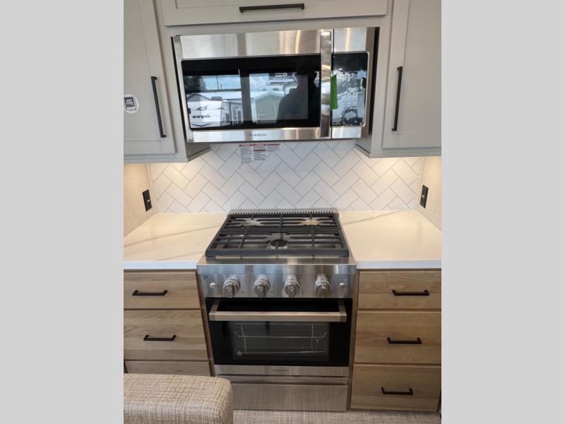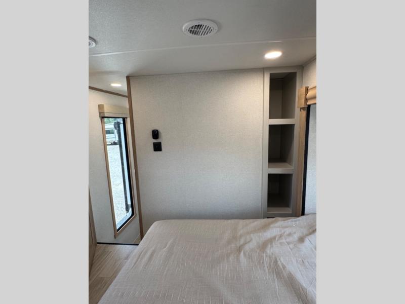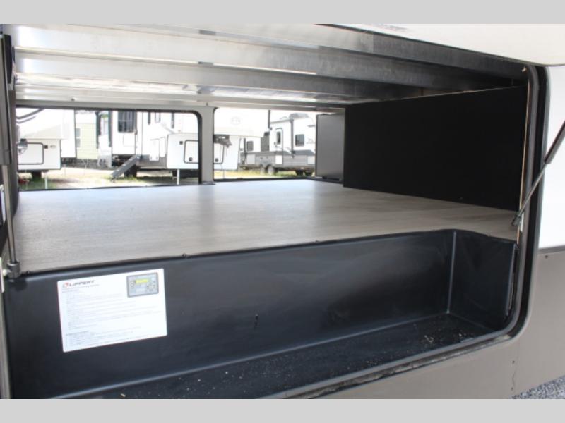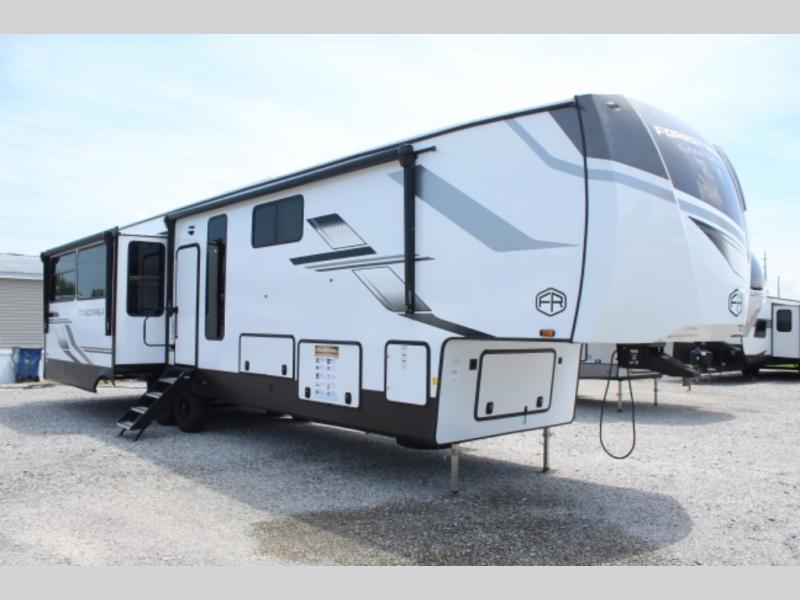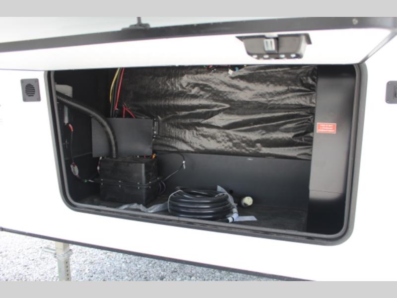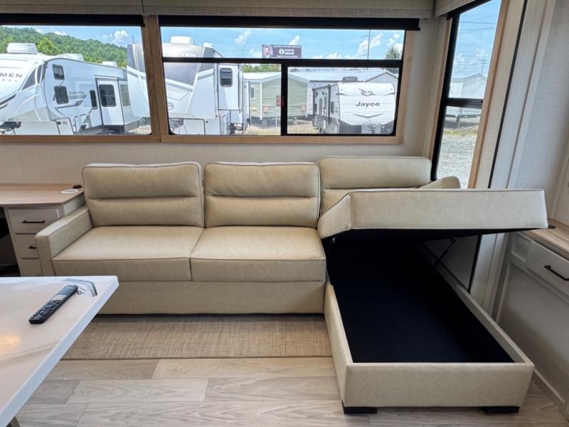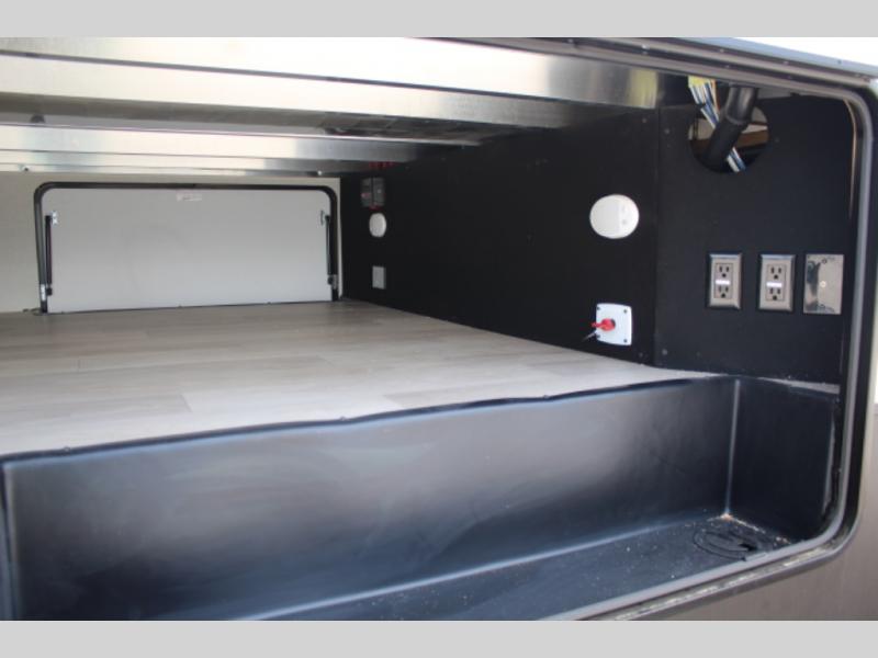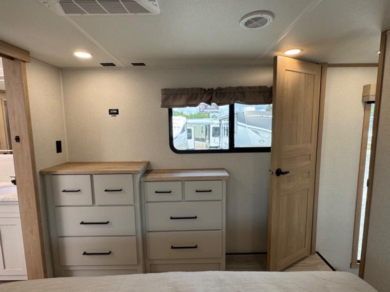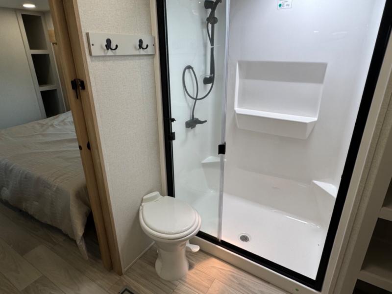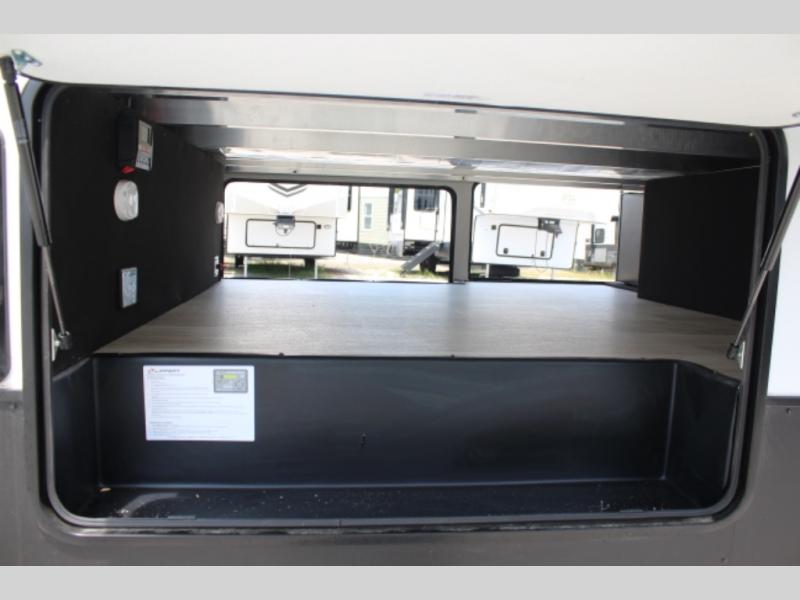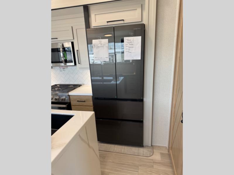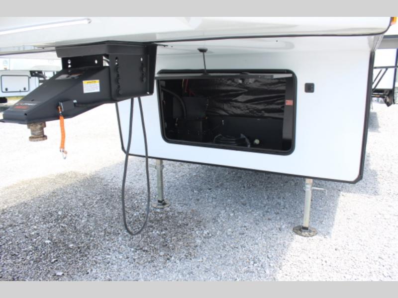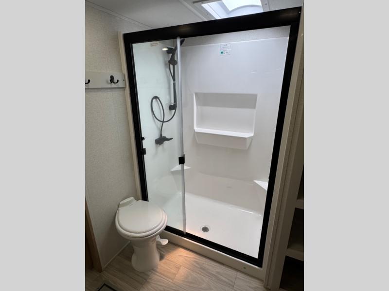 It will be easier than ever to enjoy camping trips in this triple slide out fifth wheel, or even go full-time! The combined kitchen and living area features dual opposing slides for ample space, an L-shaped sofa with a chaise lounge, and a fireplace with a hidden pantry behind for snacks! A desk with a chair and a USB port will provide a place to work if you need to send some emails, and the large kitchen island will give you ample room to prep dinner when you get hungry. There are also pendant lights here, along with a waterfall edge and barstools for dining space. The mid-coach half bath includes a toilet, sink, plus washer and dryer prep, giving you the option to make this the perfect laundry room! The master bedroom up front may be your favorite place to unwind in this unit. There is a king bed slide, a small dresser plus a tall dresser, and a TV hookup if you want the option to watch movies in bed. And you'll be wowed by the front master bedroom with its fiberglass shower with a seat, dual bath sinks, and large walk-in closet!