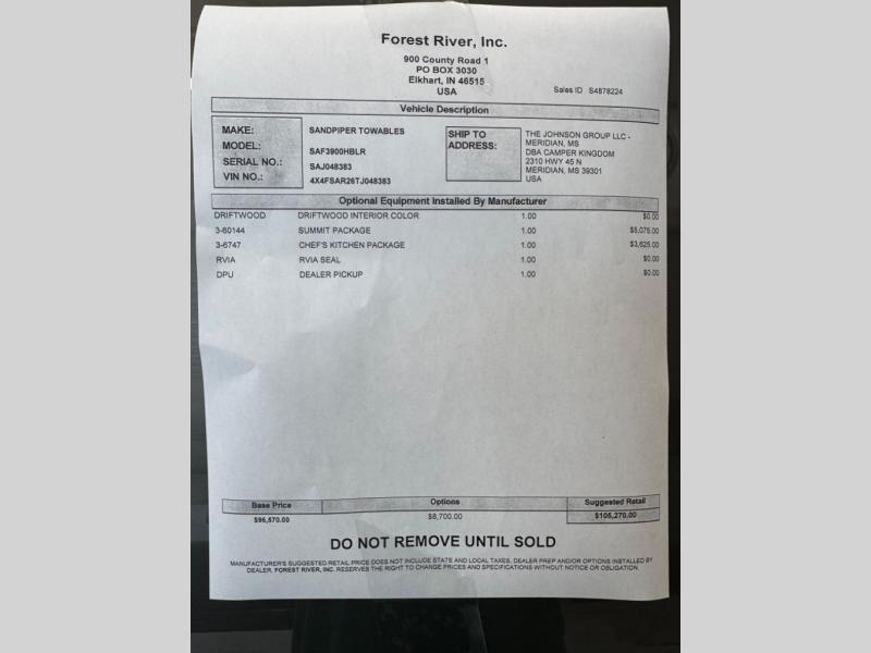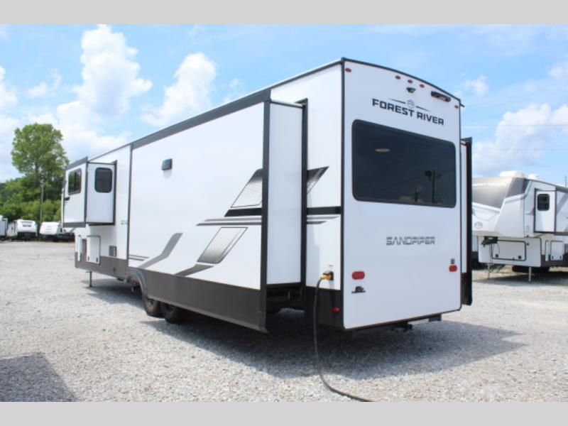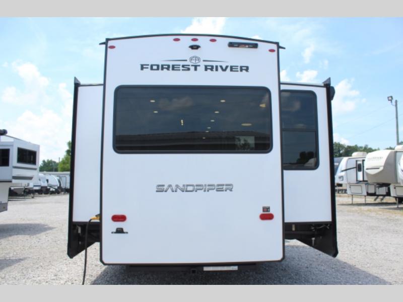 You will find the perfect balance of size, space, features, and luxury with any one of these Forest River Sandpiper fifth wheels! They are constructed with a welded aluminum framed vacuum bonded laminated superstructure, a cambered powder coated frame with rust prohibitor, and a fully enclosed underbelly for added protection against the elements. The large tinted windows come with a 80/20 UV prohibitor or you can choose the optional dual pane windows. Some hassle-free amenities include a 60k BTU on-demand water heater, full coach water filter system, tire pressure monitor system, and an electric leveling system! Inside, you'll enjoy stainless steel appliances, solid surface countertops, Beachside Sundance linoleum, recessed residential lighting, and many more comforts!