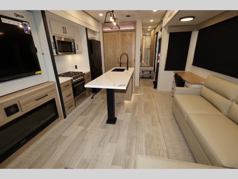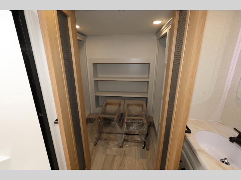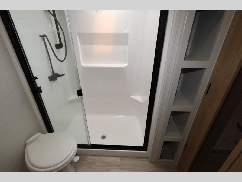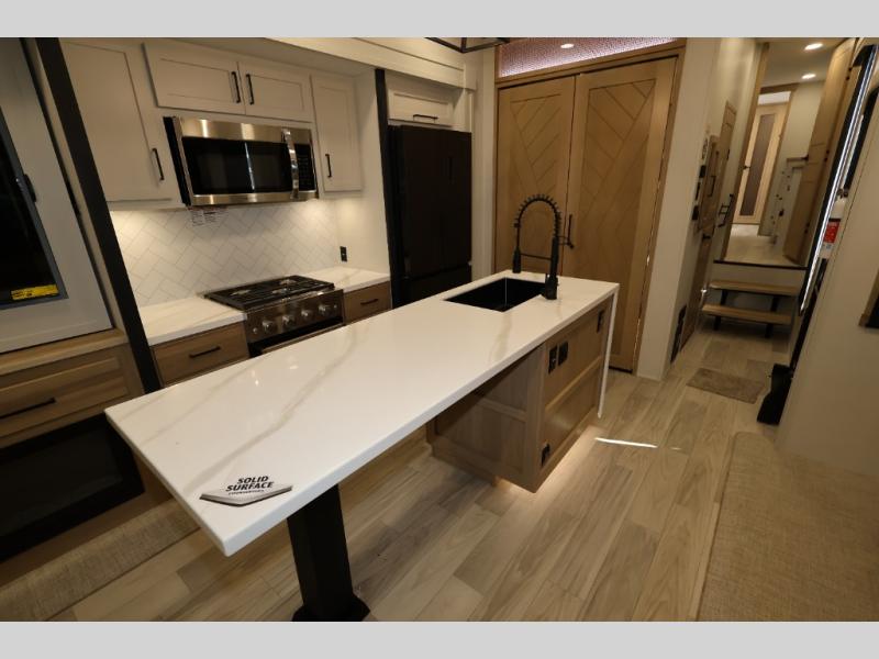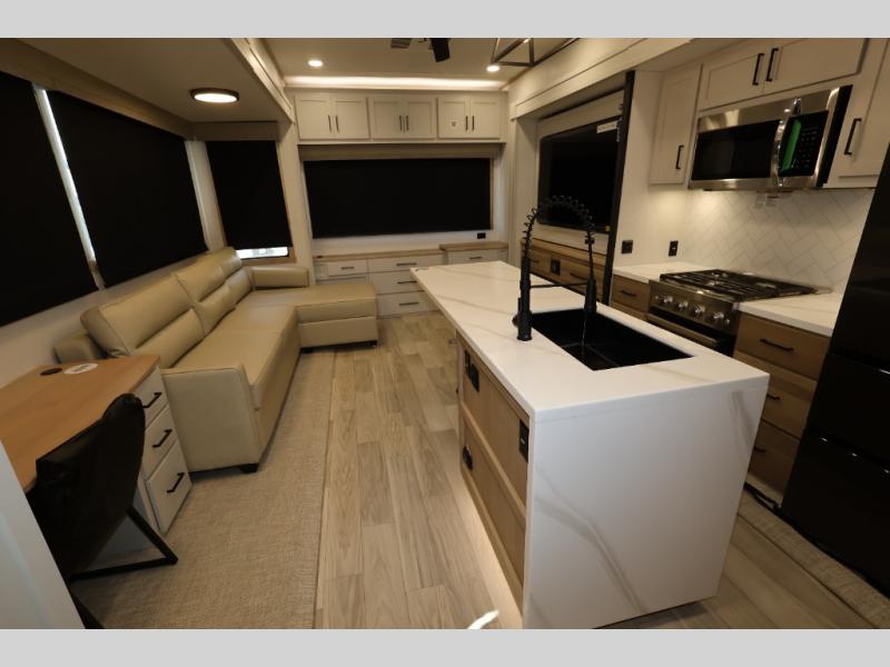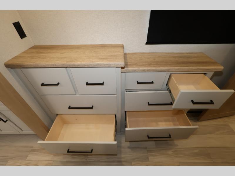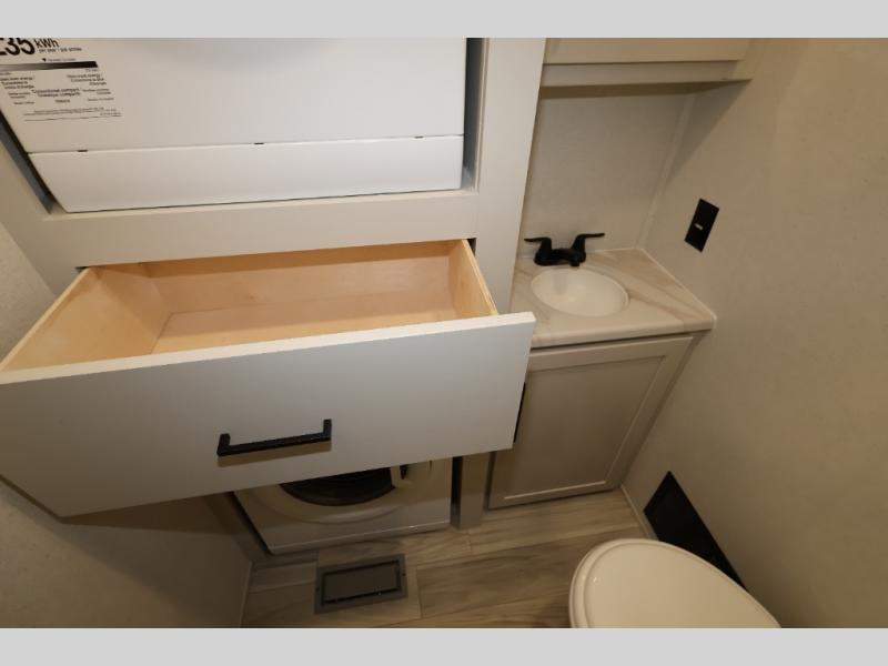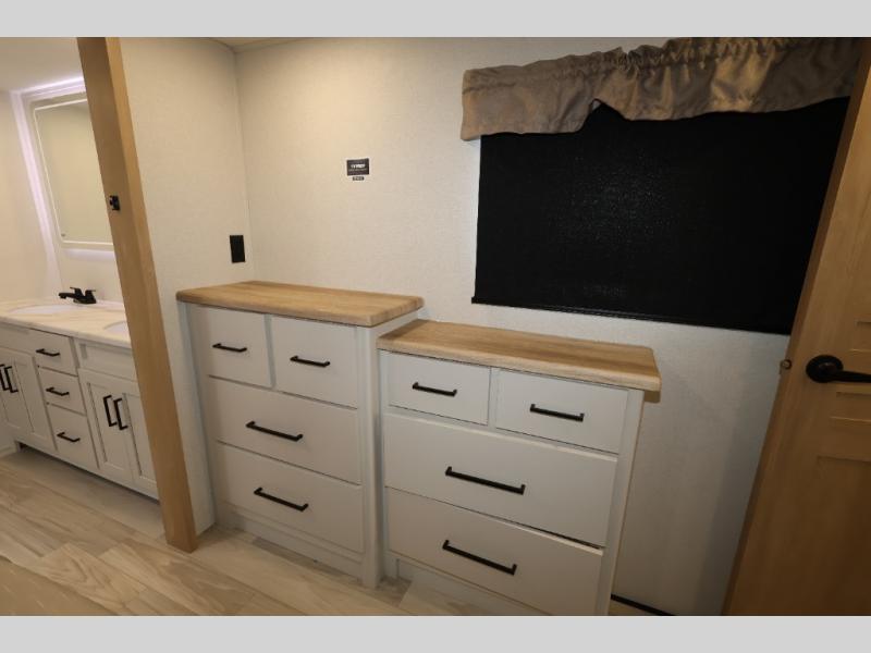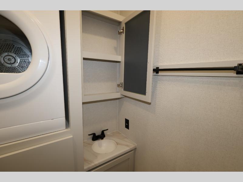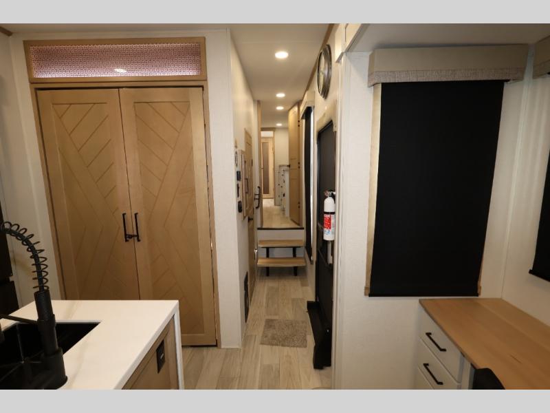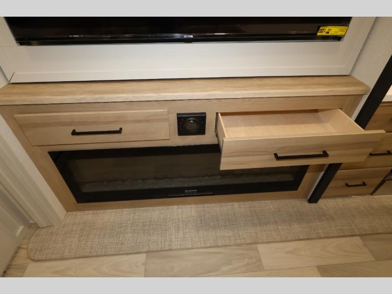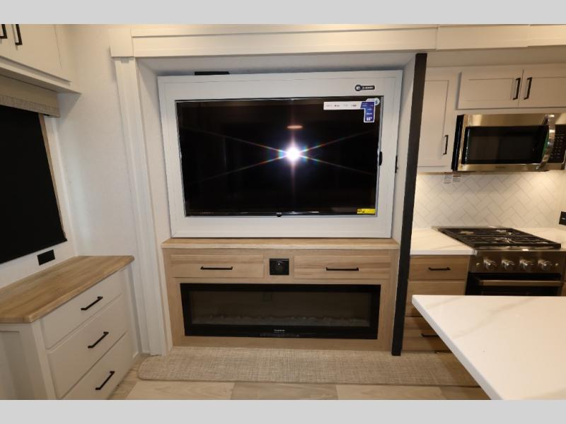 It will be easier than ever to enjoy camping trips in this triple slide out fifth wheel, or even go full-time! The combined kitchen and living area features dual opposing slides for ample space, an L-shaped sofa with a chaise lounge, and a fireplace with a hidden pantry behind for snacks! A desk with a chair and a USB port will provide a place to work if you need to send some emails, and the large kitchen island will give you ample room to prep dinner when you get hungry. There are also pendant lights here, along with a waterfall edge and barstools for dining space. The mid-coach half bath includes a toilet, sink, plus washer and dryer prep, giving you the option to make this the perfect laundry room! The master bedroom up front may be your favorite place to unwind in this unit. There is a king bed slide, a small dresser plus a tall dresser, and a TV hookup if you want the option to watch movies in bed. And you'll be wowed by the front master bedroom with its fiberglass shower with a seat, dual bath sinks, and large walk-in closet!
