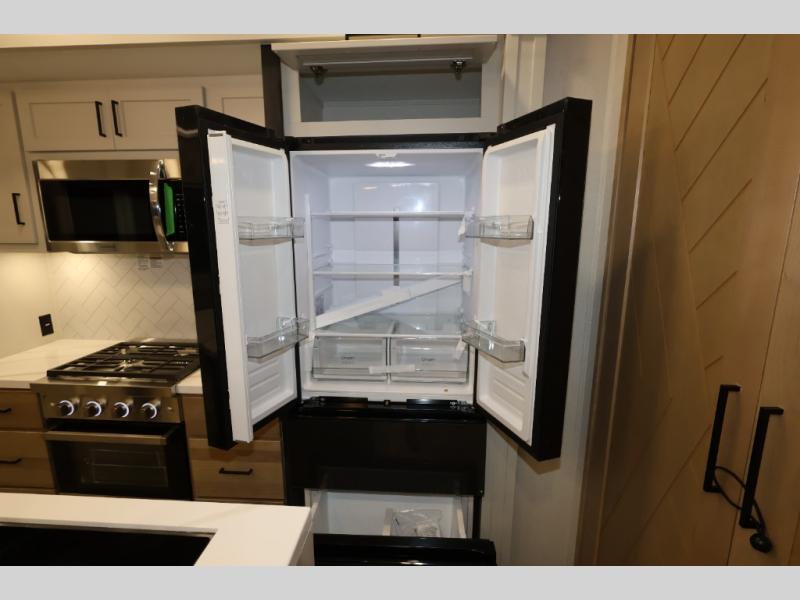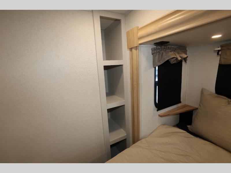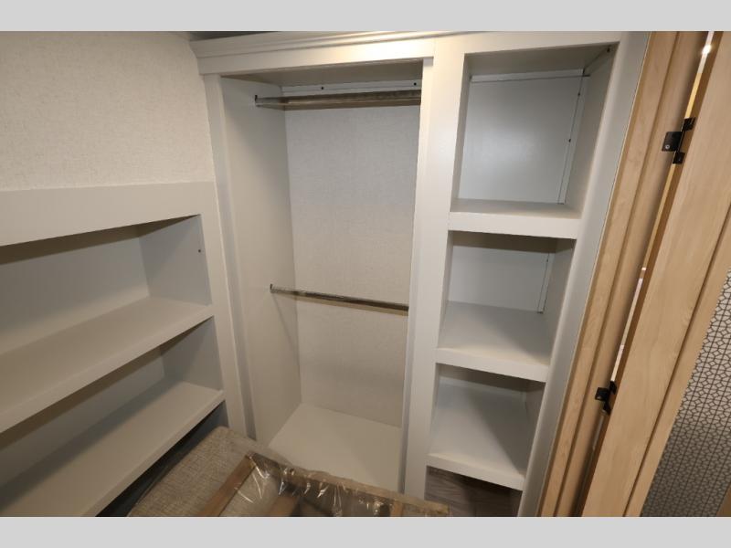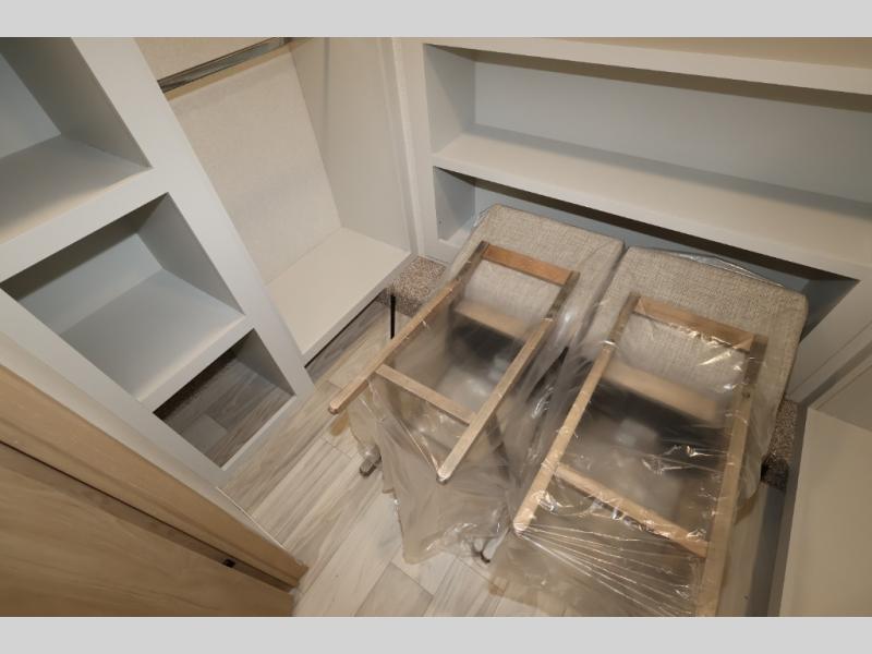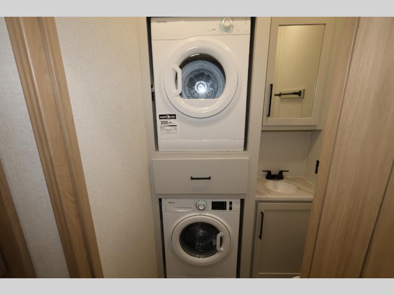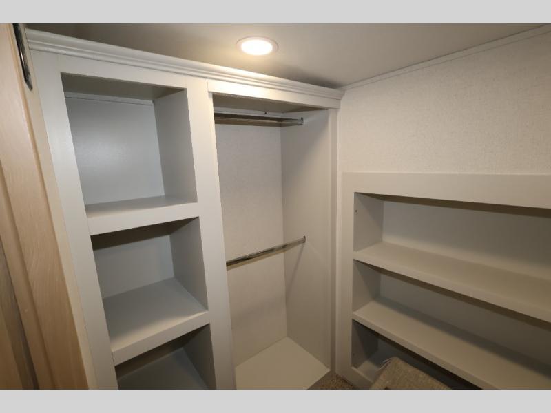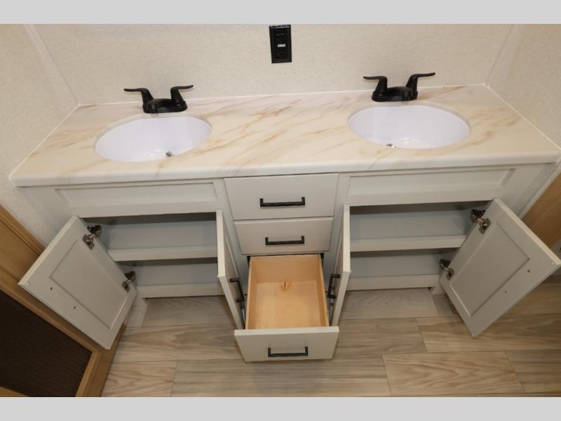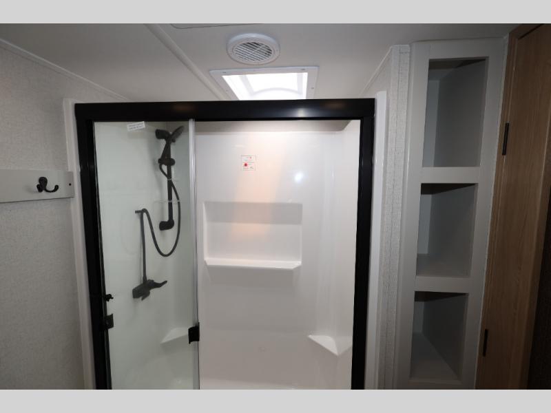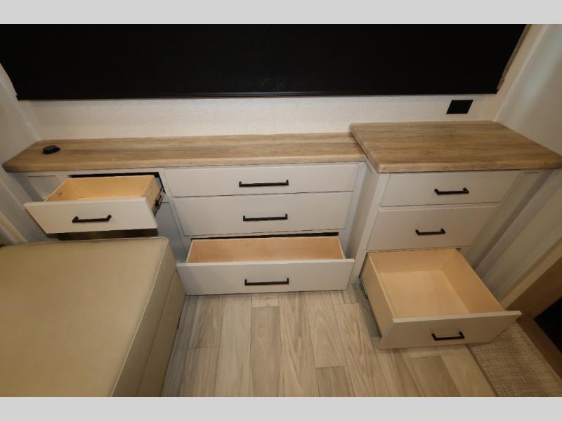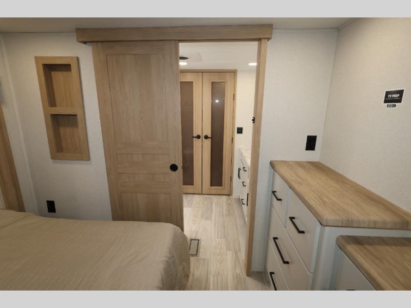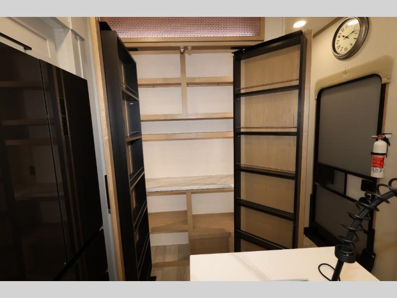 It will be easier than ever to enjoy camping trips in this triple slide out fifth wheel, or even go full-time! The combined kitchen and living area features dual opposing slides for ample space, an L-shaped sofa with a chaise lounge, and a fireplace with a hidden pantry behind for snacks! A desk with a chair and a USB port will provide a place to work if you need to send some emails, and the large kitchen island will give you ample room to prep dinner when you get hungry. There are also pendant lights here, along with a waterfall edge and barstools for dining space. The mid-coach half bath includes a toilet, sink, plus washer and dryer prep, giving you the option to make this the perfect laundry room! The master bedroom up front may be your favorite place to unwind in this unit. There is a king bed slide, a small dresser plus a tall dresser, and a TV hookup if you want the option to watch movies in bed. And you'll be wowed by the front master bedroom with its fiberglass shower with a seat, dual bath sinks, and large walk-in closet!