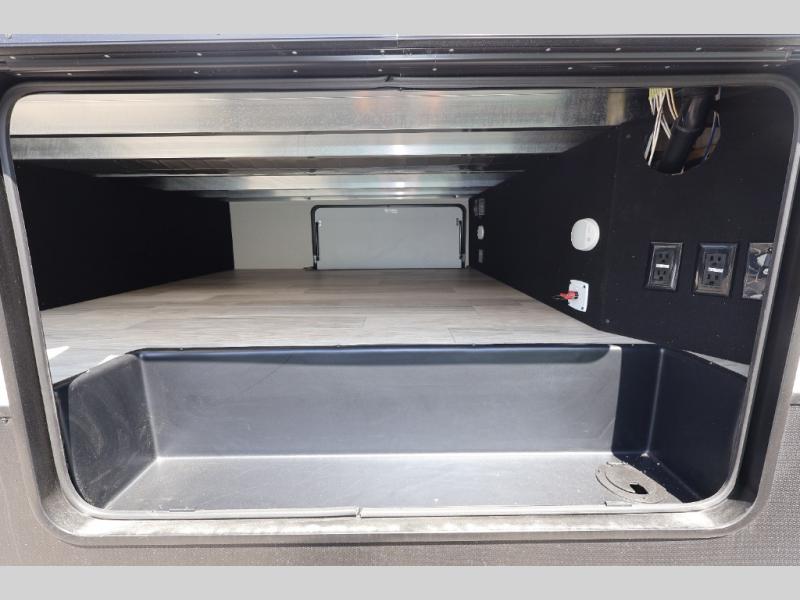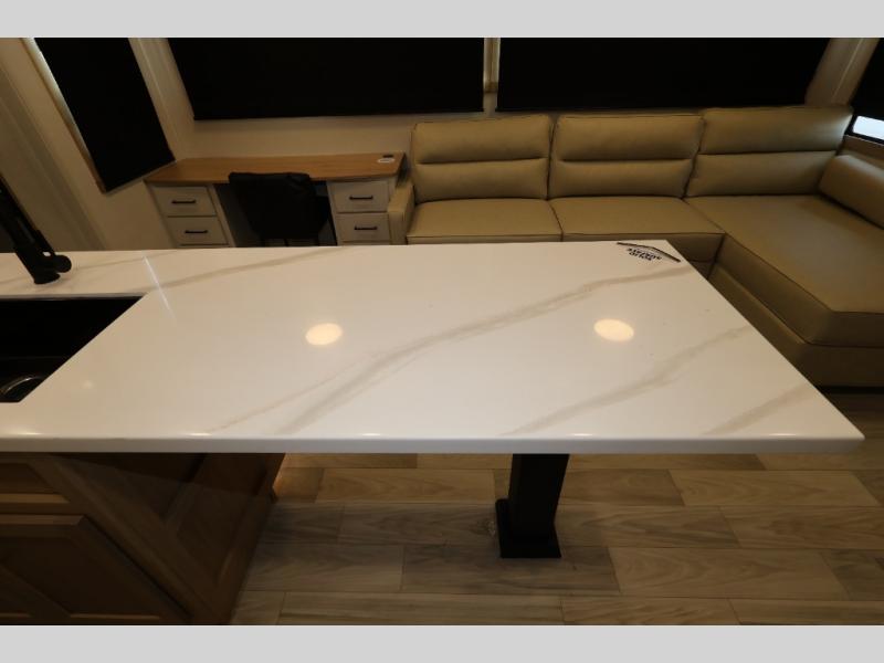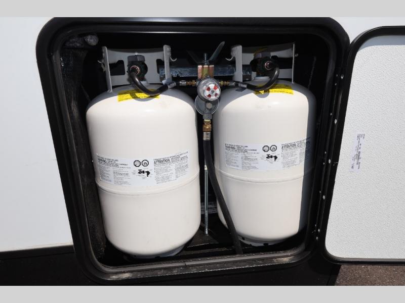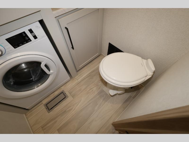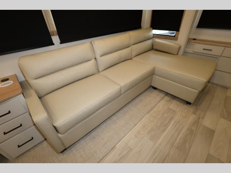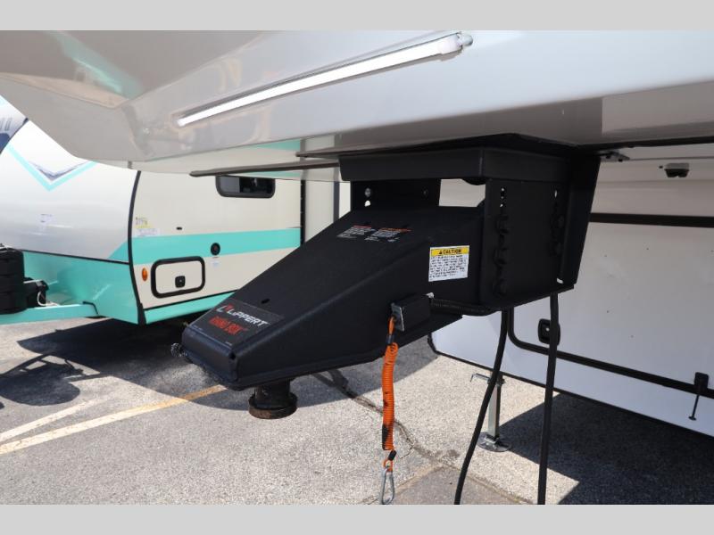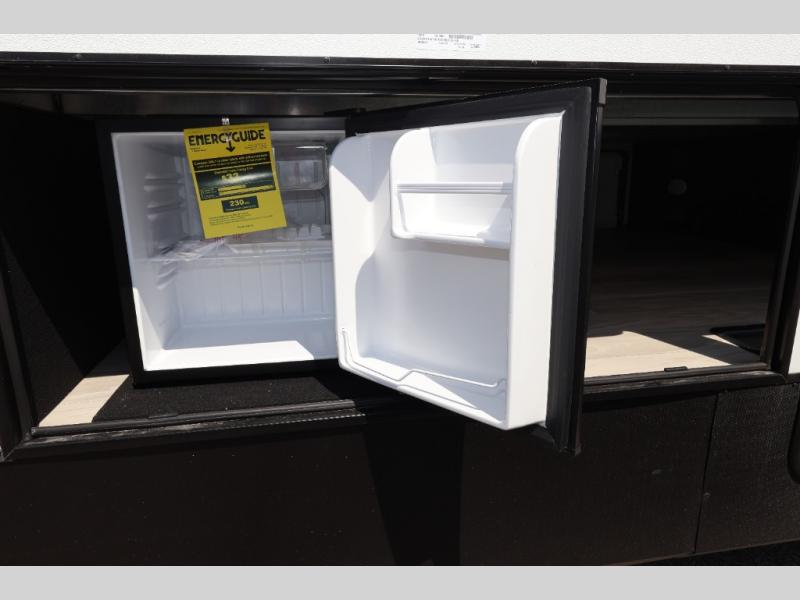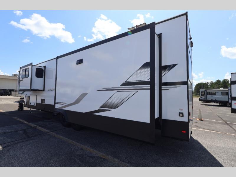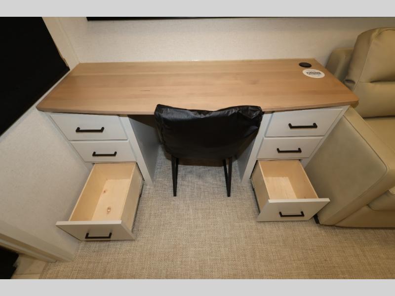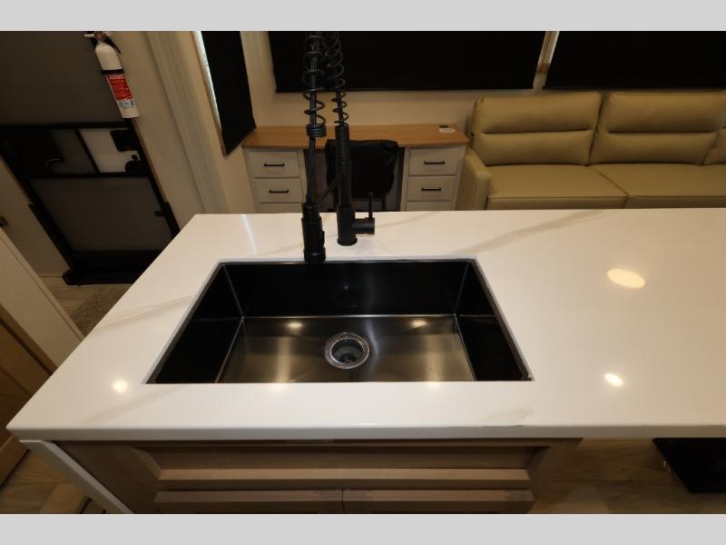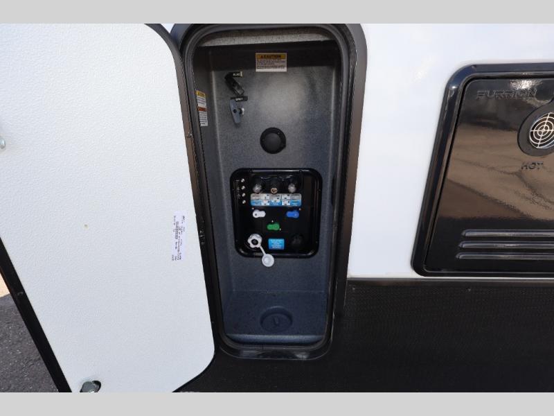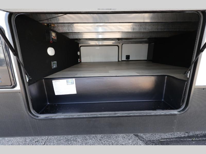 It will be easier than ever to enjoy camping trips in this triple slide out fifth wheel, or even go full-time! The combined kitchen and living area features dual opposing slides for ample space, an L-shaped sofa with a chaise lounge, and a fireplace with a hidden pantry behind for snacks! A desk with a chair and a USB port will provide a place to work if you need to send some emails, and the large kitchen island will give you ample room to prep dinner when you get hungry. There are also pendant lights here, along with a waterfall edge and barstools for dining space. The mid-coach half bath includes a toilet, sink, plus washer and dryer prep, giving you the option to make this the perfect laundry room! The master bedroom up front may be your favorite place to unwind in this unit. There is a king bed slide, a small dresser plus a tall dresser, and a TV hookup if you want the option to watch movies in bed. And you'll be wowed by the front master bedroom with its fiberglass shower with a seat, dual bath sinks, and large walk-in closet!