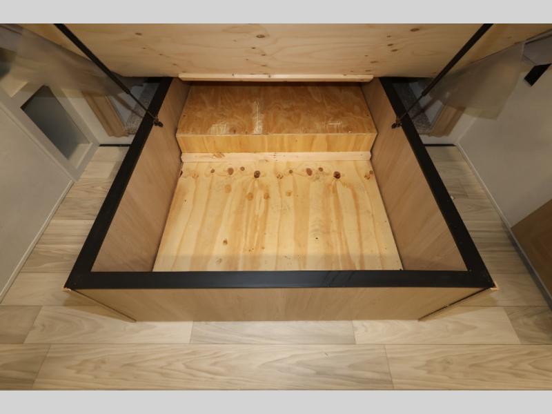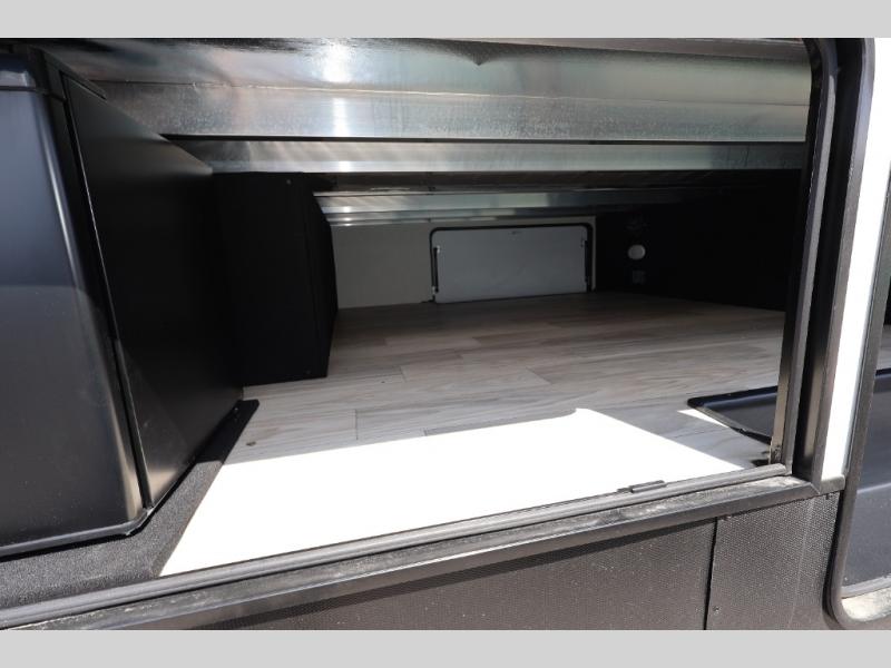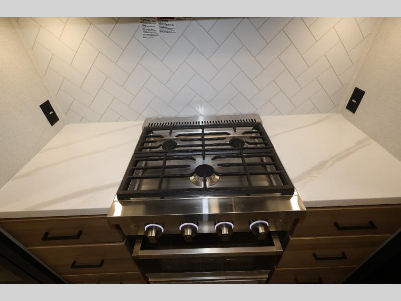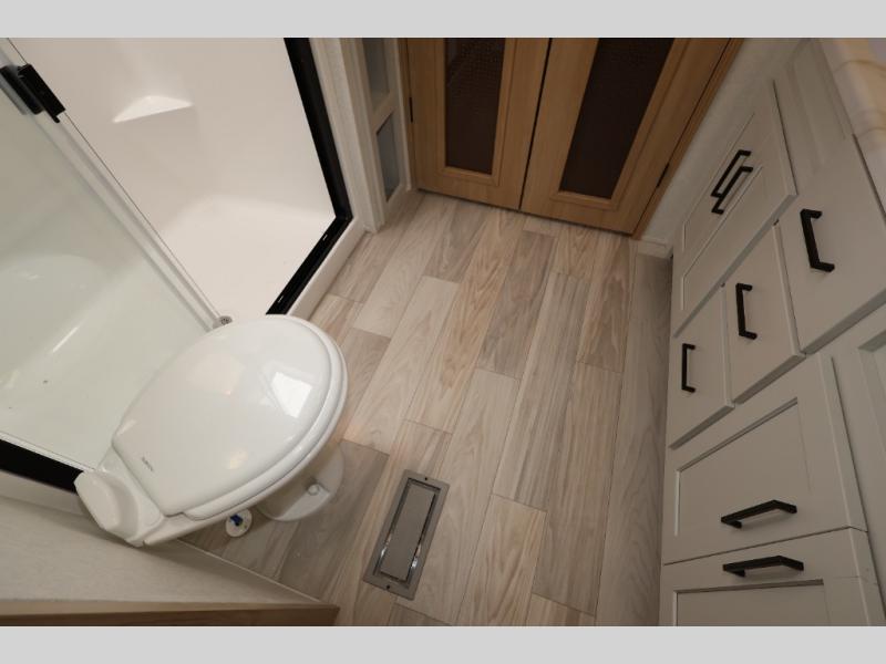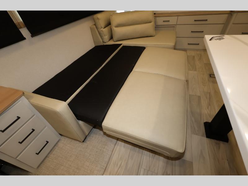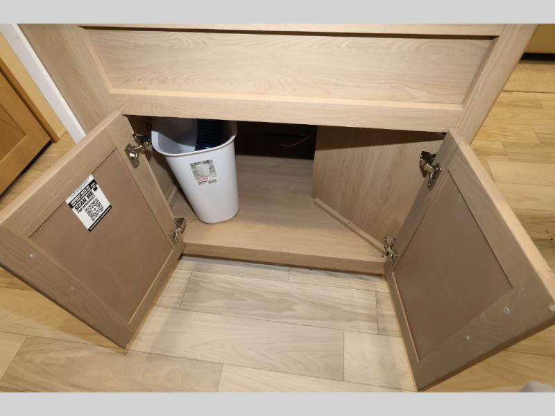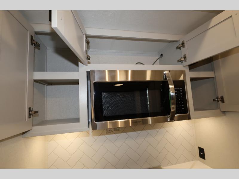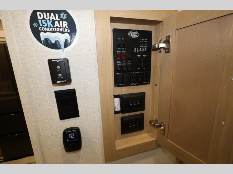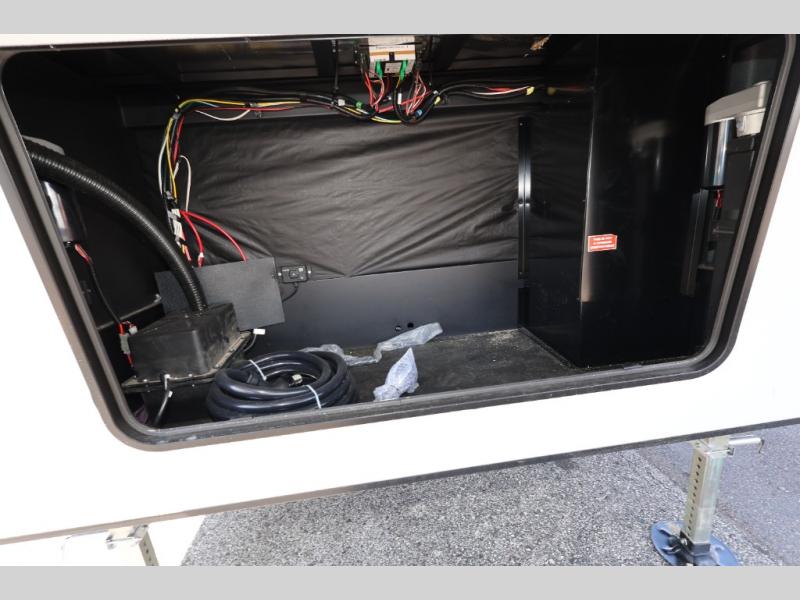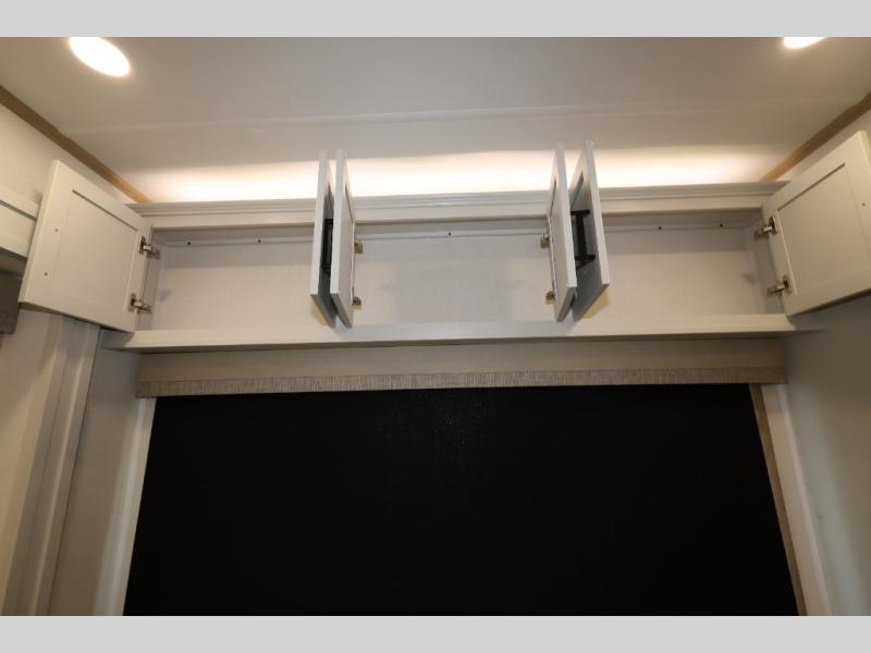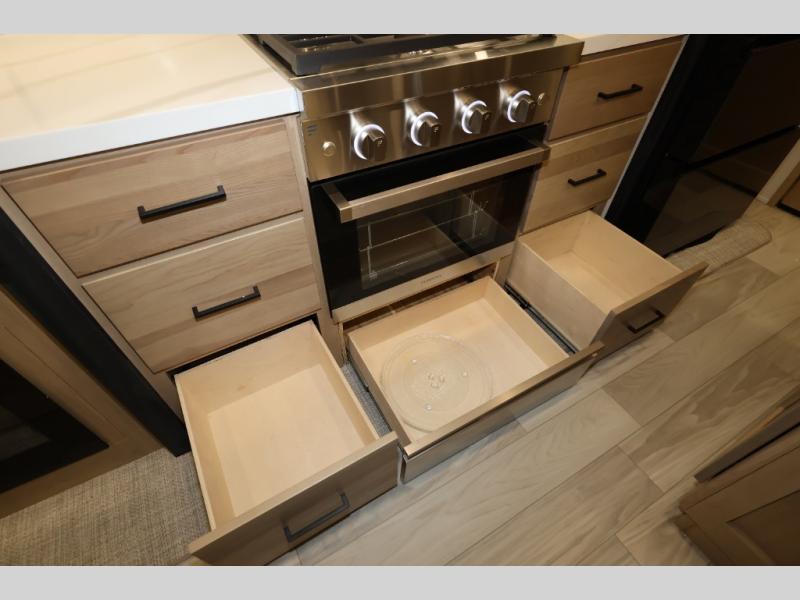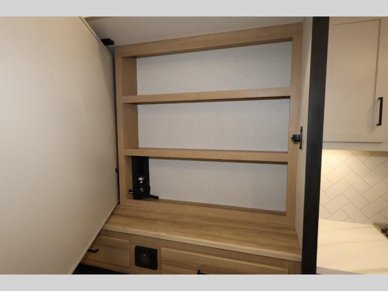 It will be easier than ever to enjoy camping trips in this triple slide out fifth wheel, or even go full-time! The combined kitchen and living area features dual opposing slides for ample space, an L-shaped sofa with a chaise lounge, and a fireplace with a hidden pantry behind for snacks! A desk with a chair and a USB port will provide a place to work if you need to send some emails, and the large kitchen island will give you ample room to prep dinner when you get hungry. There are also pendant lights here, along with a waterfall edge and barstools for dining space. The mid-coach half bath includes a toilet, sink, plus washer and dryer prep, giving you the option to make this the perfect laundry room! The master bedroom up front may be your favorite place to unwind in this unit. There is a king bed slide, a small dresser plus a tall dresser, and a TV hookup if you want the option to watch movies in bed. And you'll be wowed by the front master bedroom with its fiberglass shower with a seat, dual bath sinks, and large walk-in closet!