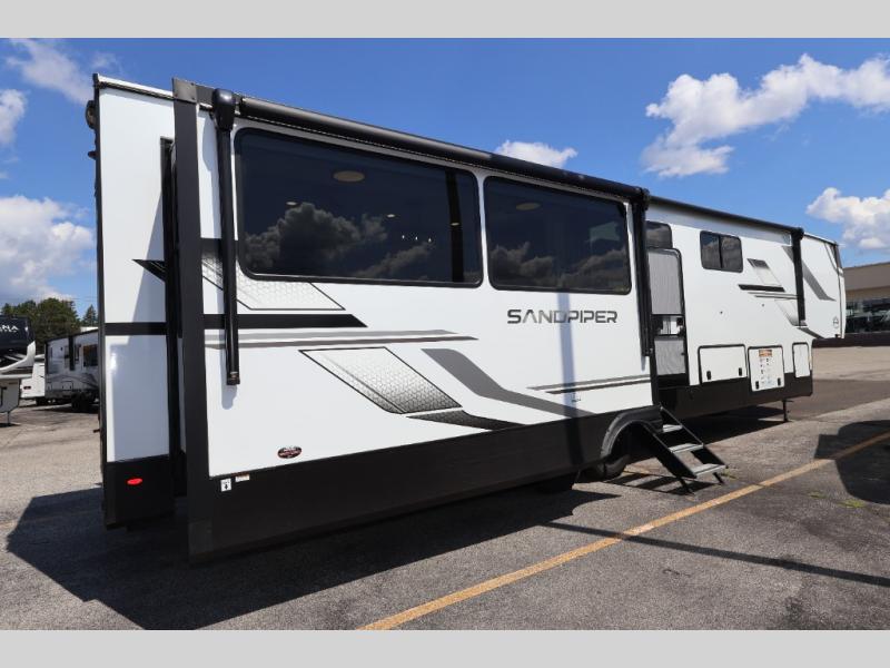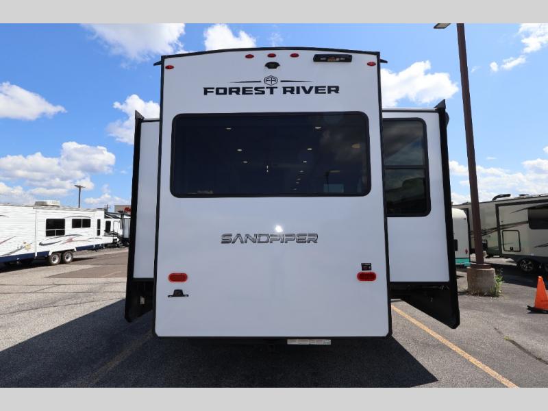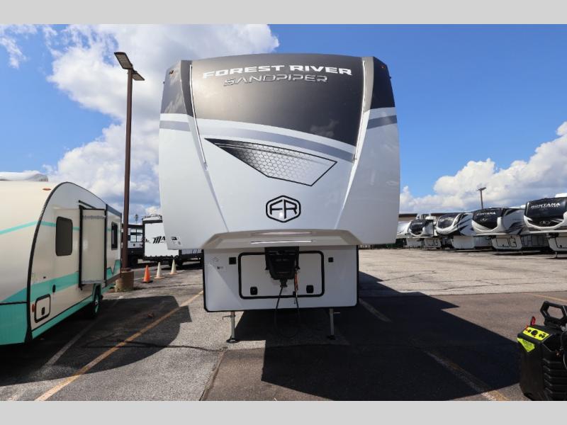 You will find the perfect balance of size, space, features, and luxury with any one of these Forest River Sandpiper fifth wheels! They are constructed with a welded aluminum framed vacuum bonded laminated superstructure, a cambered powder coated frame with rust prohibitor, and a fully enclosed underbelly for added protection against the elements. The large tinted windows come with a 80/20 UV prohibitor or you can choose the optional dual pane windows. Some hassle-free amenities include a 60k BTU on-demand water heater, full coach water filter system, tire pressure monitor system, and an electric leveling system! Inside, you'll enjoy stainless steel appliances, solid surface countertops, Beachside Sundance linoleum, recessed residential lighting, and many more comforts!