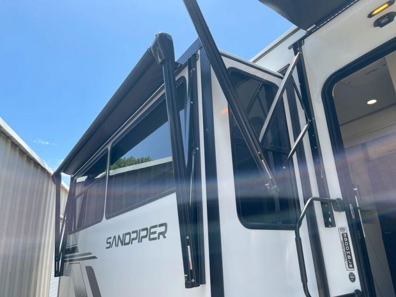 You will find the perfect balance of size, space, features, and luxury with any one of these Forest River Sandpiper fifth wheels! They are constructed with a welded aluminum framed vacuum bonded laminated superstructure, a cambered powder coated frame with rust prohibitor, and a fully enclosed underbelly for added protection against the elements. The large tinted windows come with a 80/20 UV prohibitor or you can choose the optional dual pane windows. Some hassle-free amenities include a 60k BTU on-demand water heater, full coach water filter system, tire pressure monitor system, and an electric leveling system! Inside, you'll enjoy stainless steel appliances, solid surface countertops, Beachside Sundance linoleum, recessed residential lighting, and many more comforts!