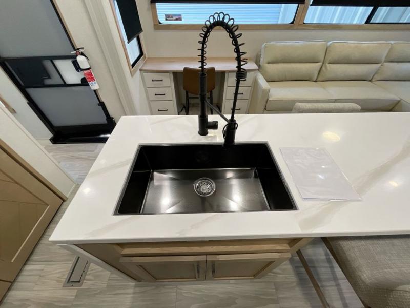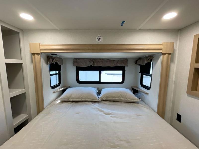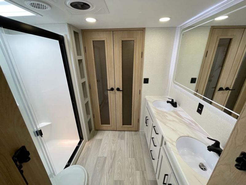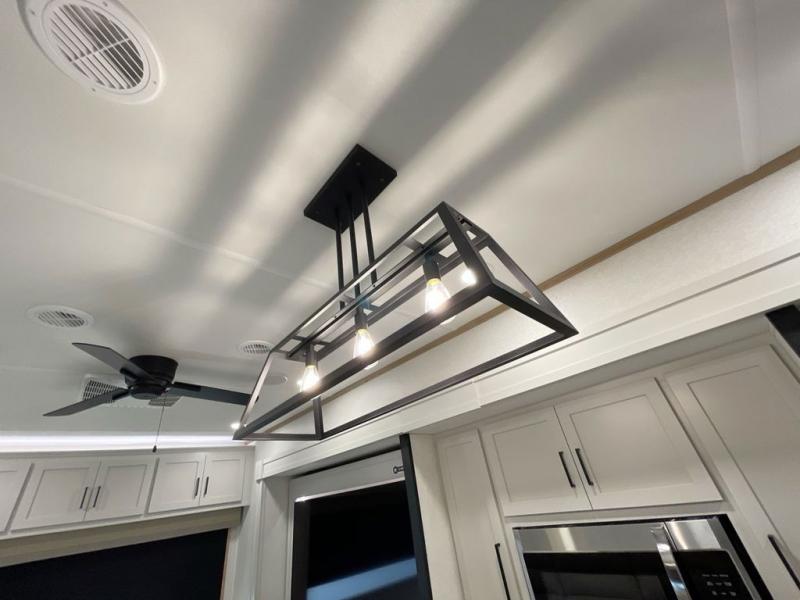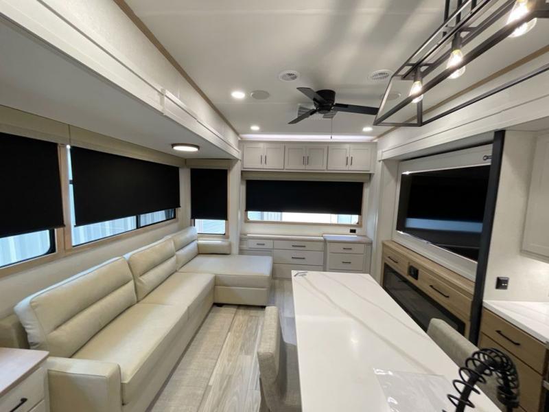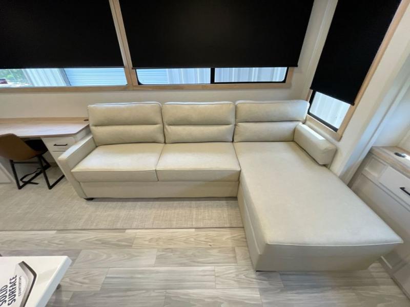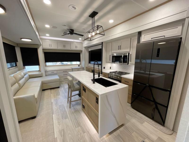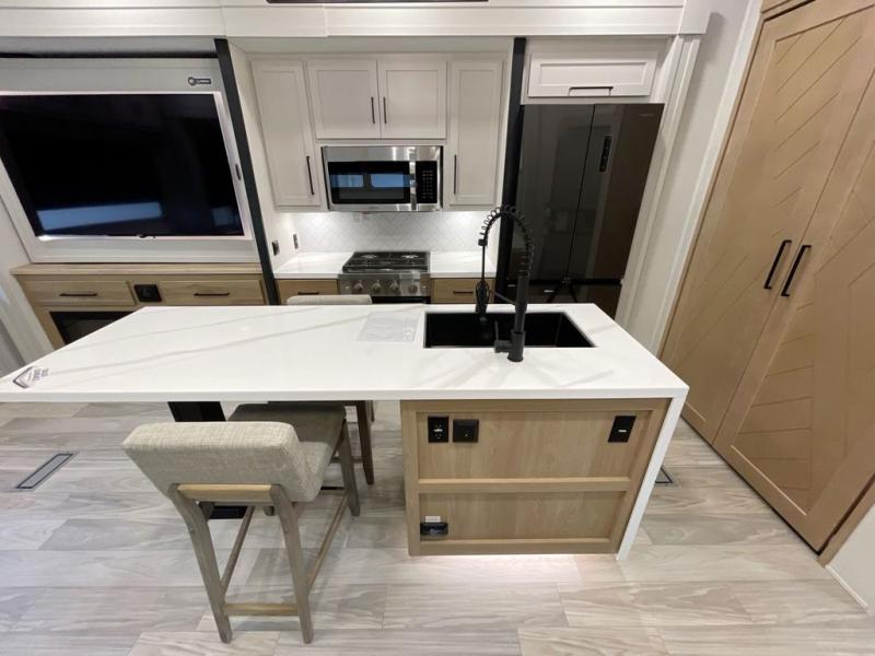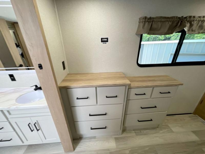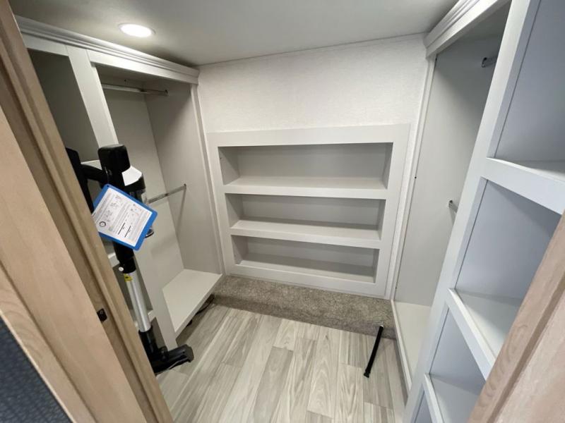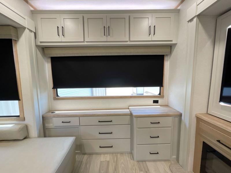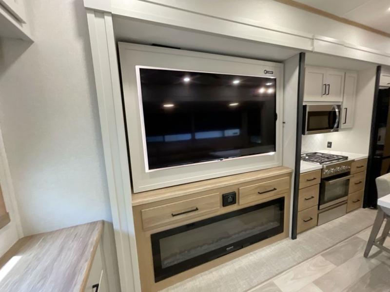 It will be easier than ever to enjoy camping trips in this triple slide out fifth wheel, or even go full-time! The combined kitchen and living area features dual opposing slides for ample space, an L-shaped sofa with a chaise lounge, and a fireplace with a hidden pantry behind for snacks! A desk with a chair and a USB port will provide a place to work if you need to send some emails, and the large kitchen island will give you ample room to prep dinner when you get hungry. There are also pendant lights here, along with a waterfall edge and barstools for dining space. The mid-coach half bath includes a toilet, sink, plus washer and dryer prep, giving you the option to make this the perfect laundry room! The master bedroom up front may be your favorite place to unwind in this unit. There is a king bed slide, a small dresser plus a tall dresser, and a TV hookup if you want the option to watch movies in bed. And you'll be wowed by the front master bedroom with its fiberglass shower with a seat, dual bath sinks, and large walk-in closet!