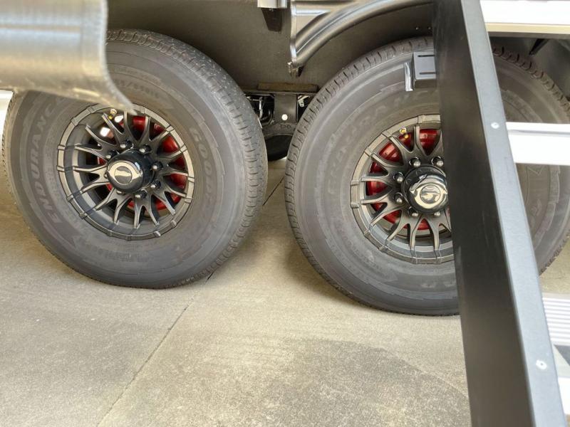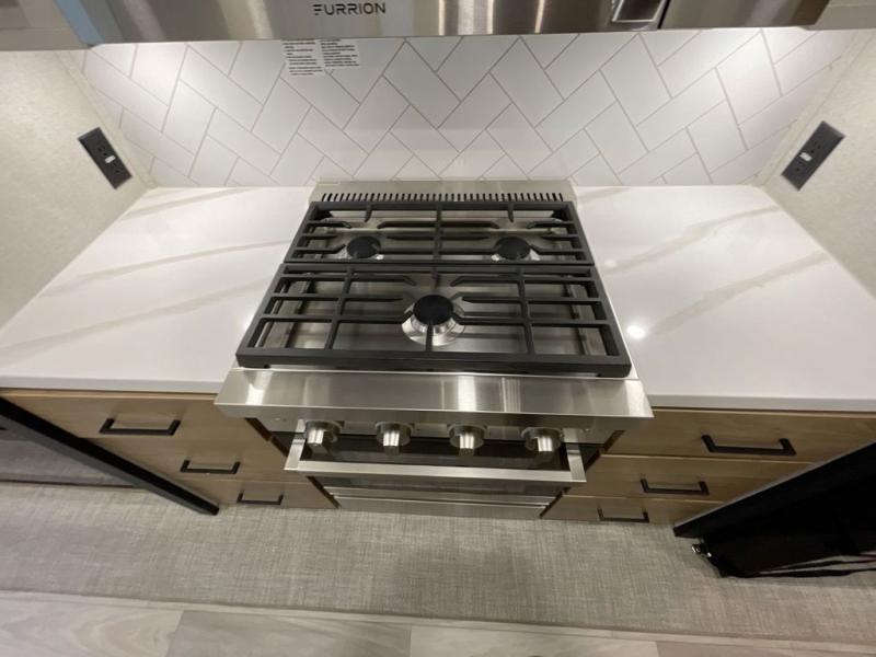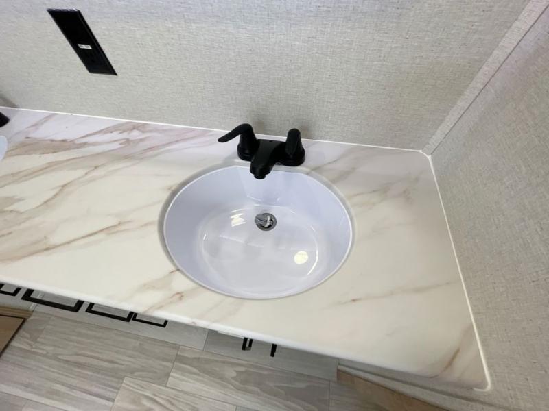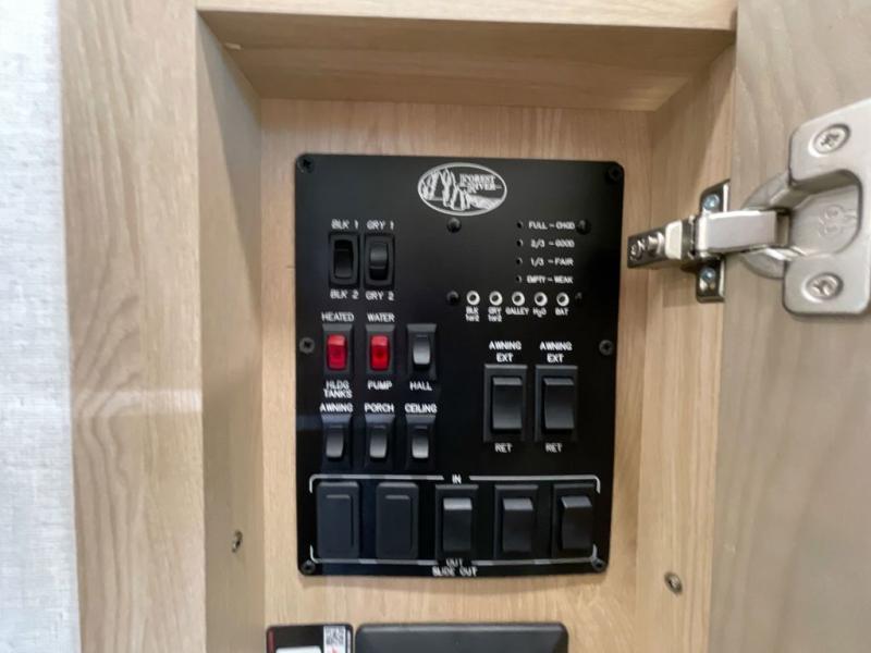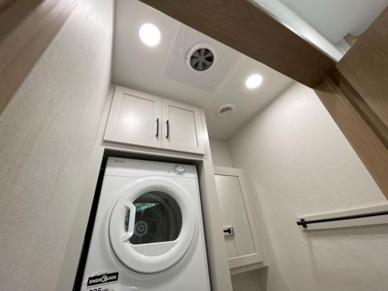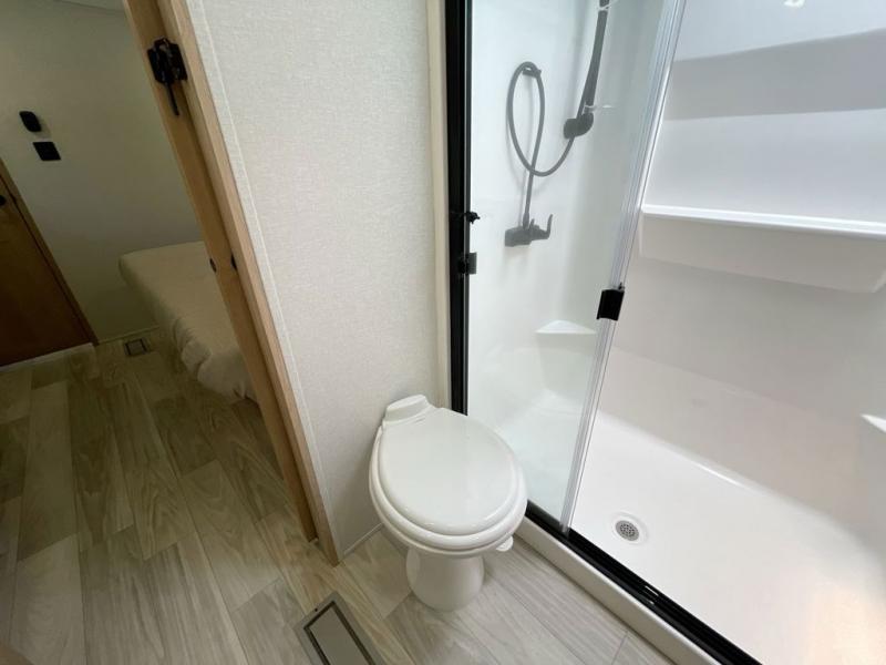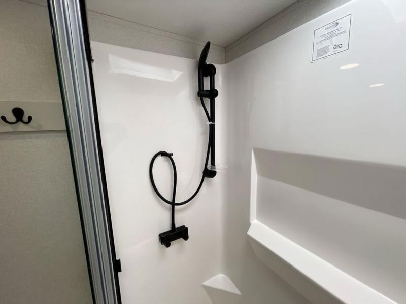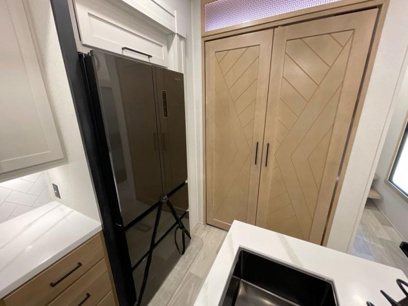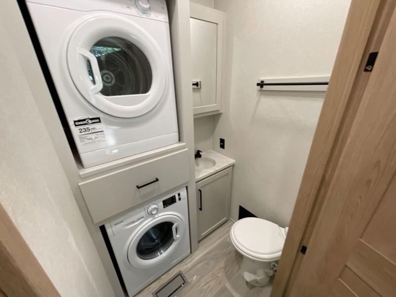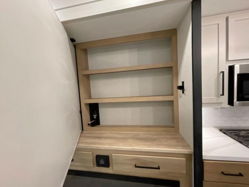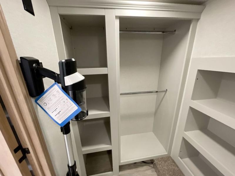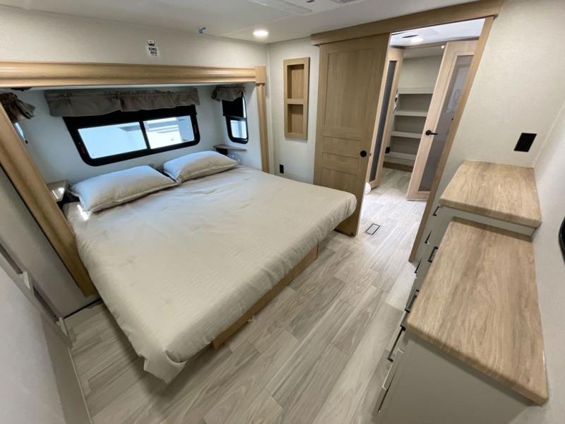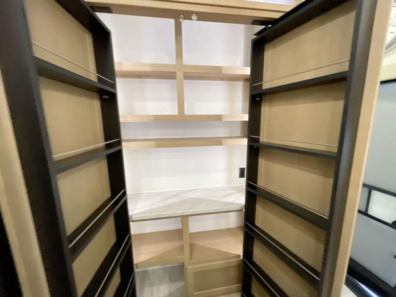 It will be easier than ever to enjoy camping trips in this triple slide out fifth wheel, or even go full-time! The combined kitchen and living area features dual opposing slides for ample space, an L-shaped sofa with a chaise lounge, and a fireplace with a hidden pantry behind for snacks! A desk with a chair and a USB port will provide a place to work if you need to send some emails, and the large kitchen island will give you ample room to prep dinner when you get hungry. There are also pendant lights here, along with a waterfall edge and barstools for dining space. The mid-coach half bath includes a toilet, sink, plus washer and dryer prep, giving you the option to make this the perfect laundry room! The master bedroom up front may be your favorite place to unwind in this unit. There is a king bed slide, a small dresser plus a tall dresser, and a TV hookup if you want the option to watch movies in bed. And you'll be wowed by the front master bedroom with its fiberglass shower with a seat, dual bath sinks, and large walk-in closet!