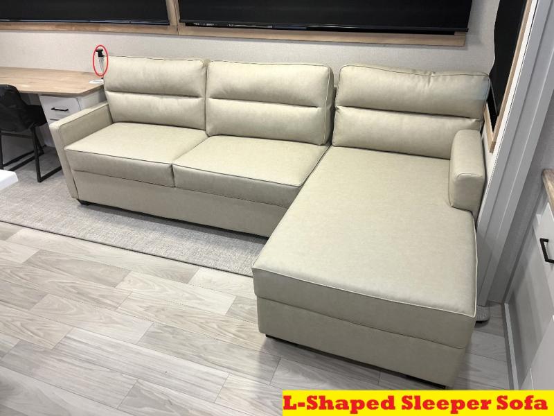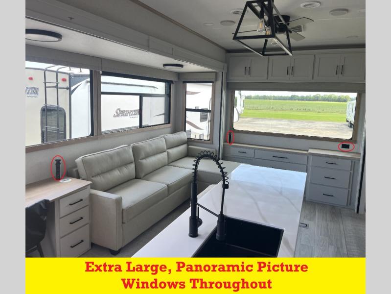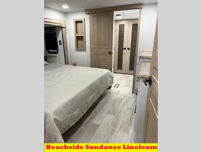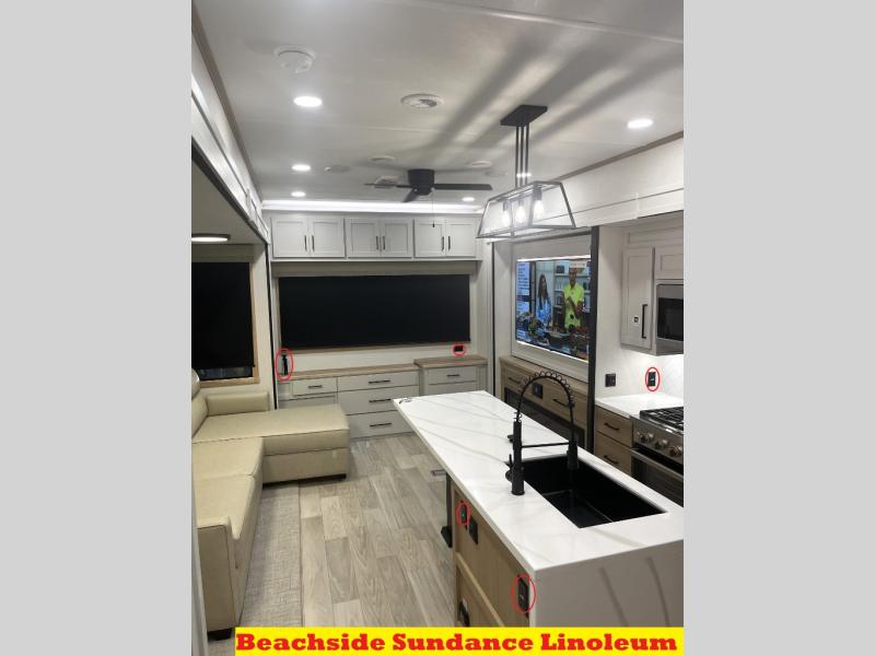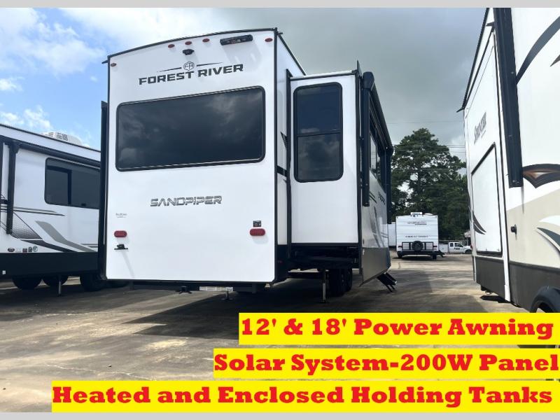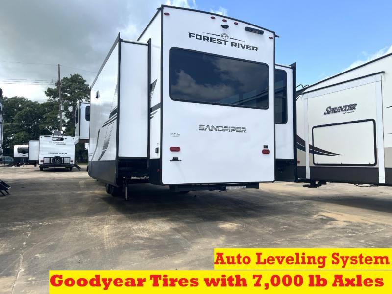 You will find the perfect balance of size, space, features, and luxury with any one of these Forest River Sandpiper fifth wheels! They are constructed with a welded aluminum framed vacuum bonded laminated superstructure, a cambered powder coated frame with rust prohibitor, and a fully enclosed underbelly for added protection against the elements. The large tinted windows come with a 80/20 UV prohibitor or you can choose the optional dual pane windows. Some hassle-free amenities include a 60k BTU on-demand water heater, full coach water filter system, tire pressure monitor system, and an electric leveling system! Inside, you'll enjoy stainless steel appliances, solid surface countertops, Beachside Sundance linoleum, recessed residential lighting, and many more comforts!