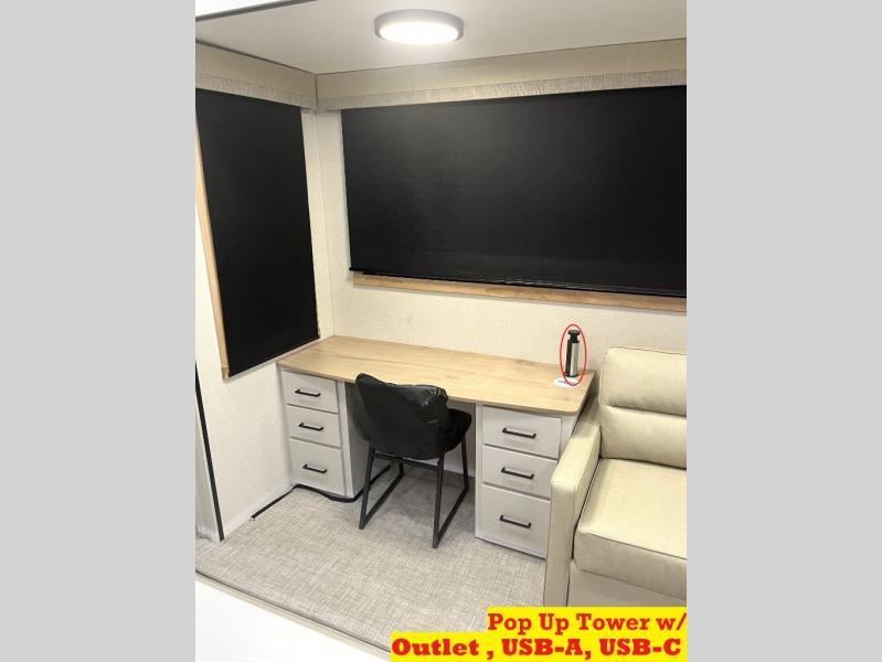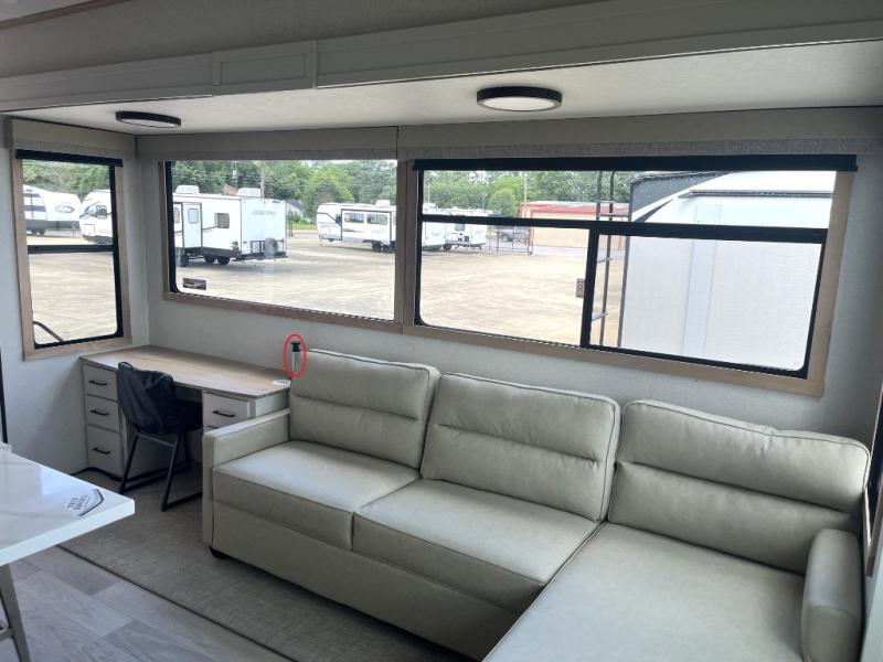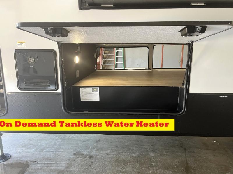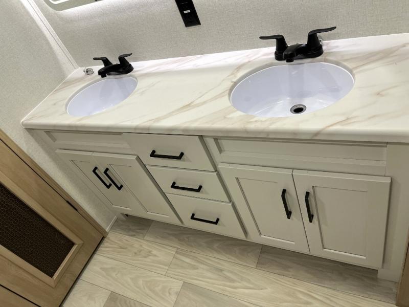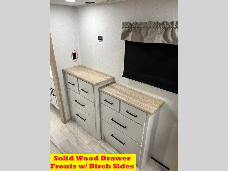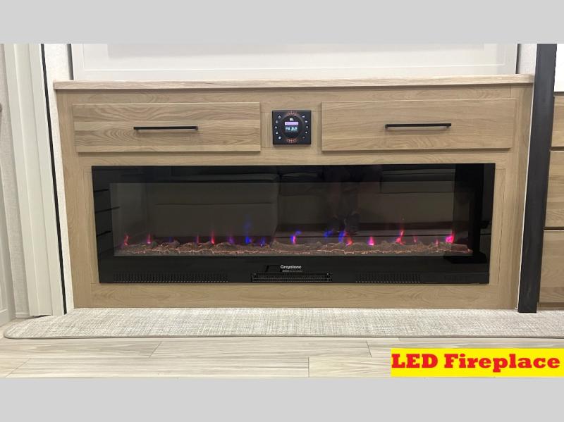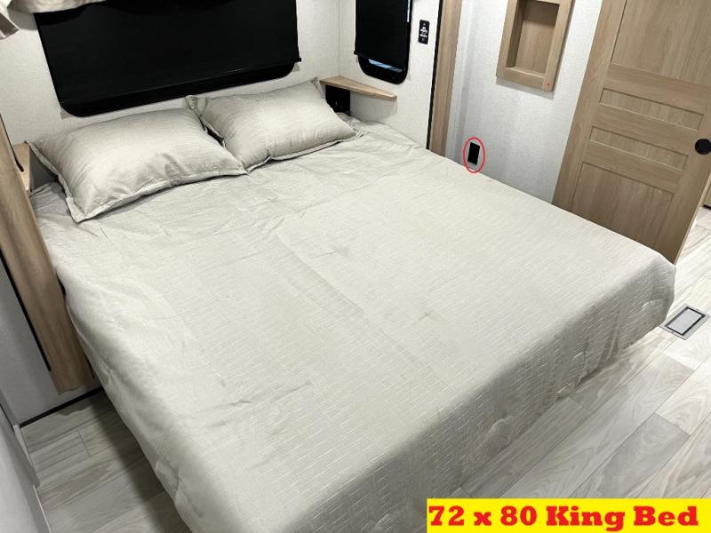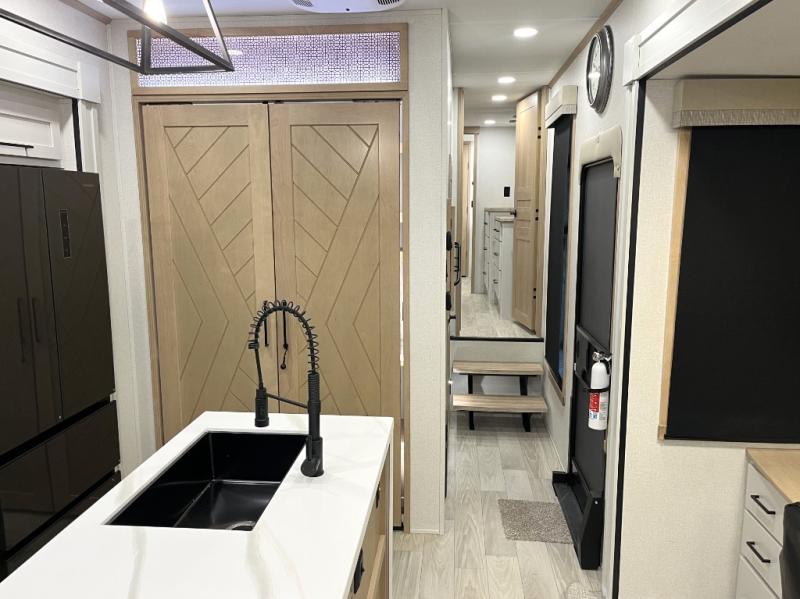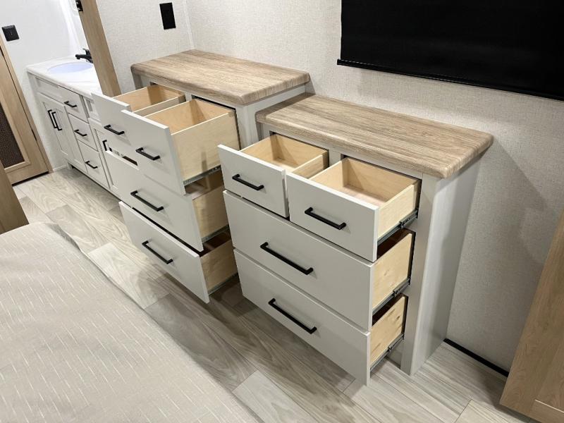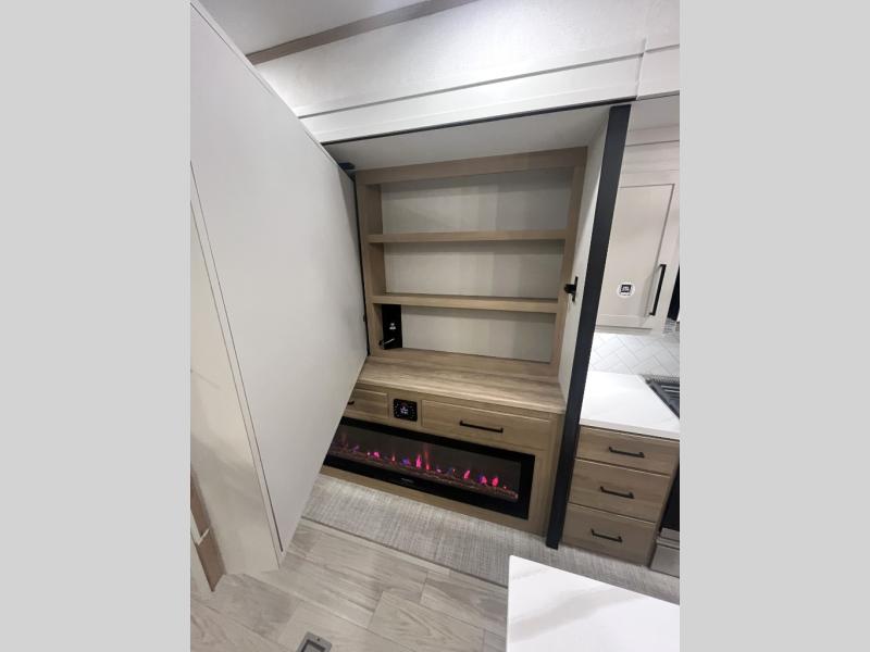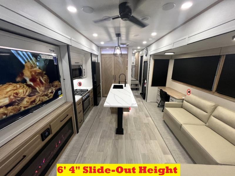 It will be easier than ever to enjoy camping trips in this triple slide out fifth wheel, or even go full-time! The combined kitchen and living area features dual opposing slides for ample space, an L-shaped sofa with a chaise lounge, and a fireplace with a hidden pantry behind for snacks! A desk with a chair and a USB port will provide a place to work if you need to send some emails, and the large kitchen island will give you ample room to prep dinner when you get hungry. There are also pendant lights here, along with a waterfall edge and barstools for dining space. The mid-coach half bath includes a toilet, sink, plus washer and dryer prep, giving you the option to make this the perfect laundry room! The master bedroom up front may be your favorite place to unwind in this unit. There is a king bed slide, a small dresser plus a tall dresser, and a TV hookup if you want the option to watch movies in bed. And you'll be wowed by the front master bedroom with its fiberglass shower with a seat, dual bath sinks, and large walk-in closet!