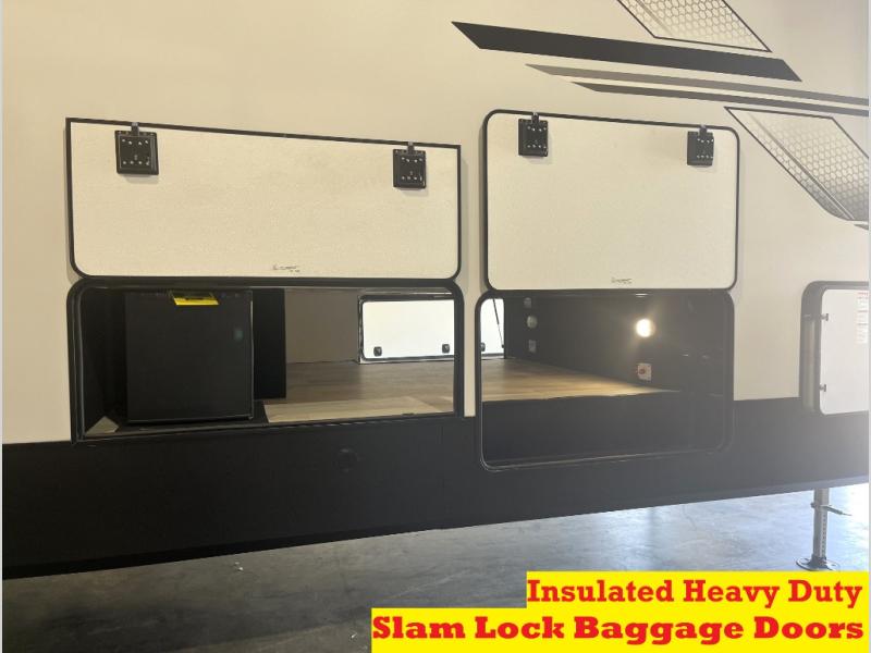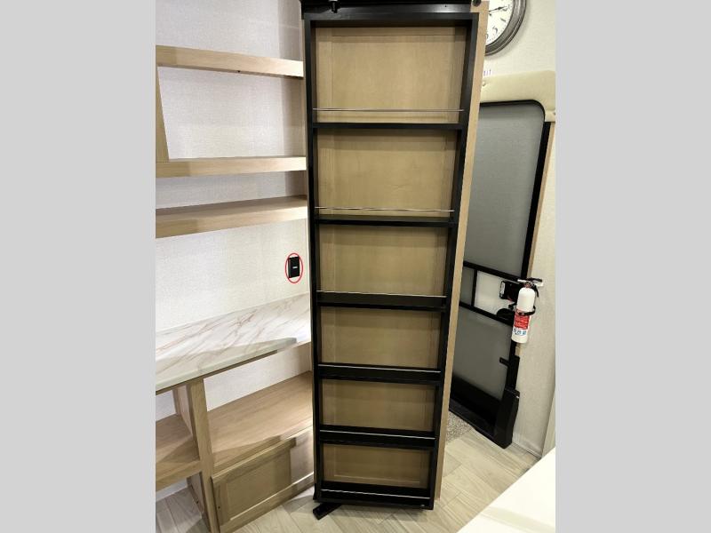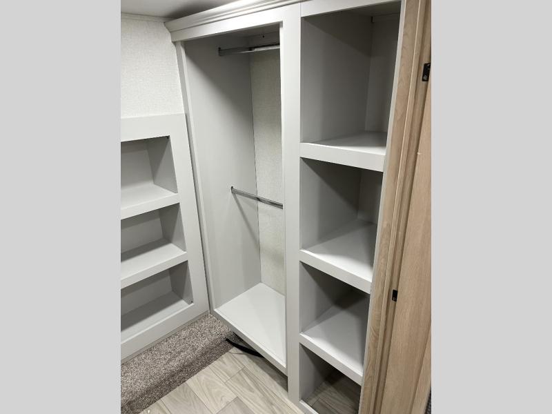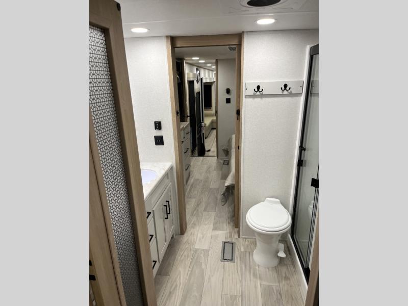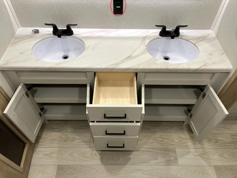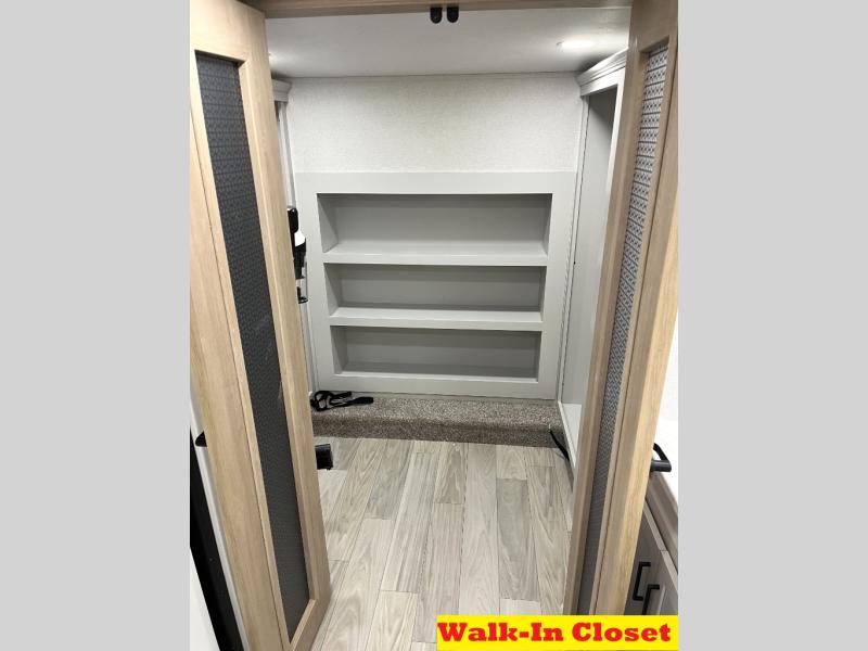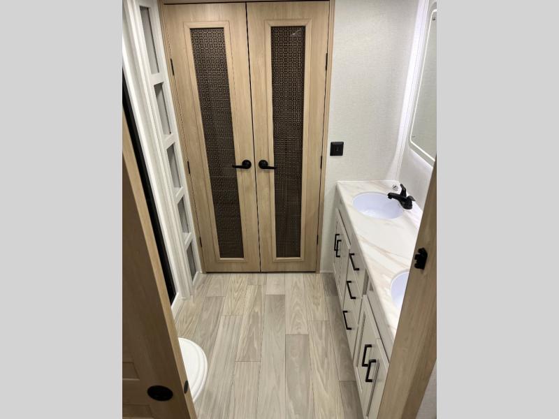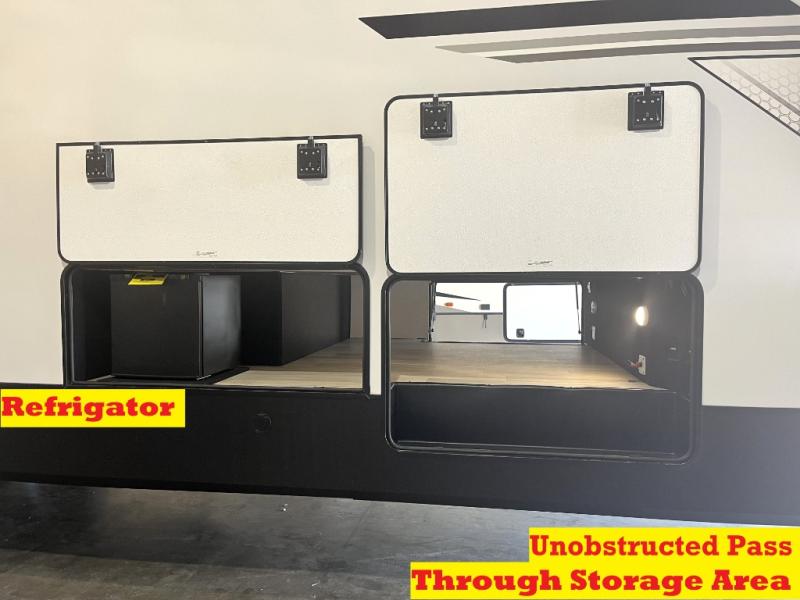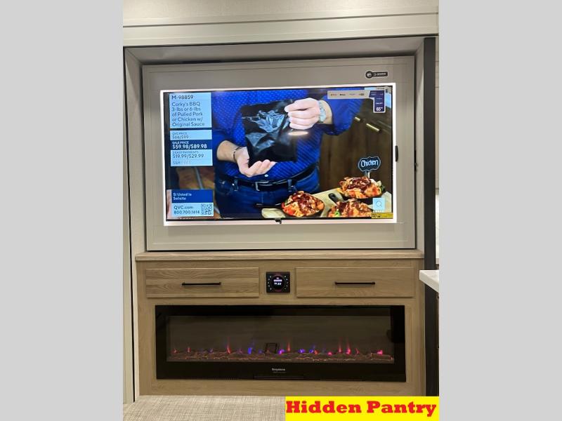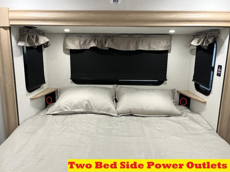 It will be easier than ever to enjoy camping trips in this triple slide out fifth wheel, or even go full-time! The combined kitchen and living area features dual opposing slides for ample space, an L-shaped sofa with a chaise lounge, and a fireplace with a hidden pantry behind for snacks! A desk with a chair and a USB port will provide a place to work if you need to send some emails, and the large kitchen island will give you ample room to prep dinner when you get hungry. There are also pendant lights here, along with a waterfall edge and barstools for dining space. The mid-coach half bath includes a toilet, sink, plus washer and dryer prep, giving you the option to make this the perfect laundry room! The master bedroom up front may be your favorite place to unwind in this unit. There is a king bed slide, a small dresser plus a tall dresser, and a TV hookup if you want the option to watch movies in bed. And you'll be wowed by the front master bedroom with its fiberglass shower with a seat, dual bath sinks, and large walk-in closet!