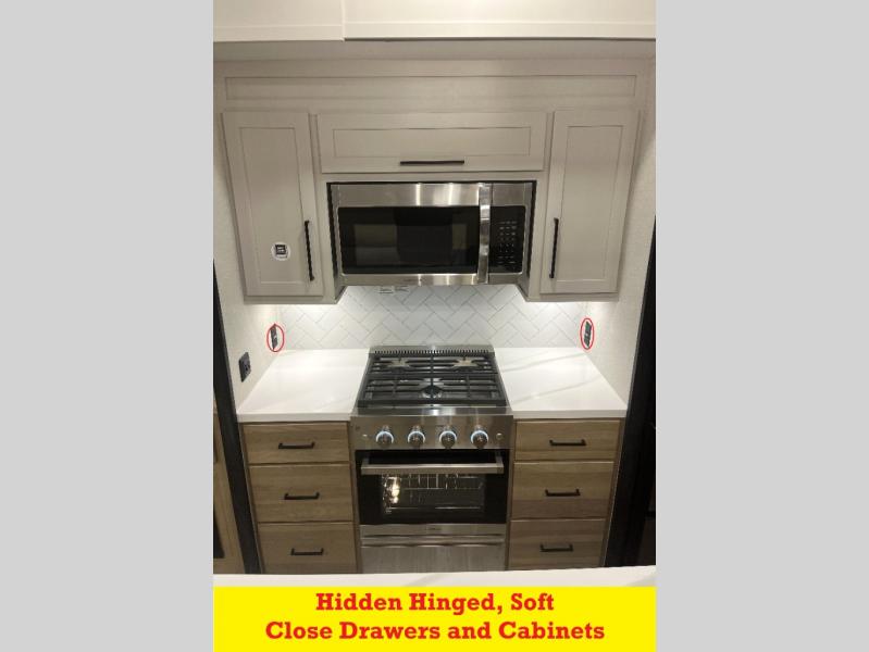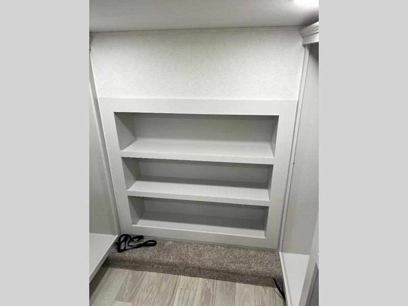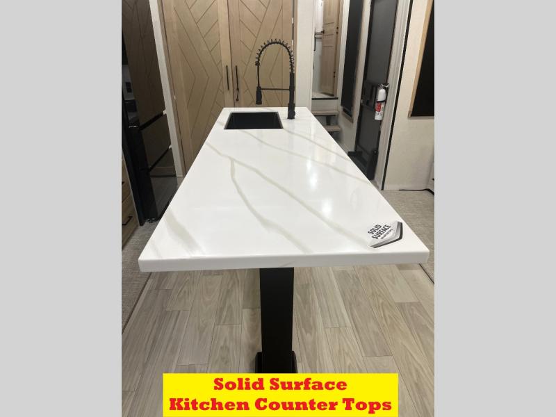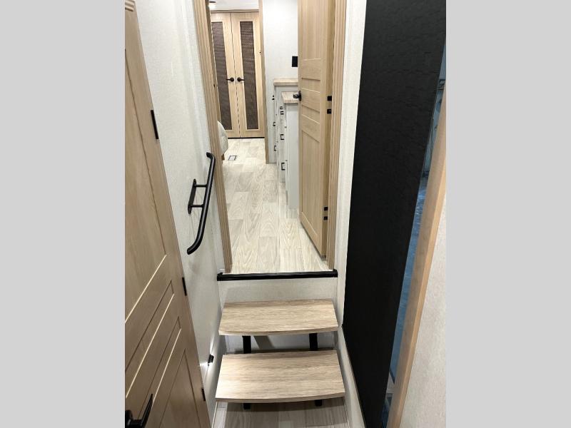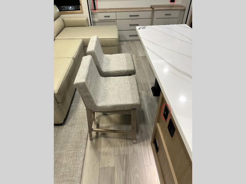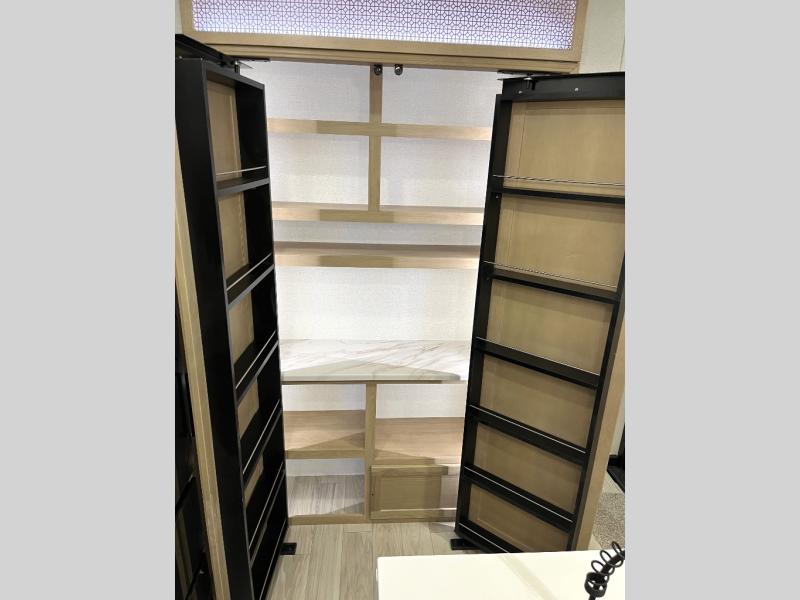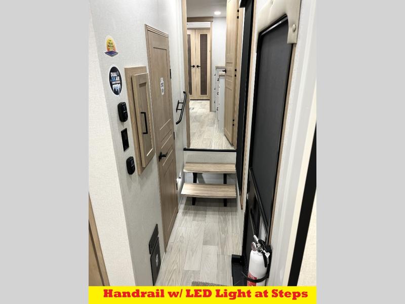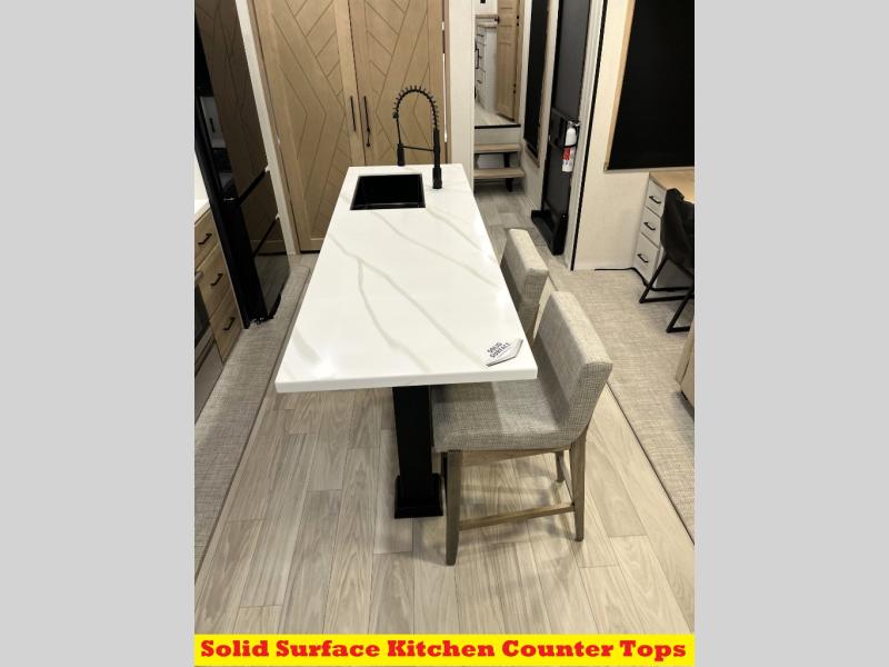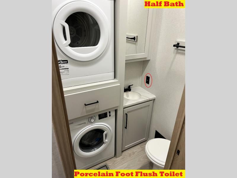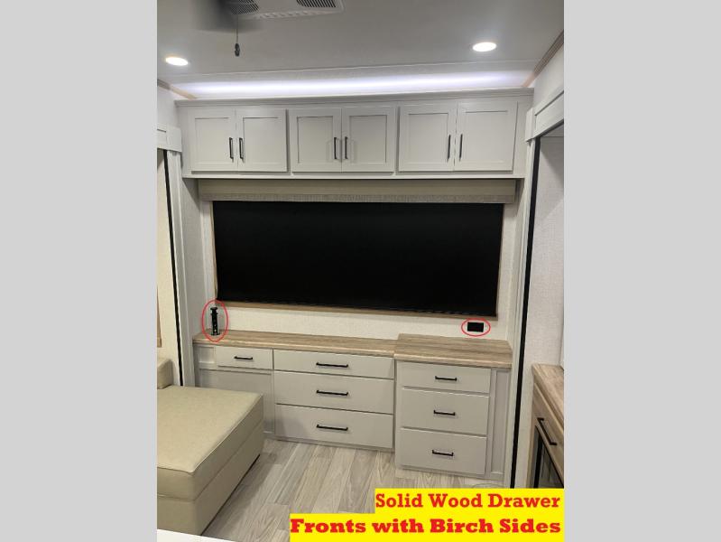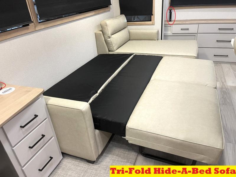 It will be easier than ever to enjoy camping trips in this triple slide out fifth wheel, or even go full-time! The combined kitchen and living area features dual opposing slides for ample space, an L-shaped sofa with a chaise lounge, and a fireplace with a hidden pantry behind for snacks! A desk with a chair and a USB port will provide a place to work if you need to send some emails, and the large kitchen island will give you ample room to prep dinner when you get hungry. There are also pendant lights here, along with a waterfall edge and barstools for dining space. The mid-coach half bath includes a toilet, sink, plus washer and dryer prep, giving you the option to make this the perfect laundry room! The master bedroom up front may be your favorite place to unwind in this unit. There is a king bed slide, a small dresser plus a tall dresser, and a TV hookup if you want the option to watch movies in bed. And you'll be wowed by the front master bedroom with its fiberglass shower with a seat, dual bath sinks, and large walk-in closet!