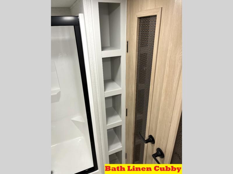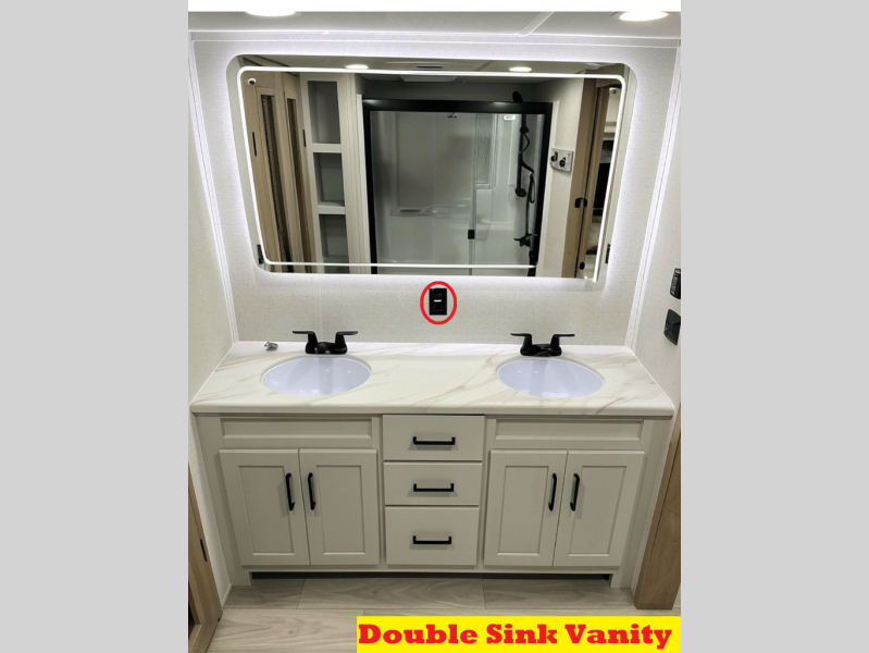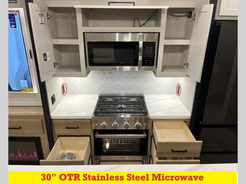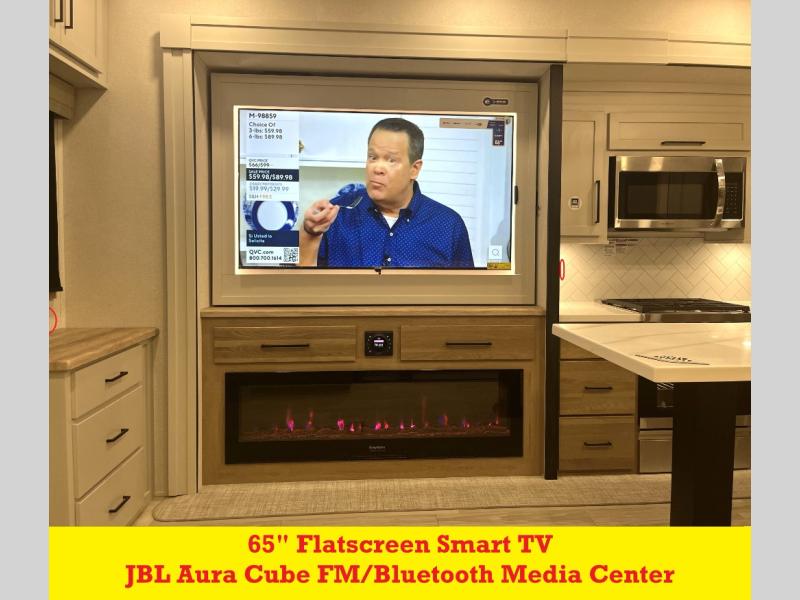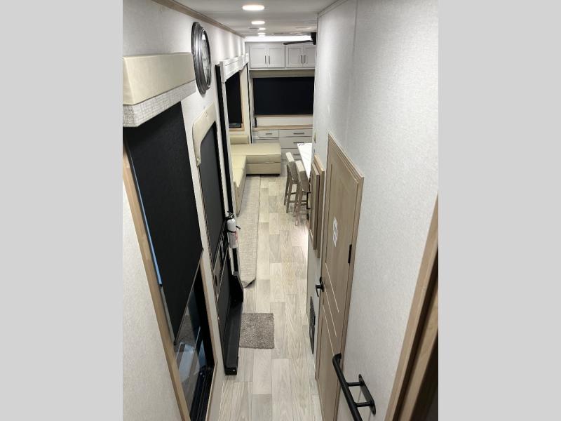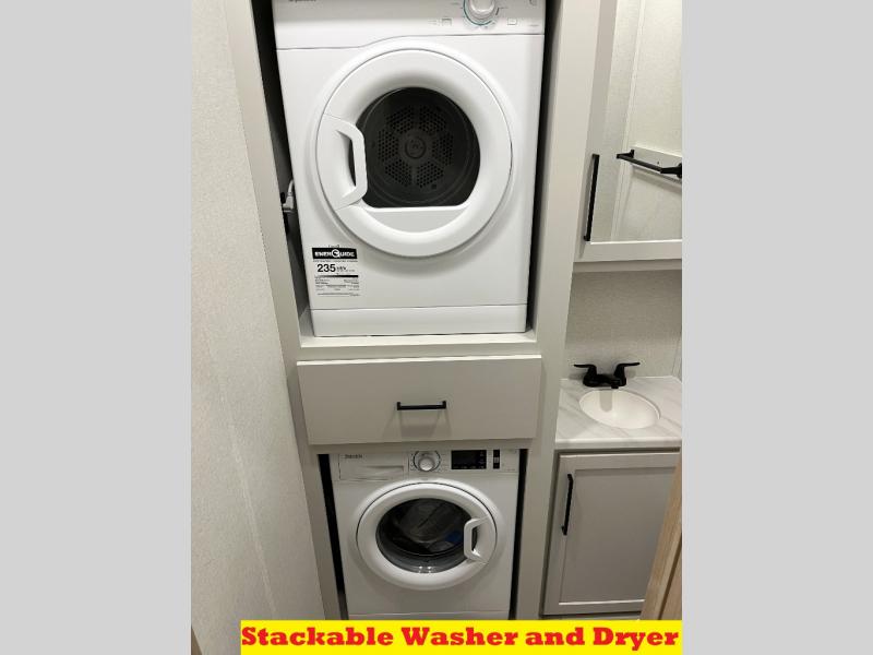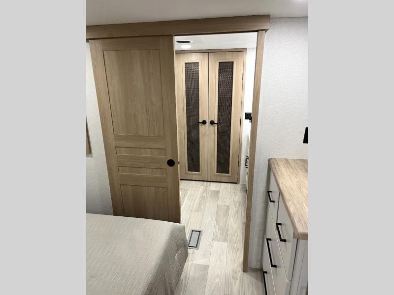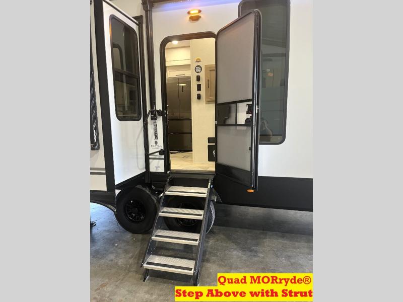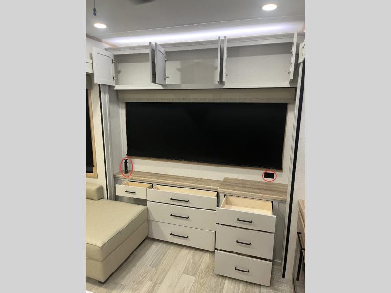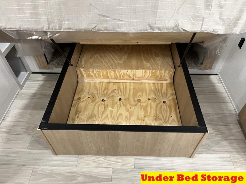 It will be easier than ever to enjoy camping trips in this triple slide out fifth wheel, or even go full-time! The combined kitchen and living area features dual opposing slides for ample space, an L-shaped sofa with a chaise lounge, and a fireplace with a hidden pantry behind for snacks! A desk with a chair and a USB port will provide a place to work if you need to send some emails, and the large kitchen island will give you ample room to prep dinner when you get hungry. There are also pendant lights here, along with a waterfall edge and barstools for dining space. The mid-coach half bath includes a toilet, sink, plus washer and dryer prep, giving you the option to make this the perfect laundry room! The master bedroom up front may be your favorite place to unwind in this unit. There is a king bed slide, a small dresser plus a tall dresser, and a TV hookup if you want the option to watch movies in bed. And you'll be wowed by the front master bedroom with its fiberglass shower with a seat, dual bath sinks, and large walk-in closet!