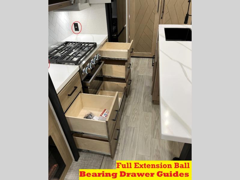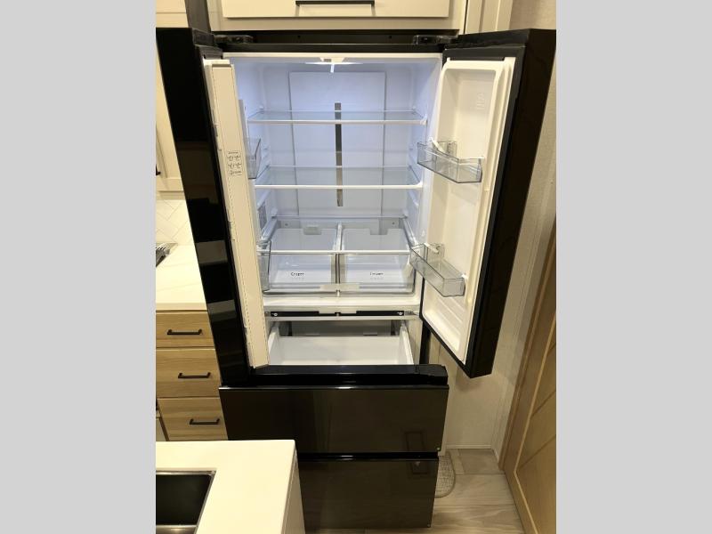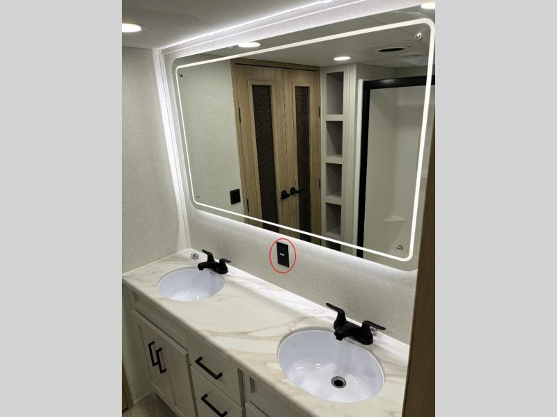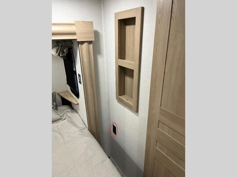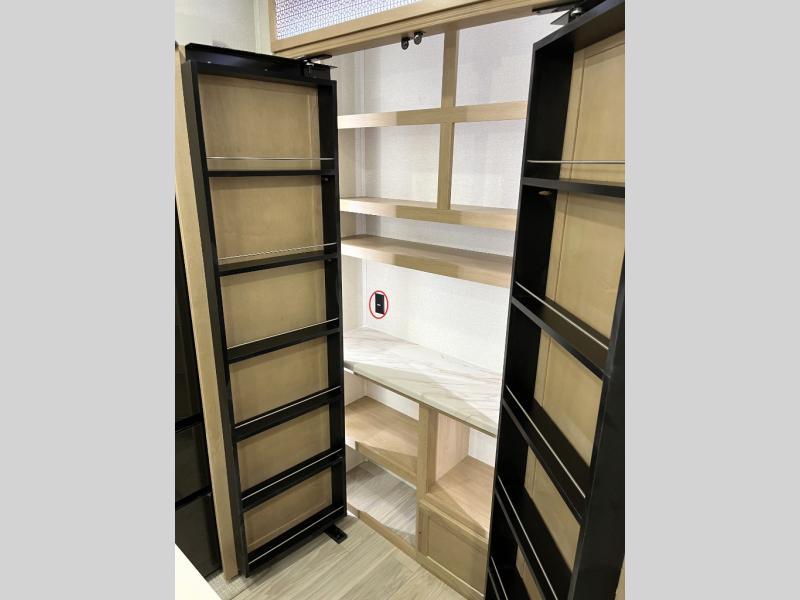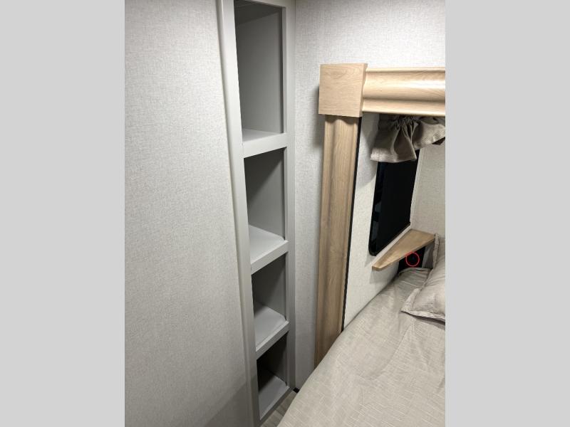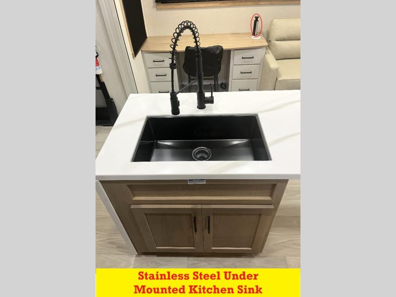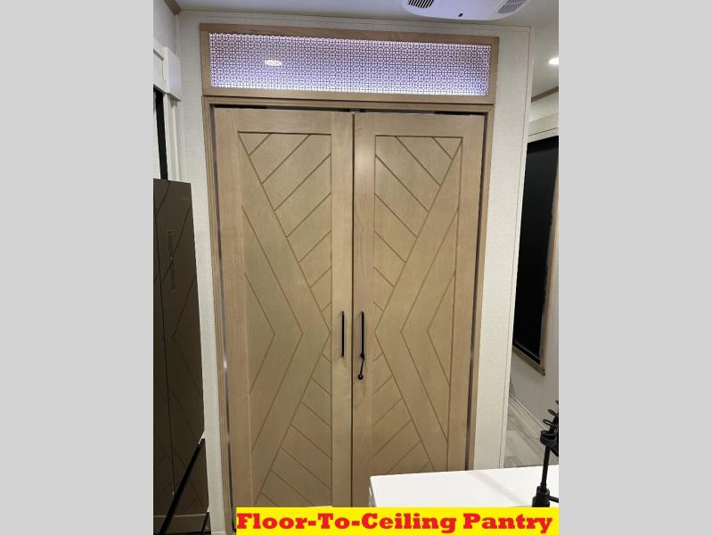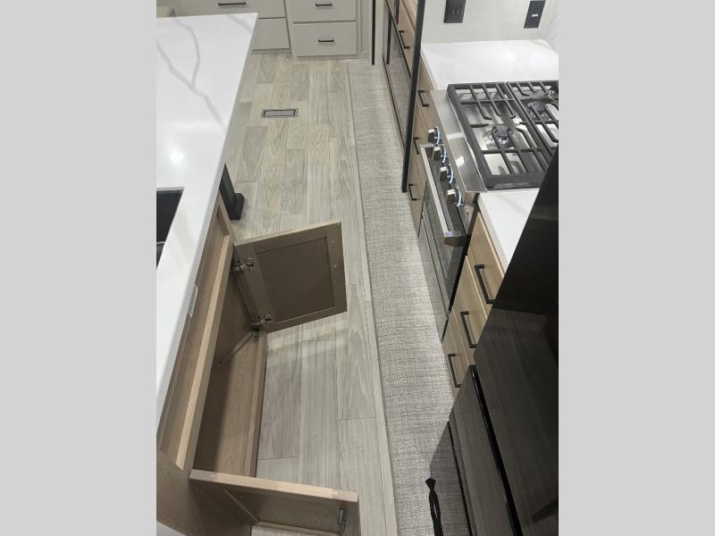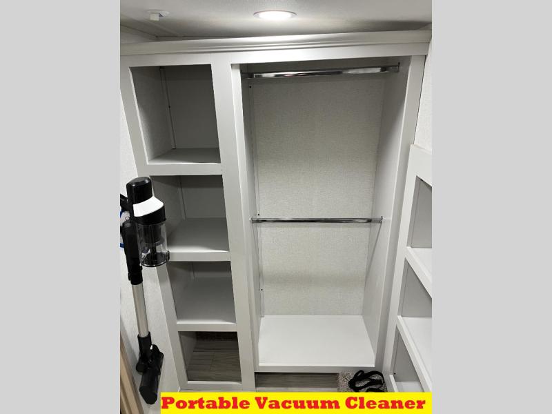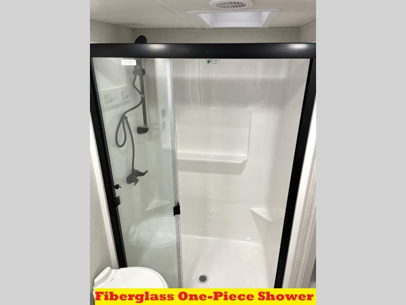 It will be easier than ever to enjoy camping trips in this triple slide out fifth wheel, or even go full-time! The combined kitchen and living area features dual opposing slides for ample space, an L-shaped sofa with a chaise lounge, and a fireplace with a hidden pantry behind for snacks! A desk with a chair and a USB port will provide a place to work if you need to send some emails, and the large kitchen island will give you ample room to prep dinner when you get hungry. There are also pendant lights here, along with a waterfall edge and barstools for dining space. The mid-coach half bath includes a toilet, sink, plus washer and dryer prep, giving you the option to make this the perfect laundry room! The master bedroom up front may be your favorite place to unwind in this unit. There is a king bed slide, a small dresser plus a tall dresser, and a TV hookup if you want the option to watch movies in bed. And you'll be wowed by the front master bedroom with its fiberglass shower with a seat, dual bath sinks, and large walk-in closet!