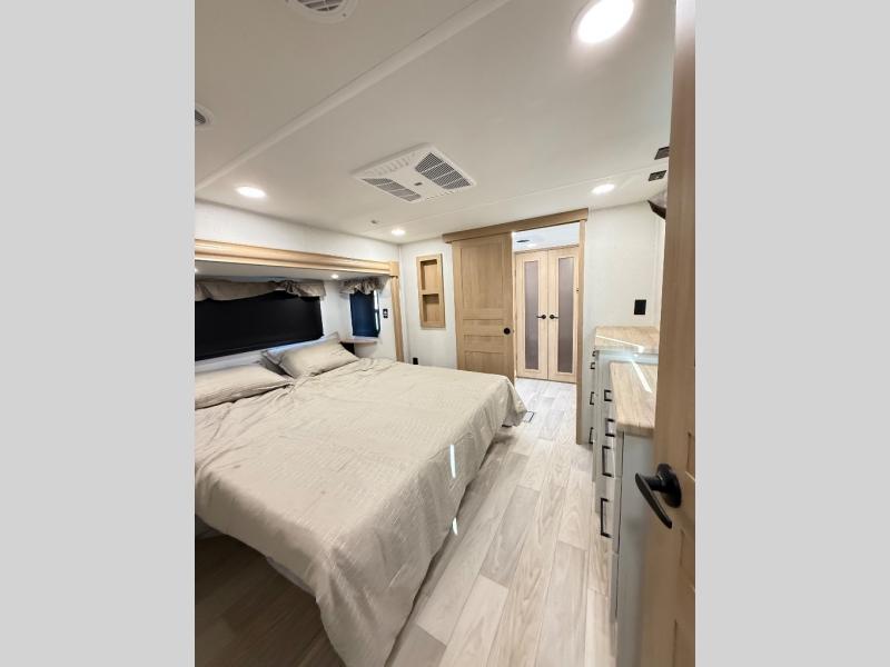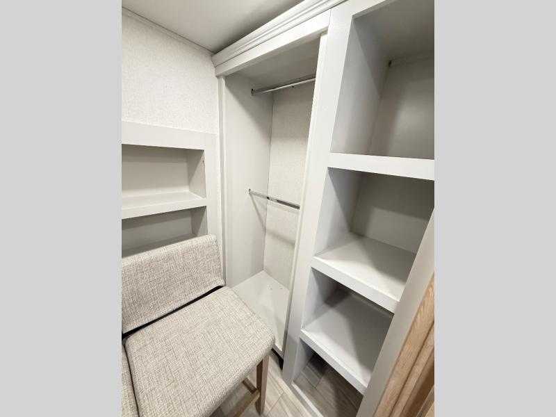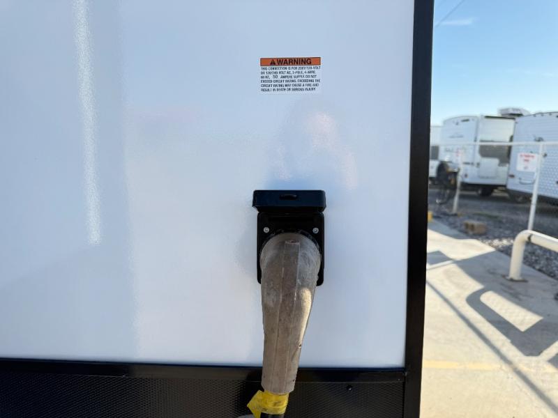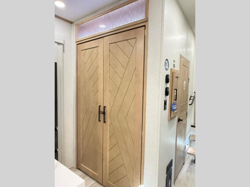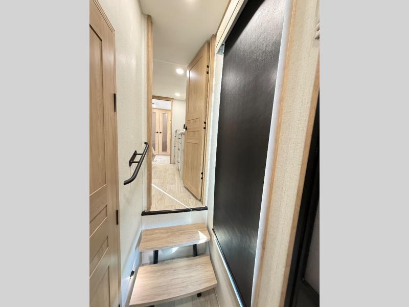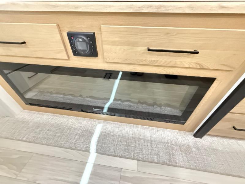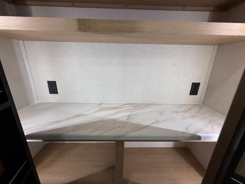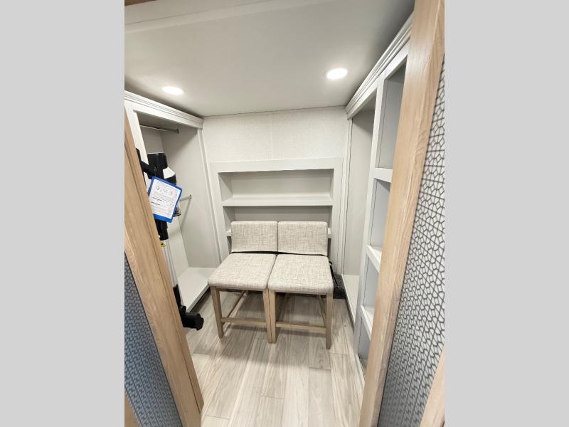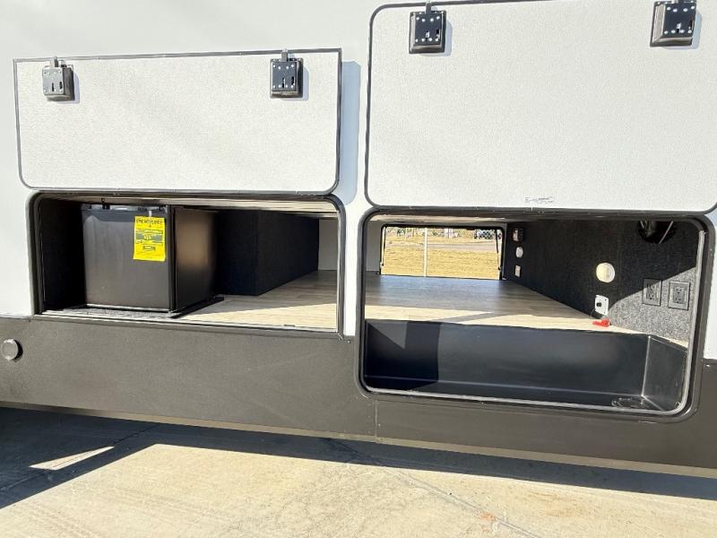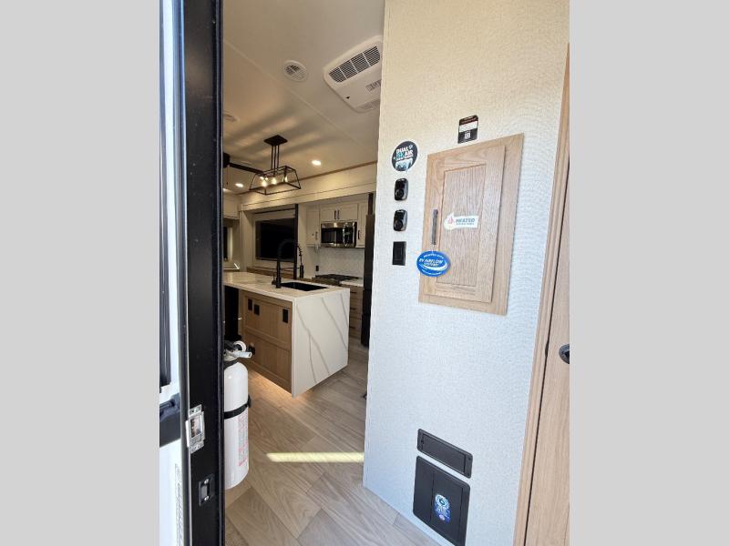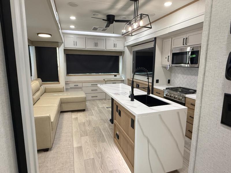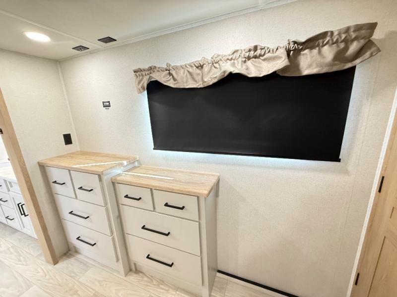 This fifth wheel is perfect for those seeking a comfortable, feature-rich home on wheels. Upon entering, you'll find a spacious rear living room, ideal for relaxation and entertainment. The room features a comfortable chaise lounge, sofa, and an entertainment center with a cozy fireplace. For added convenience, there's a hidden pantry, desk with a chair, and a shelf and cabinet for storage. The kitchen is well-appointed with a stylish kitchen island featuring a beautiful waterfall edge. Overhead cabinets provide ample storage, while the microwave and 12V refrigerator allow for easy meal prep. Plus, a butler pantry offers additional storage for kitchen essentials. A convenient half bath is located nearby, complete with a stackable washer and dryer prep if you want the option to add these appliances. The bedroom retreat features a comfortable king bed, a small dresser, and a tall dresser with a TV hookup. The adjacent walk-in bathroom closet boasts a one-piece fiberglass shower, dual sink, medicine cabinet, linen closet, and ample storage thanks to the various shelves, perfect for keeping your belongings organized. Exterior features include two awnings, one 12’ and the other 18’, providing ample shade and protection.