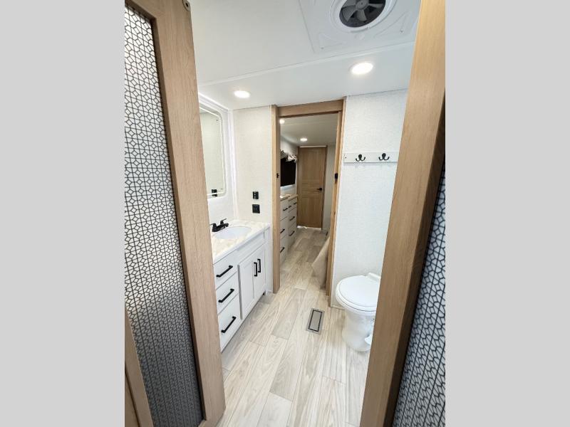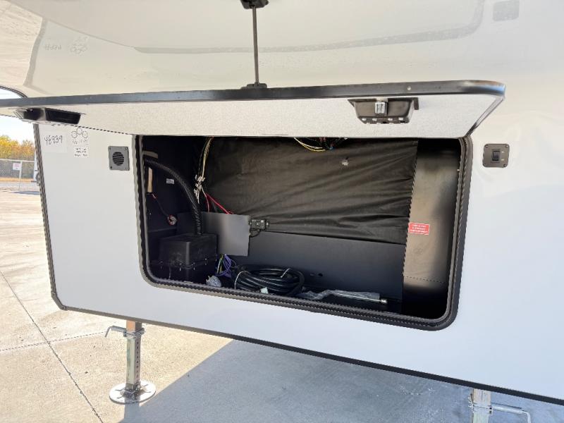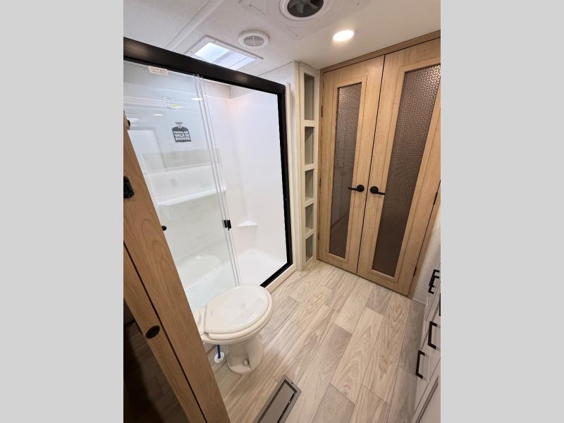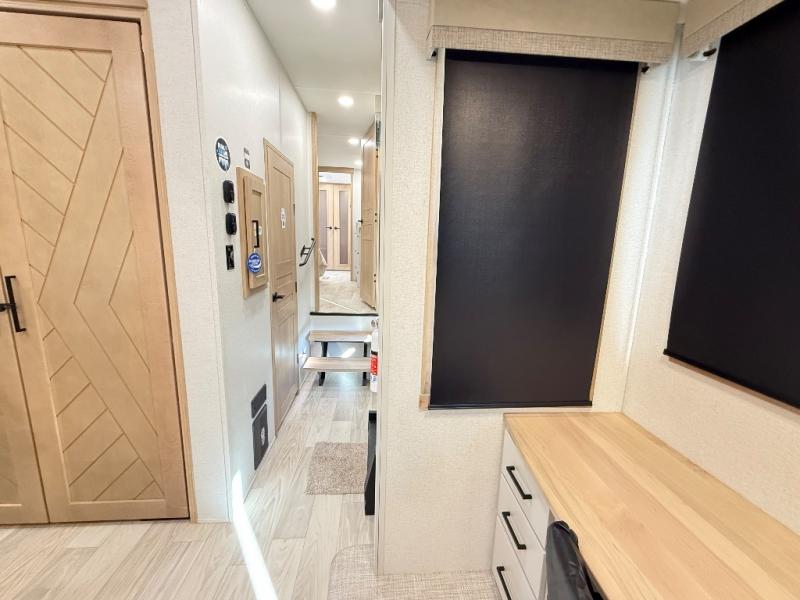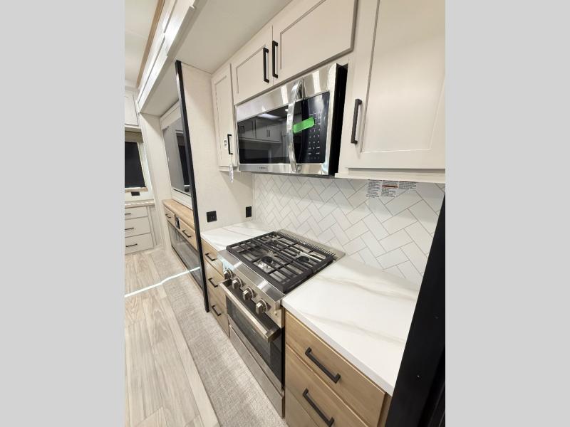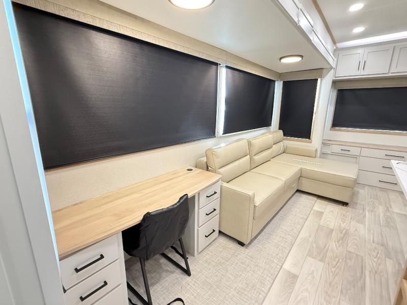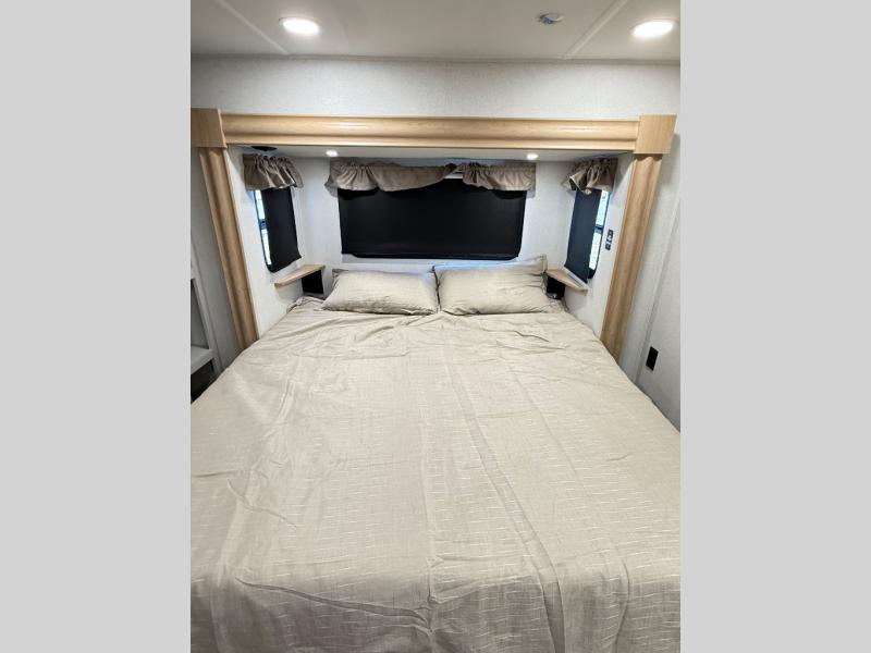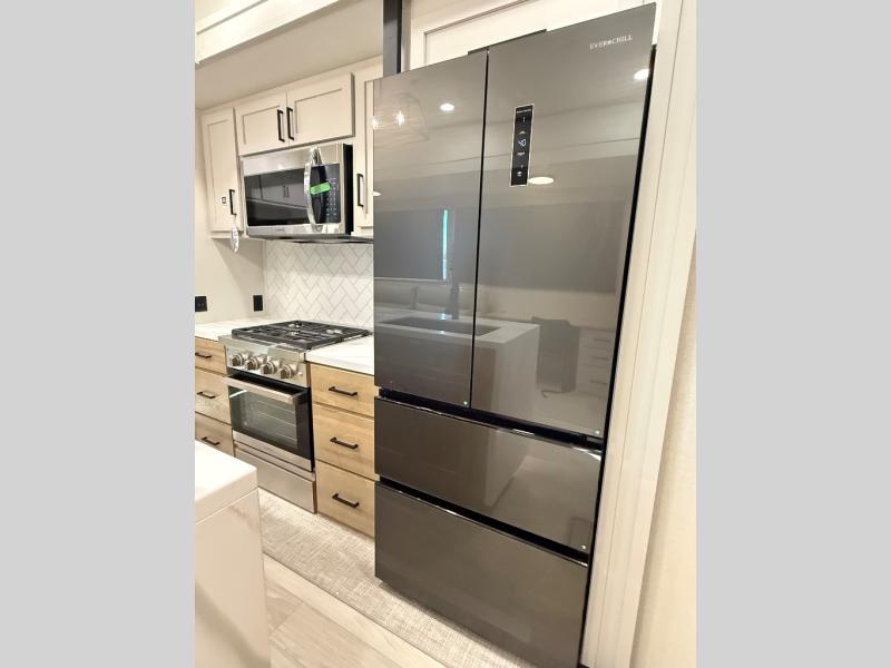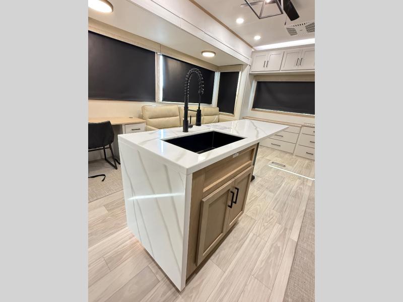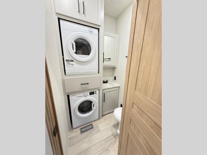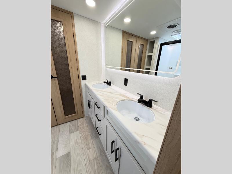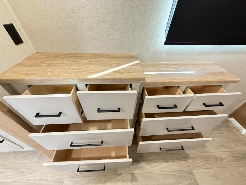 This fifth wheel is perfect for those seeking a comfortable, feature-rich home on wheels. Upon entering, you'll find a spacious rear living room, ideal for relaxation and entertainment. The room features a comfortable chaise lounge, sofa, and an entertainment center with a cozy fireplace. For added convenience, there's a hidden pantry, desk with a chair, and a shelf and cabinet for storage. The kitchen is well-appointed with a stylish kitchen island featuring a beautiful waterfall edge. Overhead cabinets provide ample storage, while the microwave and 12V refrigerator allow for easy meal prep. Plus, a butler pantry offers additional storage for kitchen essentials. A convenient half bath is located nearby, complete with a stackable washer and dryer prep if you want the option to add these appliances. The bedroom retreat features a comfortable king bed, a small dresser, and a tall dresser with a TV hookup. The adjacent walk-in bathroom closet boasts a one-piece fiberglass shower, dual sink, medicine cabinet, linen closet, and ample storage thanks to the various shelves, perfect for keeping your belongings organized. Exterior features include two awnings, one 12’ and the other 18’, providing ample shade and protection.
