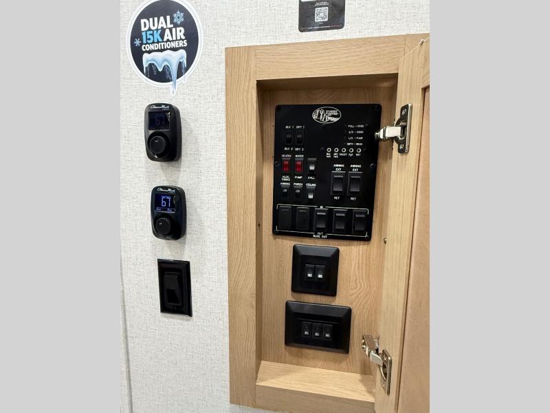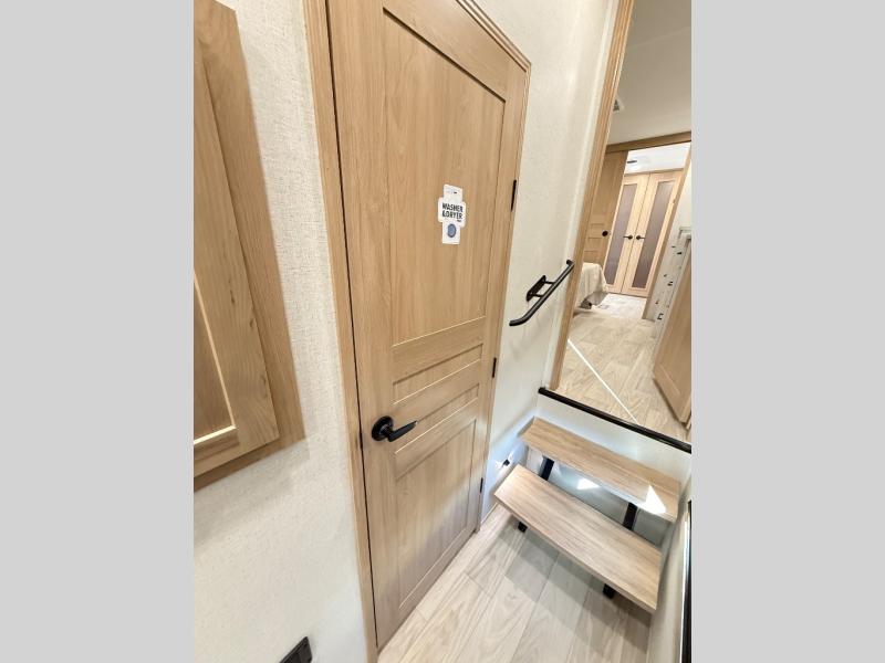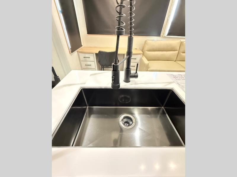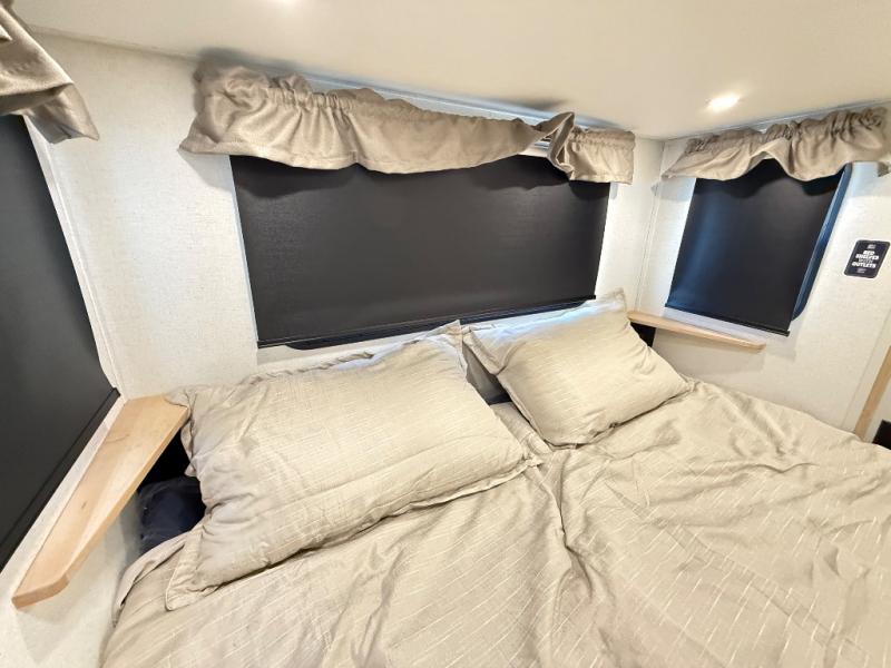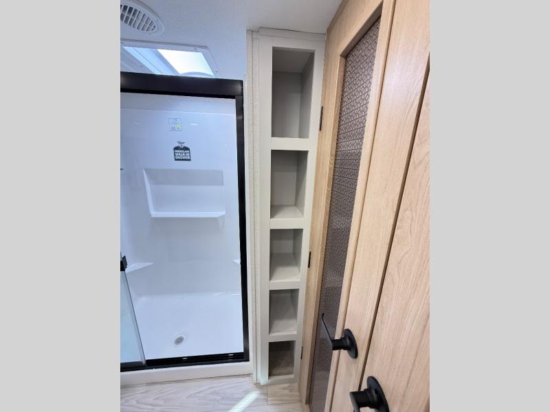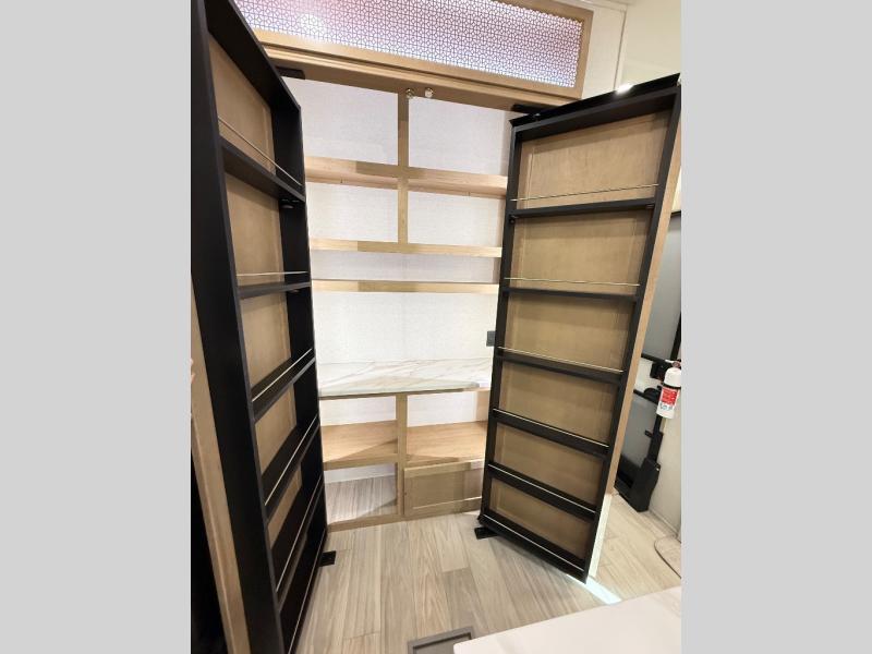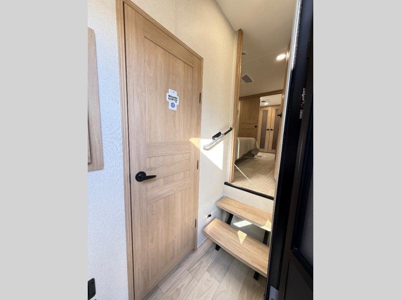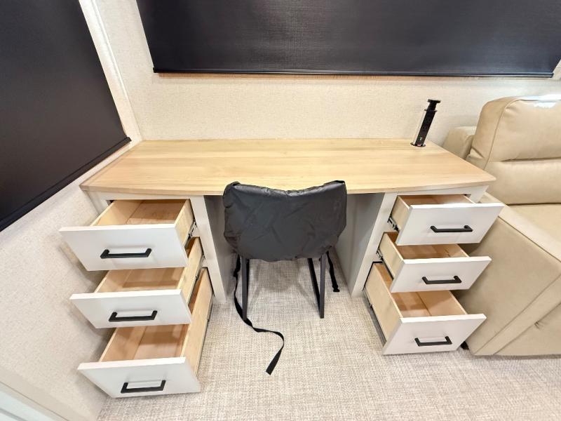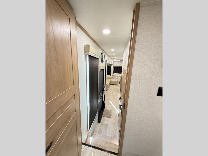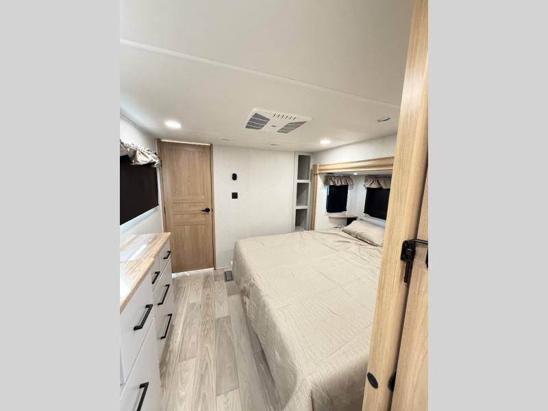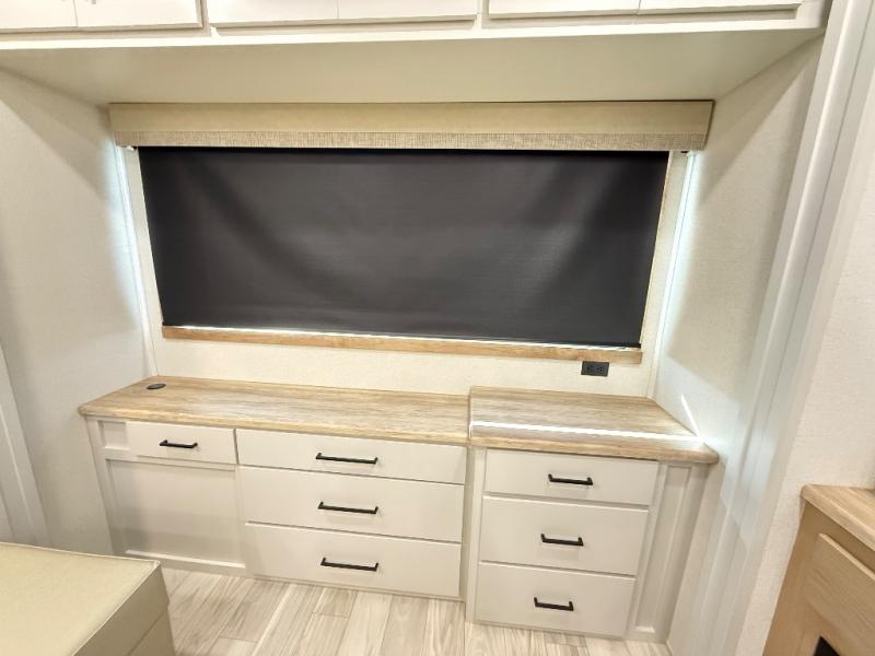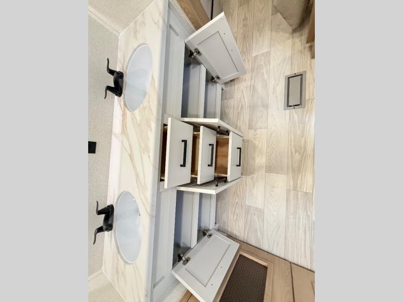 This fifth wheel is perfect for those seeking a comfortable, feature-rich home on wheels. Upon entering, you'll find a spacious rear living room, ideal for relaxation and entertainment. The room features a comfortable chaise lounge, sofa, and an entertainment center with a cozy fireplace. For added convenience, there's a hidden pantry, desk with a chair, and a shelf and cabinet for storage. The kitchen is well-appointed with a stylish kitchen island featuring a beautiful waterfall edge. Overhead cabinets provide ample storage, while the microwave and 12V refrigerator allow for easy meal prep. Plus, a butler pantry offers additional storage for kitchen essentials. A convenient half bath is located nearby, complete with a stackable washer and dryer prep if you want the option to add these appliances. The bedroom retreat features a comfortable king bed, a small dresser, and a tall dresser with a TV hookup. The adjacent walk-in bathroom closet boasts a one-piece fiberglass shower, dual sink, medicine cabinet, linen closet, and ample storage thanks to the various shelves, perfect for keeping your belongings organized. Exterior features include two awnings, one 12’ and the other 18’, providing ample shade and protection.