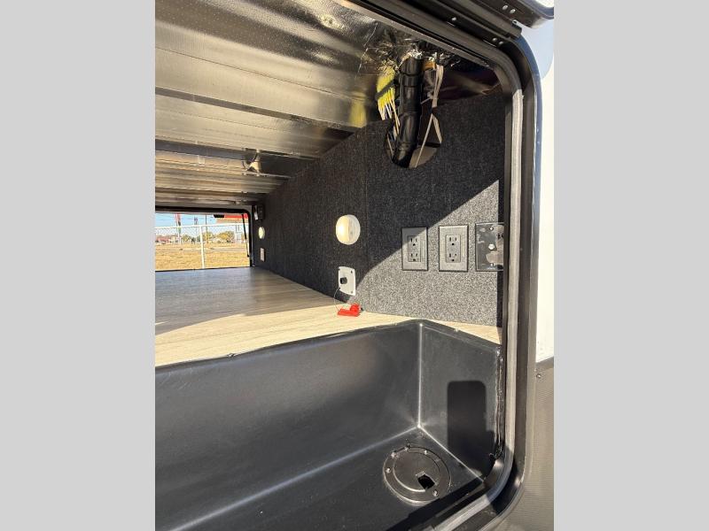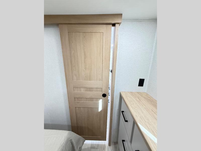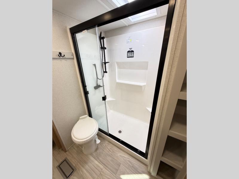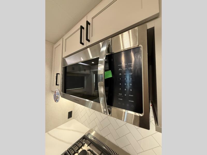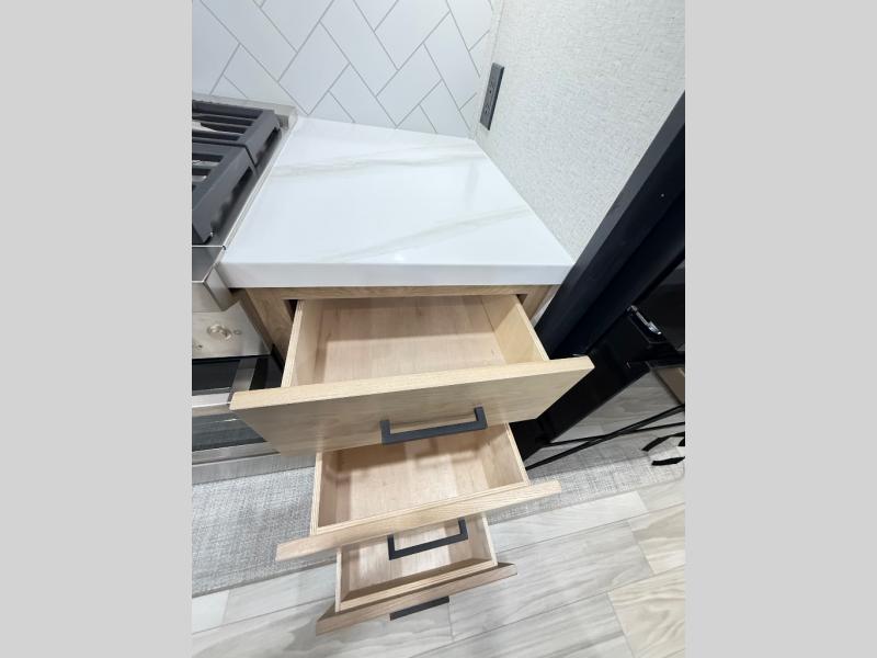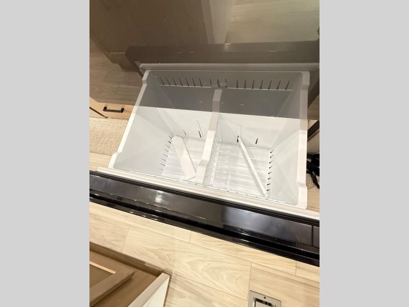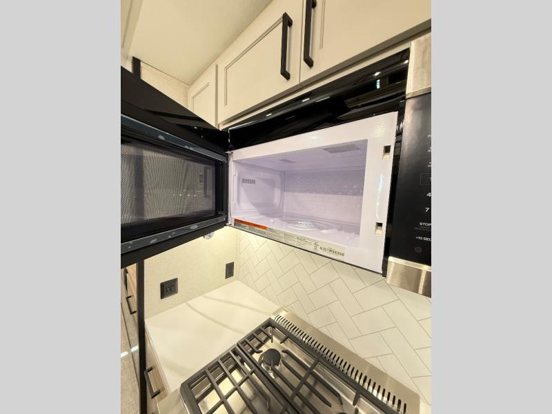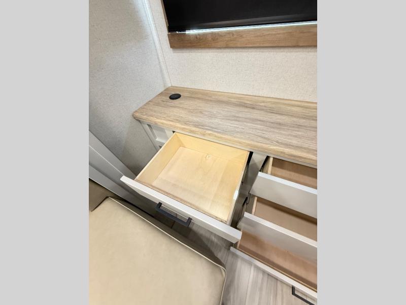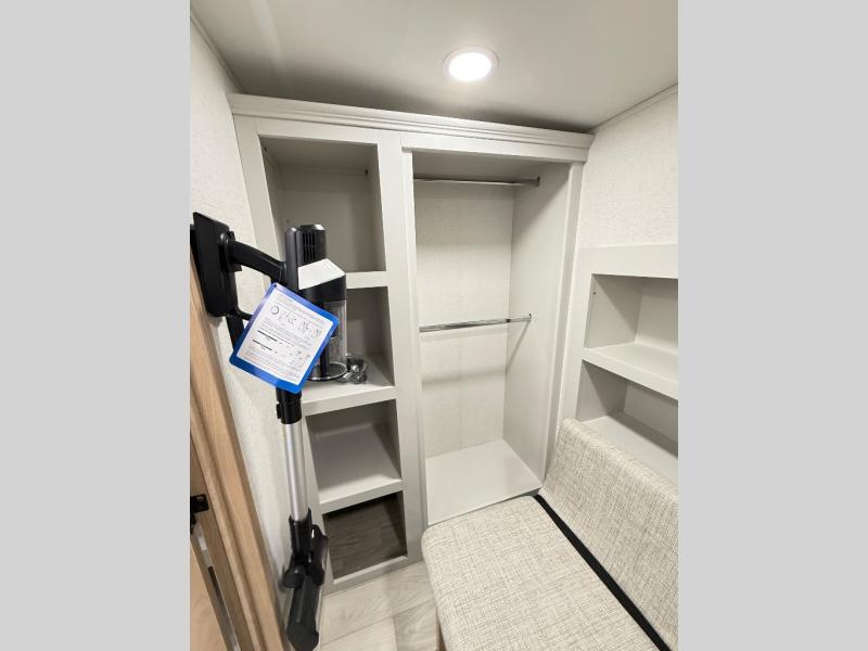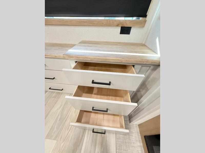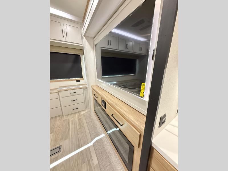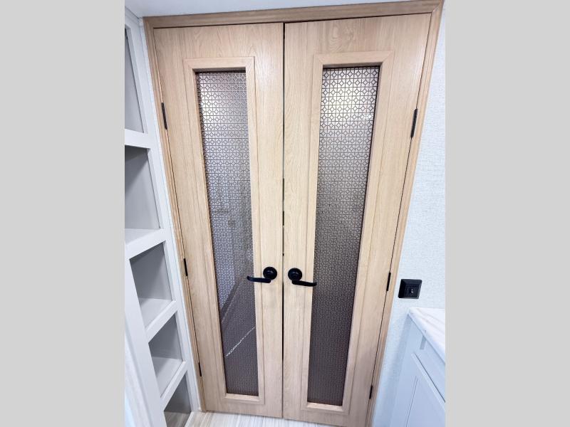 This fifth wheel is perfect for those seeking a comfortable, feature-rich home on wheels. Upon entering, you'll find a spacious rear living room, ideal for relaxation and entertainment. The room features a comfortable chaise lounge, sofa, and an entertainment center with a cozy fireplace. For added convenience, there's a hidden pantry, desk with a chair, and a shelf and cabinet for storage. The kitchen is well-appointed with a stylish kitchen island featuring a beautiful waterfall edge. Overhead cabinets provide ample storage, while the microwave and 12V refrigerator allow for easy meal prep. Plus, a butler pantry offers additional storage for kitchen essentials. A convenient half bath is located nearby, complete with a stackable washer and dryer prep if you want the option to add these appliances. The bedroom retreat features a comfortable king bed, a small dresser, and a tall dresser with a TV hookup. The adjacent walk-in bathroom closet boasts a one-piece fiberglass shower, dual sink, medicine cabinet, linen closet, and ample storage thanks to the various shelves, perfect for keeping your belongings organized. Exterior features include two awnings, one 12’ and the other 18’, providing ample shade and protection.