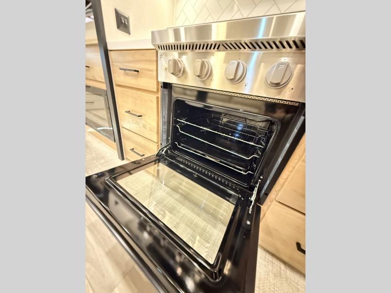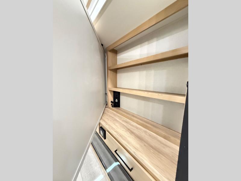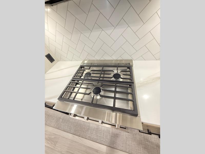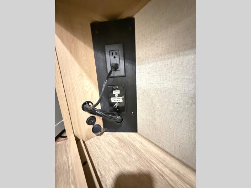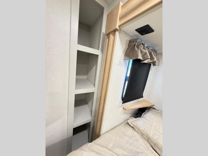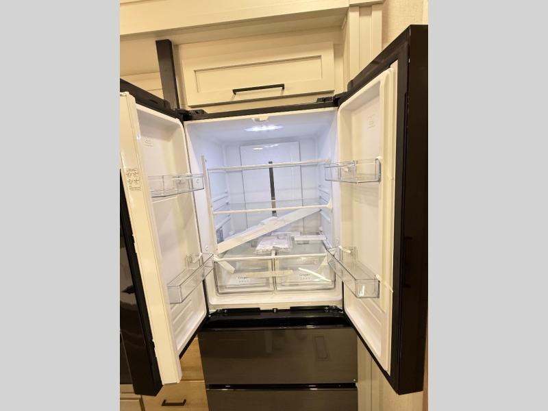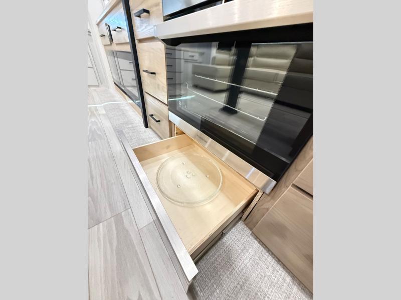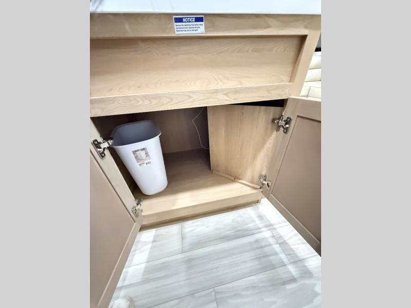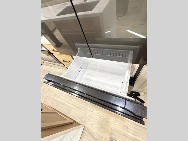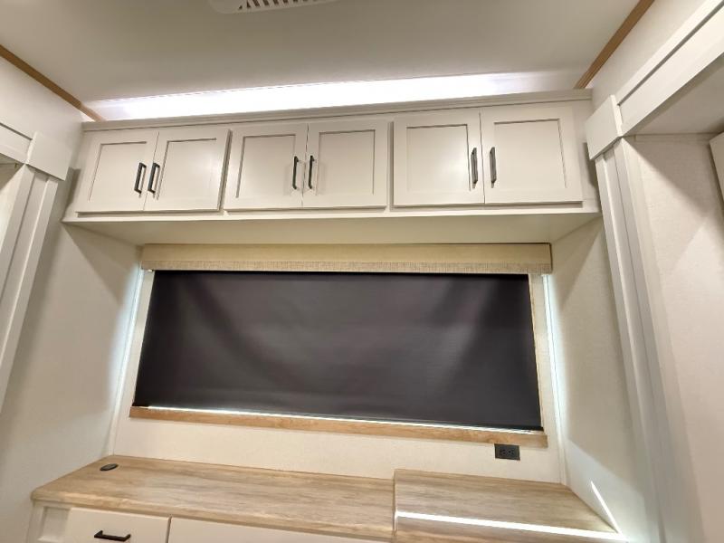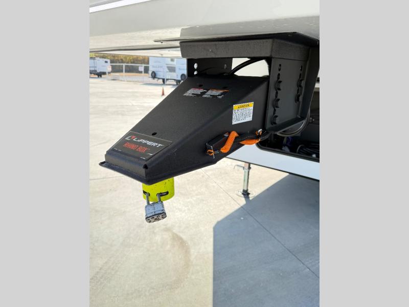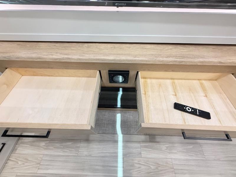 This fifth wheel is perfect for those seeking a comfortable, feature-rich home on wheels. Upon entering, you'll find a spacious rear living room, ideal for relaxation and entertainment. The room features a comfortable chaise lounge, sofa, and an entertainment center with a cozy fireplace. For added convenience, there's a hidden pantry, desk with a chair, and a shelf and cabinet for storage. The kitchen is well-appointed with a stylish kitchen island featuring a beautiful waterfall edge. Overhead cabinets provide ample storage, while the microwave and 12V refrigerator allow for easy meal prep. Plus, a butler pantry offers additional storage for kitchen essentials. A convenient half bath is located nearby, complete with a stackable washer and dryer prep if you want the option to add these appliances. The bedroom retreat features a comfortable king bed, a small dresser, and a tall dresser with a TV hookup. The adjacent walk-in bathroom closet boasts a one-piece fiberglass shower, dual sink, medicine cabinet, linen closet, and ample storage thanks to the various shelves, perfect for keeping your belongings organized. Exterior features include two awnings, one 12’ and the other 18’, providing ample shade and protection.