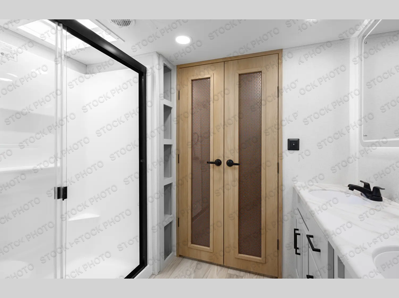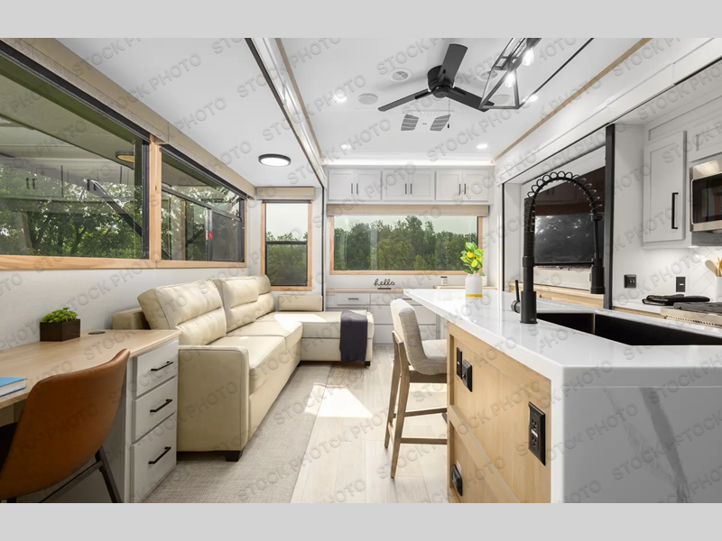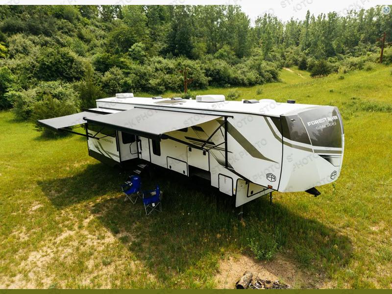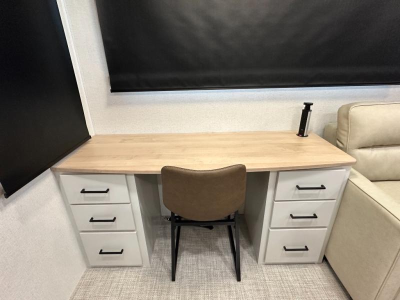 This fifth wheel is perfect for those seeking a comfortable, feature-rich home on wheels. Upon entering, you'll find a spacious rear living room, ideal for relaxation and entertainment. The room features a comfortable chaise lounge, sofa, and an entertainment center with a cozy fireplace. For added convenience, there's a hidden pantry, desk with a chair, and a shelf and cabinet for storage. The kitchen is well-appointed with a stylish kitchen island featuring a beautiful waterfall edge. Overhead cabinets provide ample storage, while the microwave and 12V refrigerator allow for easy meal prep. Plus, a butler pantry offers additional storage for kitchen essentials. A convenient half bath is located nearby, complete with a stackable washer and dryer prep if you want the option to add these appliances. The bedroom retreat features a comfortable king bed, a small dresser, and a tall dresser with a TV hookup. The adjacent walk-in bathroom closet boasts a one-piece fiberglass shower, dual sink, medicine cabinet, linen closet, and ample storage thanks to the various shelves, perfect for keeping your belongings organized. Exterior features include two awnings, one 12’ and the other 18’, providing ample shade and protection.