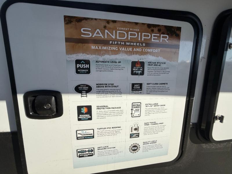 You will find the perfect balance of size, space, features, and luxury with any one of these Forest River Sandpiper fifth wheels! They are constructed with a welded aluminum framed vacuum bonded laminated superstructure, a cambered powder coated frame with rust prohibitor, and a fully enclosed underbelly for added protection against the elements. The large tinted windows come with a 80/20 UV prohibitor or you can choose the optional dual pane windows. Some hassle-free amenities include a 60k BTU on-demand water heater, full coach water filter system, tire pressure monitor system, and an electric leveling system! Inside, you'll enjoy stainless steel appliances, solid surface countertops, Beachside Sundance linoleum, recessed residential lighting, and many more comforts!