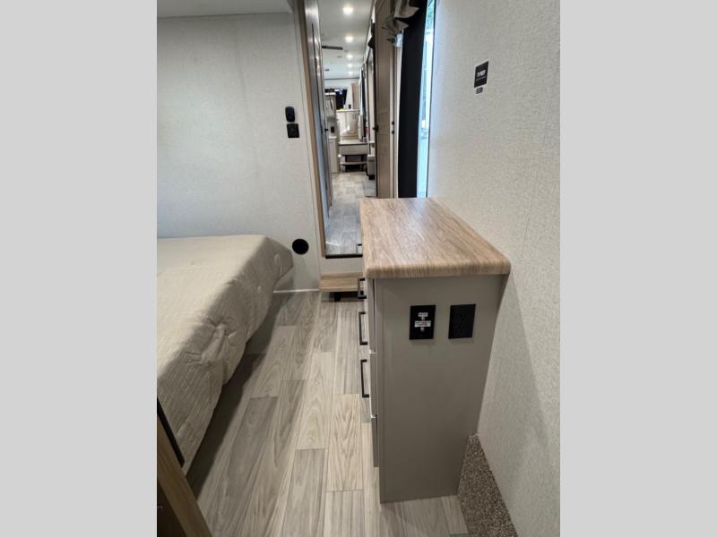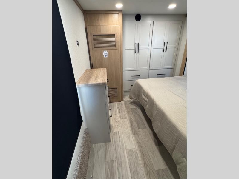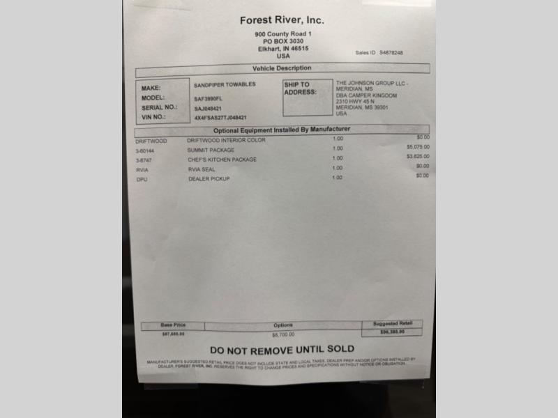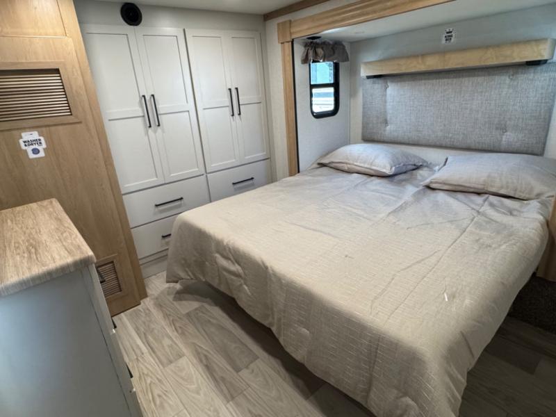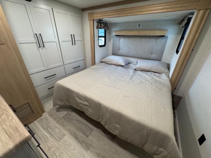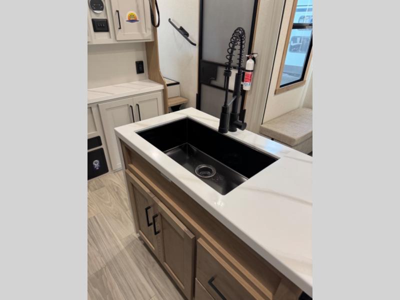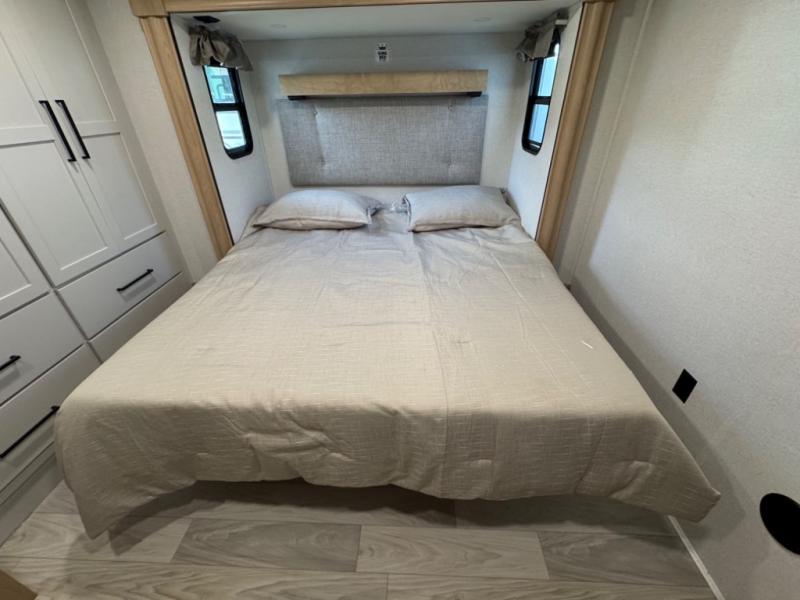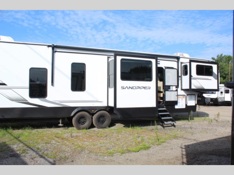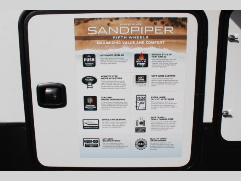 You will find the perfect balance of size, space, features, and luxury with any one of these Forest River Sandpiper fifth wheels! They are constructed with a welded aluminum framed vacuum bonded laminated superstructure, a cambered powder coated frame with rust prohibitor, and a fully enclosed underbelly for added protection against the elements. The large tinted windows come with a 80/20 UV prohibitor or you can choose the optional dual pane windows. Some hassle-free amenities include a 60k BTU on-demand water heater, full coach water filter system, tire pressure monitor system, and an electric leveling system! Inside, you'll enjoy stainless steel appliances, solid surface countertops, Beachside Sundance linoleum, recessed residential lighting, and many more comforts!