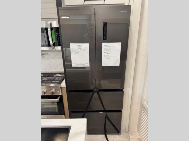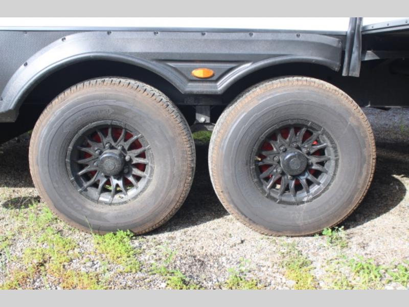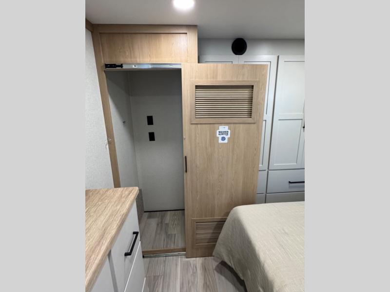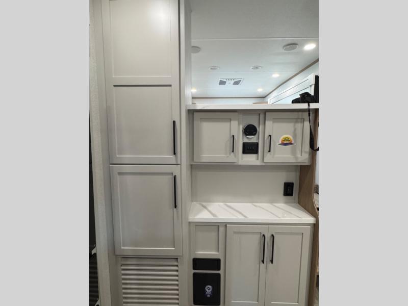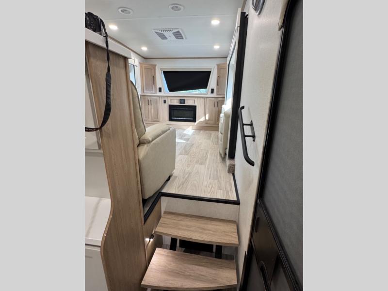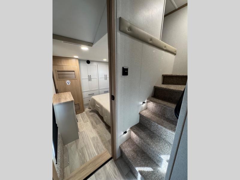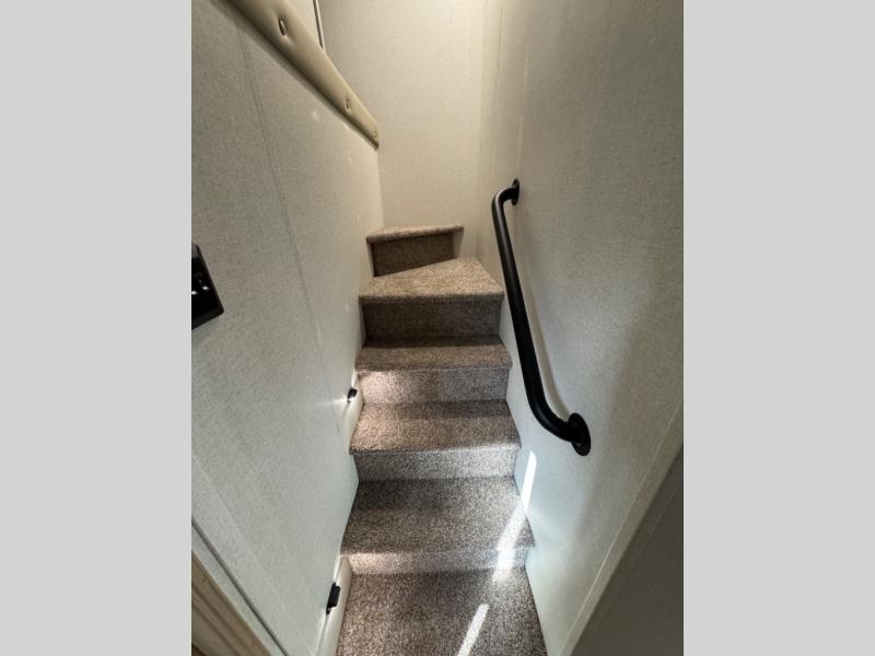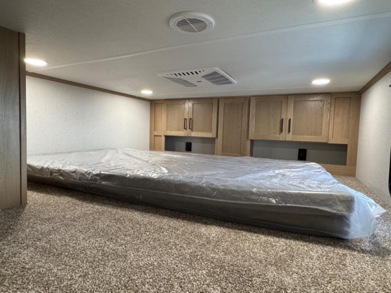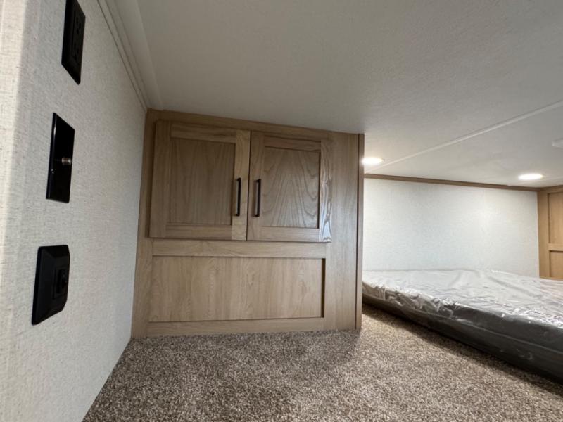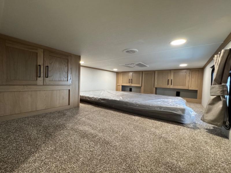 Wow! Check out this fifth wheel with a full loft for the little ones with two bunk mats, two wardrobe bookcases and a wardrobe/cabinet for ample storage. The main floor includes five slides for maximum space, a front living area with dual hide-a-bed sofas, plus an entertainment center with a 50" flat screen TV for movie nights! Once your guests have converted the living room to their bedroom at night, you can take the rear private bedroom. There is a king bed slide out here, a wardrobe, plus a closet with washer and dryer prep for full-time living. The full bath is easily accessible for everyone, and the middle kitchen will be a favorite with the chef of your group. Here, you'll find a 12V refrigerator, an island, tons of counter space, plus a hutch to display nice dishes, and a pantry for dry goods. Don't let this fifth wheel slip away!