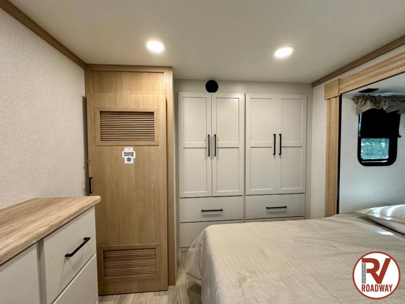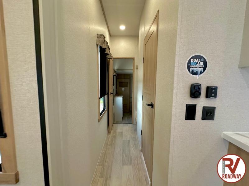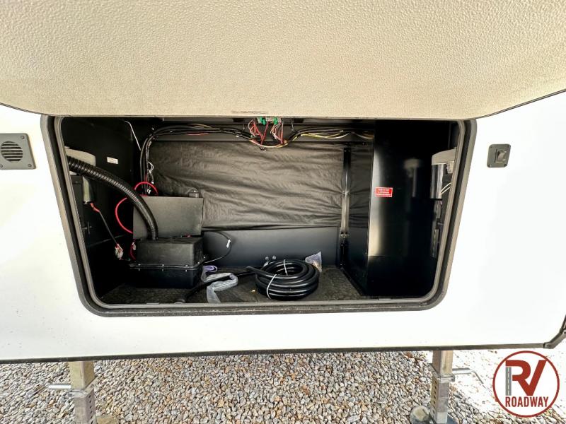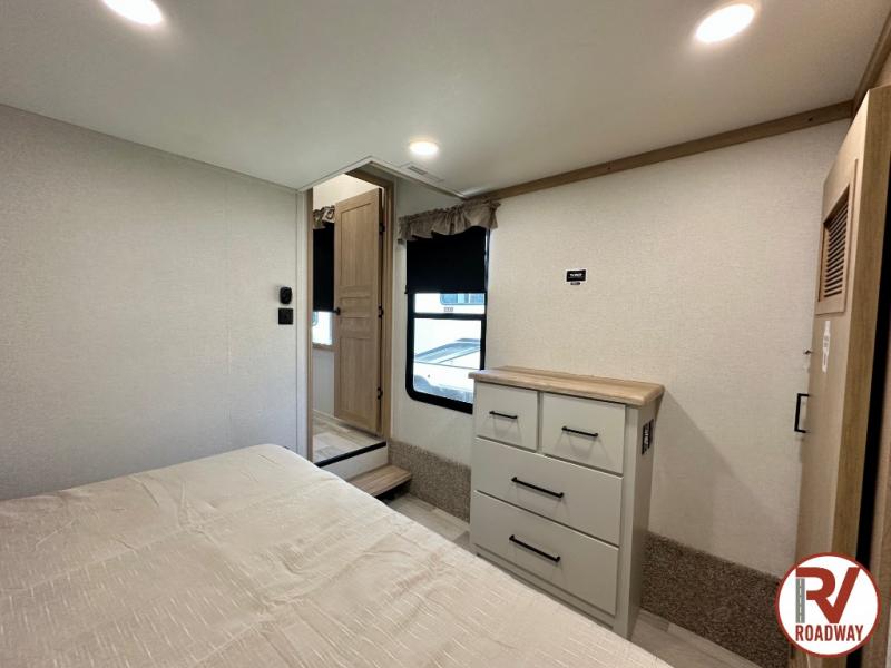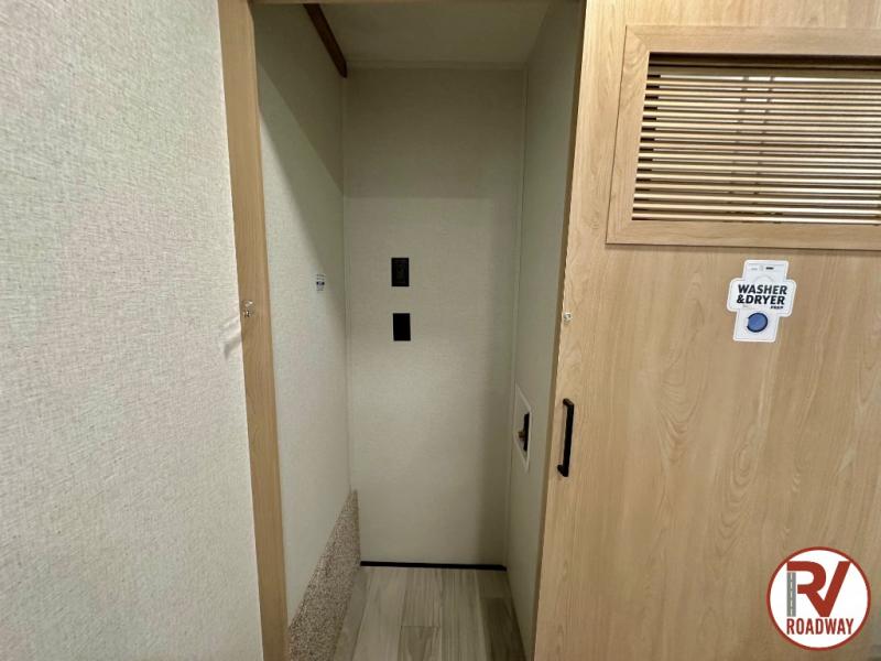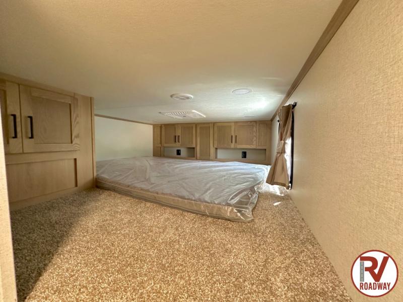 Wow! Check out this fifth wheel with a full loft for the little ones with two bunk mats, two wardrobe bookcases and a wardrobe/cabinet for ample storage. The main floor includes five slides for maximum space, a front living area with dual hide-a-bed sofas, plus an entertainment center with a 50" flat screen TV for movie nights! Once your guests have converted the living room to their bedroom at night, you can take the rear private bedroom. There is a king bed slide out here, a wardrobe, plus a closet with washer and dryer prep for full-time living. The full bath is easily accessible for everyone, and the middle kitchen will be a favorite with the chef of your group. Here, you'll find a 12V refrigerator, an island, tons of counter space, plus a hutch to display nice dishes, and a pantry for dry goods. Don't let this fifth wheel slip away!