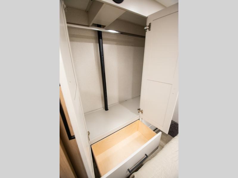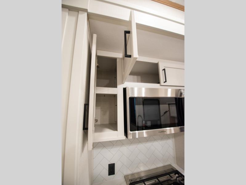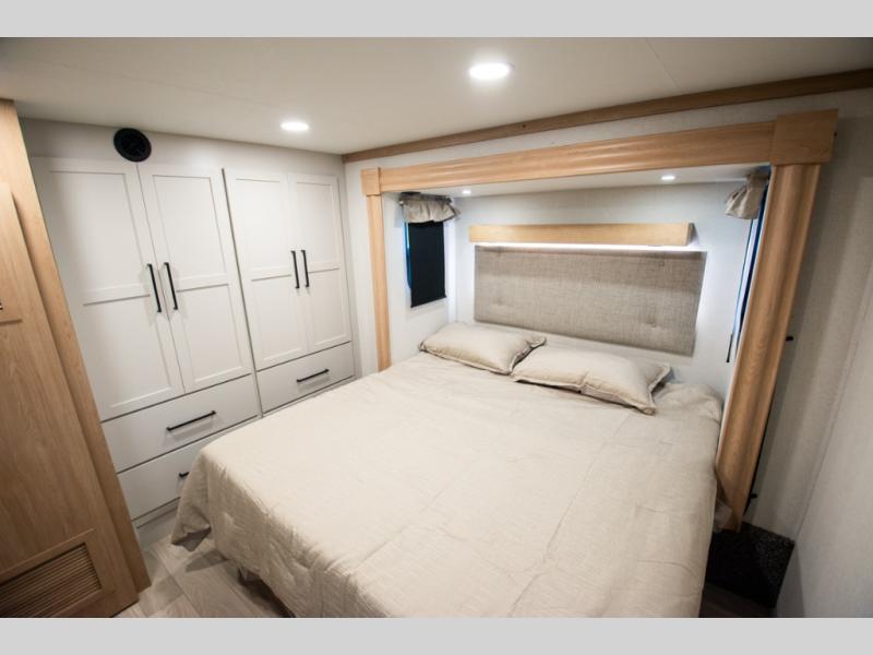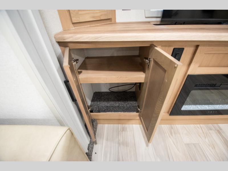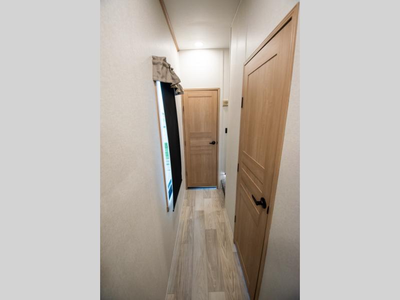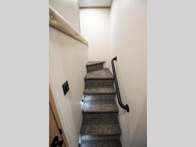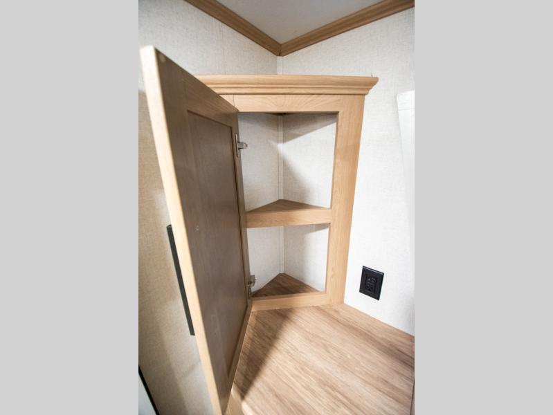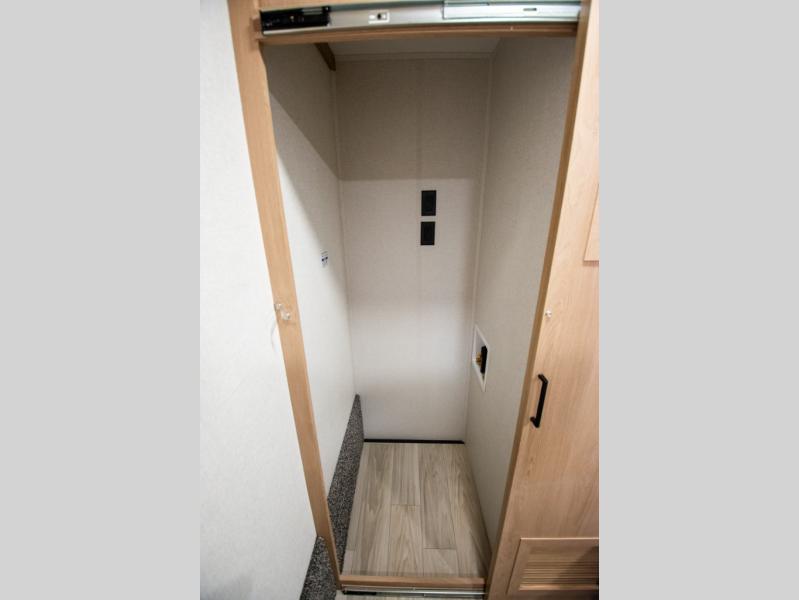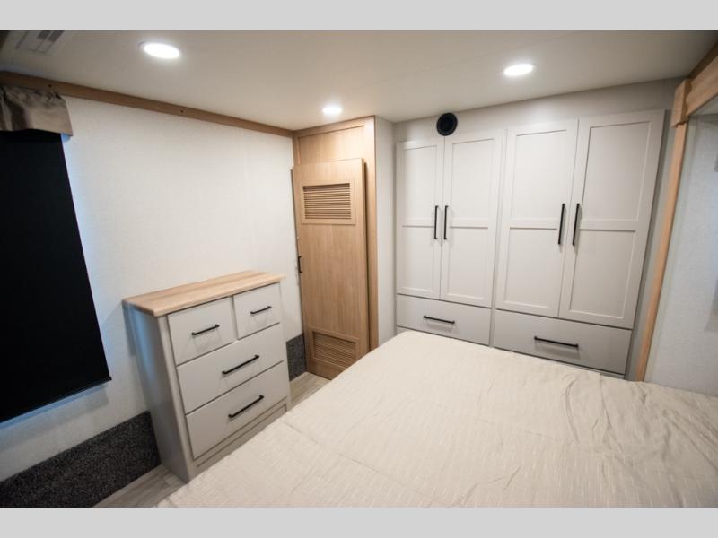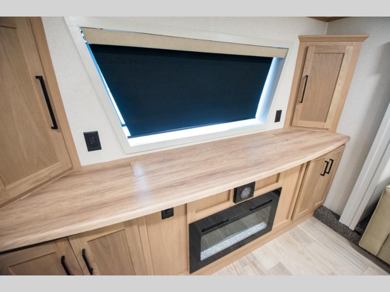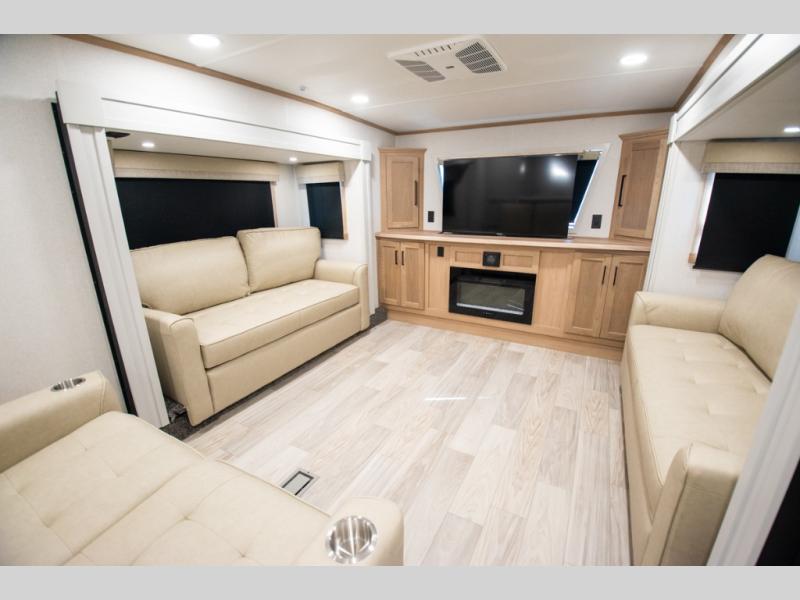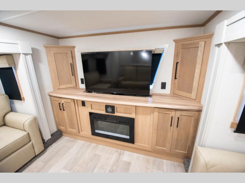 Wow! Check out this fifth wheel with a full loft for the little ones with two bunk mats, two wardrobe bookcases and a wardrobe/cabinet for ample storage. The main floor includes five slides for maximum space, a front living area with dual hide-a-bed sofas, plus an entertainment center with a 50" flat screen TV for movie nights! Once your guests have converted the living room to their bedroom at night, you can take the rear private bedroom. There is a king bed slide out here, a wardrobe, plus a closet with washer and dryer prep for full-time living. The full bath is easily accessible for everyone, and the middle kitchen will be a favorite with the chef of your group. Here, you'll find a 12V refrigerator, an island, tons of counter space, plus a hutch to display nice dishes, and a pantry for dry goods. Don't let this fifth wheel slip away!
