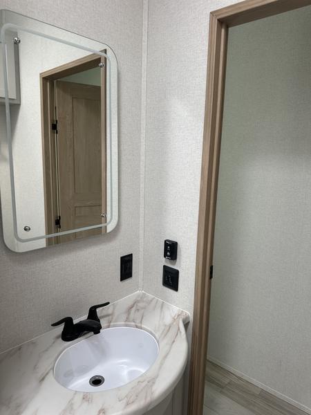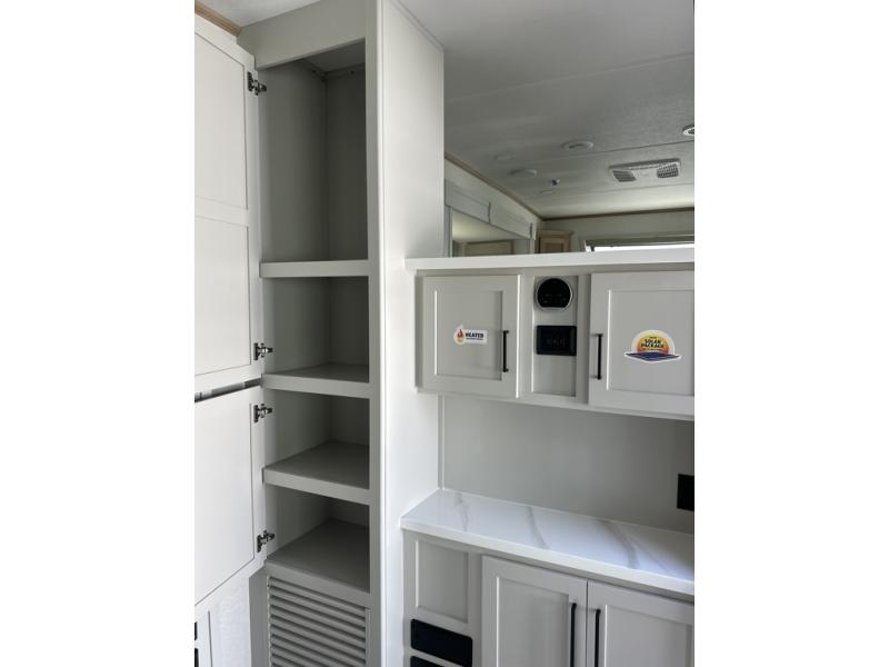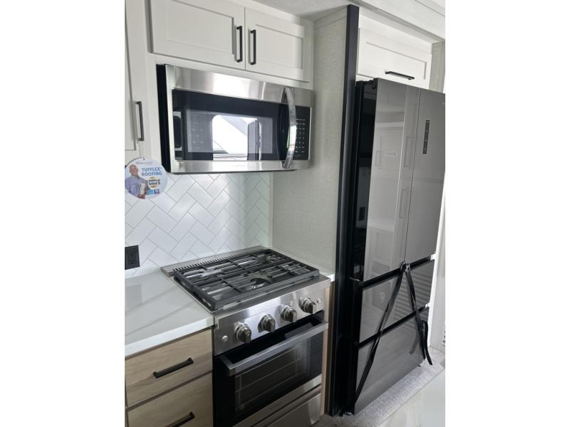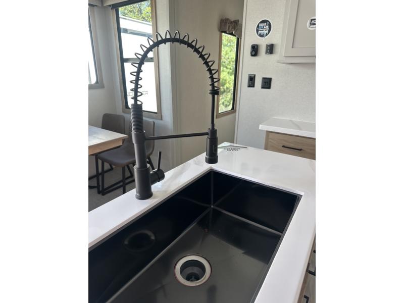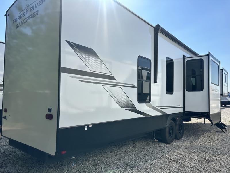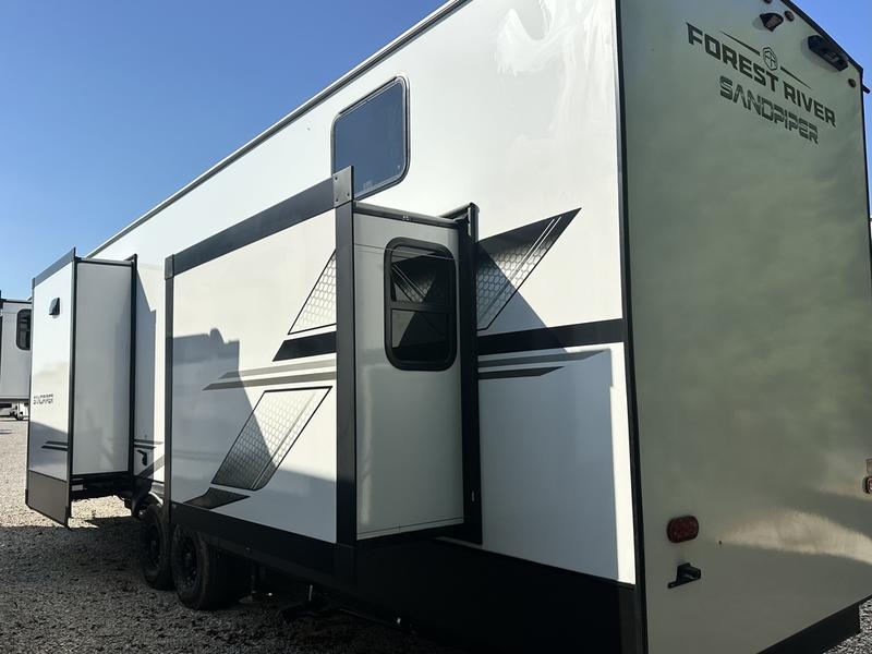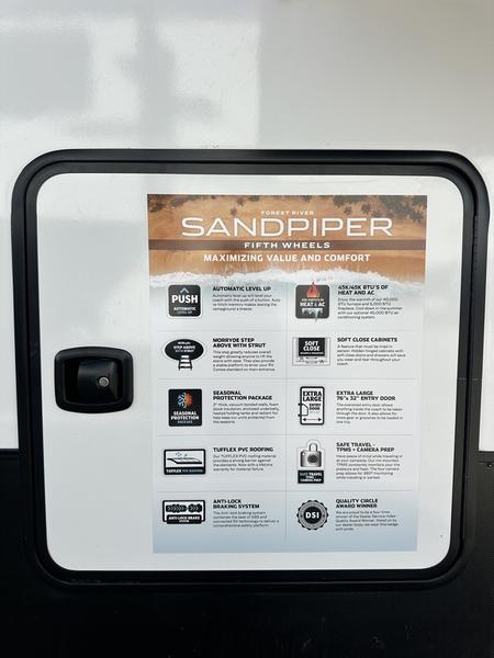 You will find the perfect balance of size, space, features, and luxury with any one of these Forest River Sandpiper fifth wheels! They have a cambered powder coated frame with rust prohibitor, and a fully enclosed underbelly for added protection against the elements. Also, the power front jacks with spring-loaded pins enhance the convenience, speed, and safety. The large, tinted windows come with a 80/20 UV prohibitors. Some hassle-free amenities include a 60k BTU on-demand water heater, porcelain foot flush toilet(s), tire pressure monitor system, and an electric leveling system! Inside, you'll enjoy stainless steel kitchen package, solid surface kitchen countertops, Beachside Sundance Congoleum linoleum, recessed residential lighting, and many more comforts!