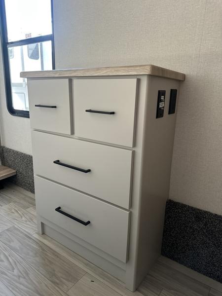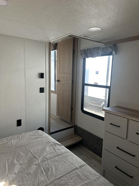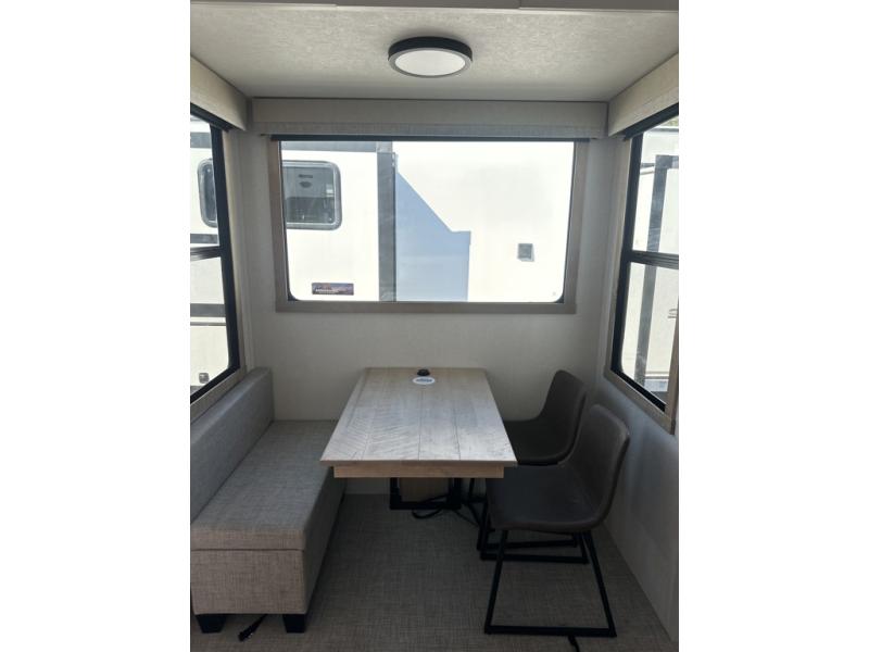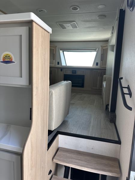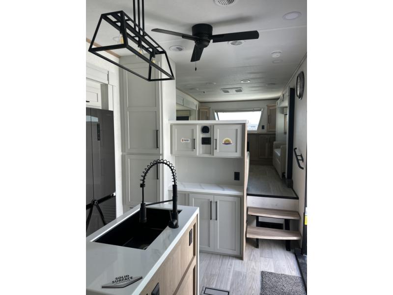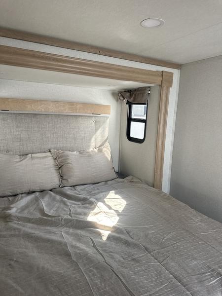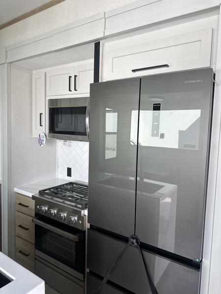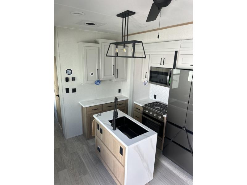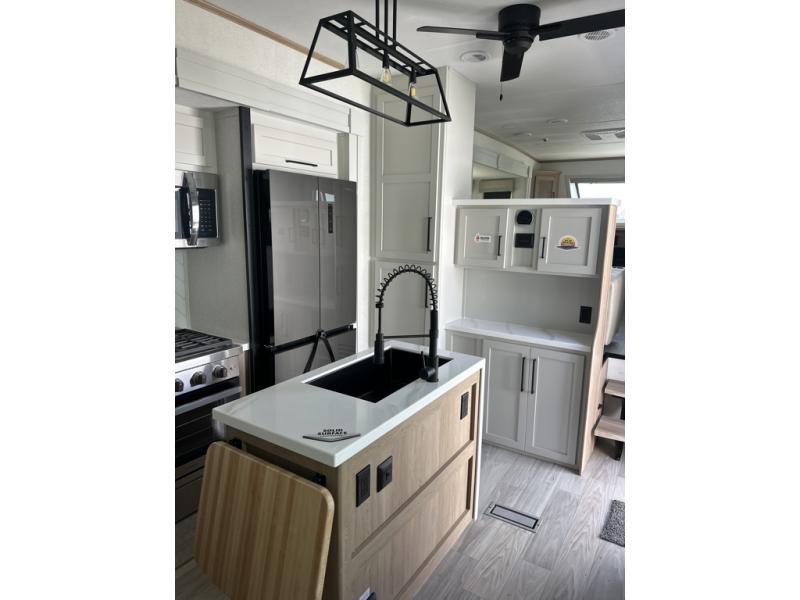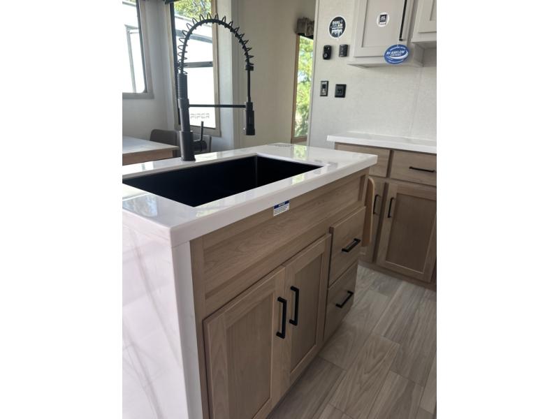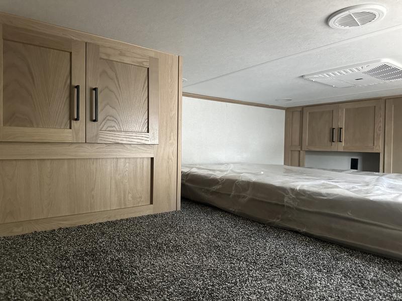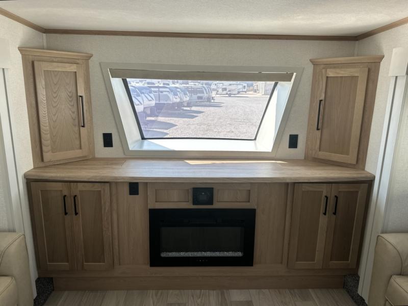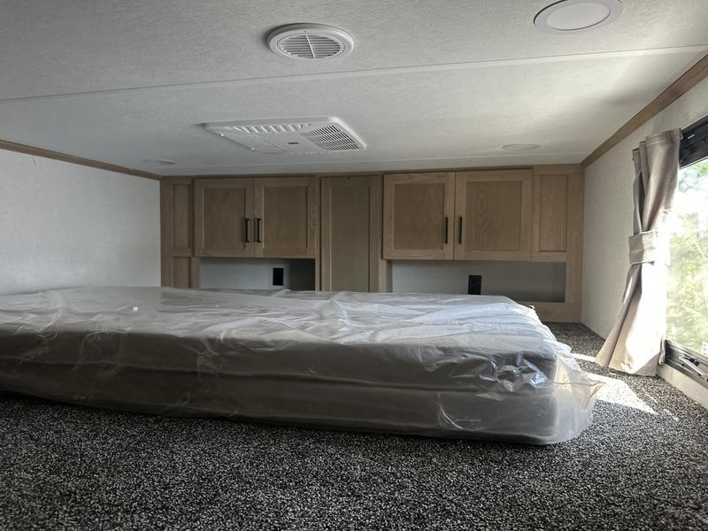 The perfect fifth wheel for a larger family! This unit sleeps eight people the loft above the rear master bedroom and bathroom. In the loft area, there are two 44" x 74" bunk mats for comfort as well as wardrobe/storage at the head of each. The master bedroom features a king size bed that slides out to create more space by the bed. A spacious bath features a one-piece fiberglass shower for comfort. A spacious kitchen features two slides, a free-standing dinette in one, and the 12V refrigerator and stove in the other. There is also a center island with large sink for added food prep space. Head up the steps in front to a dual slide front living area with 50" TV and fireplace beneath the window. There is also theater seating opposite the TV, and a tri-fold hide-a-bed in each slide allowing added sleeping space when needed.