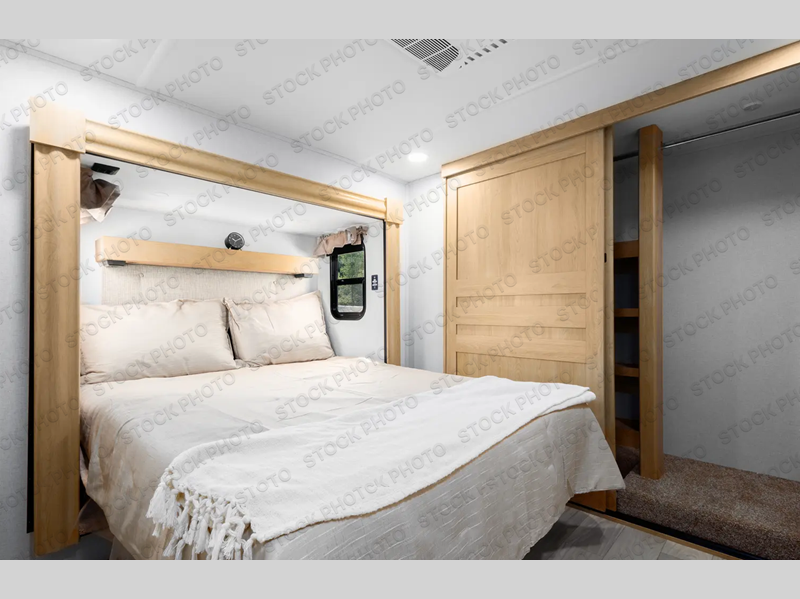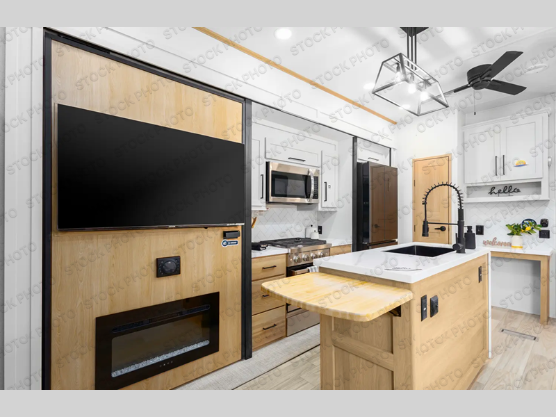 Enjoy a home on wheels with this fifth wheel! There are two bedrooms to choose from plus an upper loft with two 32" x 74" bunk mats, cabinets, and TV prep. The front private bedroom has a queen bed slide across from a dresser and next to a front wardrobe that is prepped to add an optional washer and dryer. The second bedroom has a queen bed slide across from a dresser with wardrobes on either side, plus it's very own full rear bathroom which has a tub and a rear entry/exit door to the unit. The second full bathroom has a one-piece fiberglass shower so everyone can get ready quickly in the morning. Prepare your best home cooked meals with the kitchen island and three burner cooktop then enjoy it at the free-standing dinette. Relax in true comfort each night in the theater seating across from the fireplace and 50" TV at the entertainment center!