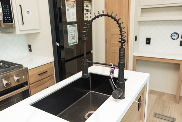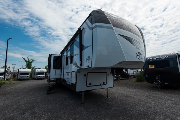 Weekend camping trips and full-time RV living is made complete in this quad slide out fifth wheel. Your crew can relax under the two power awnings, or head inside to enjoy the fireplace. There is also a 50" flat screen TV across from the theater seating, plus a free-standing dinette to dine at. There are two full baths with the front bath including a walk-in shower with a seat for your comfort, and the front private bedroom will feel just like home with its queen bed and large front wardrobe. There is even washer and dryer prep to make laundry day easier than ever. The master bedroom in back includes a second queen bed slide out, and the rear full bath has another convenience with it's exterior entry door, and