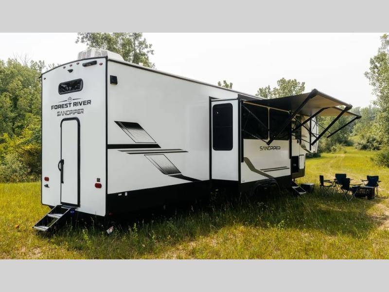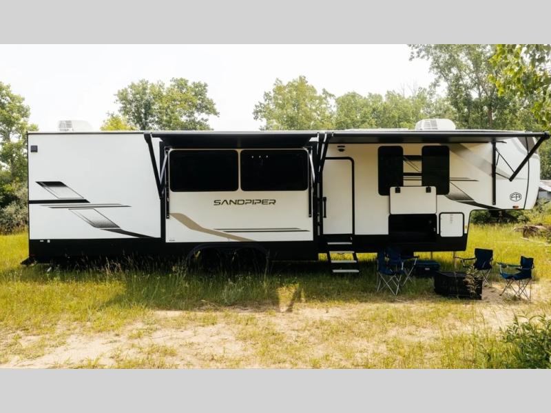 You will find the perfect balance of size, space, features, and luxury with any one of these Forest River Sandpiper fifth wheels! They are constructed with a welded aluminum framed vacuum bonded laminated superstructure, a cambered powder coated frame with rust prohibitor, and a fully enclosed underbelly for added protection against the elements. The large tinted windows come with a 80/20 UV prohibitor or you can choose the optional dual pane windows. Some hassle-free amenities include a 60k BTU on-demand water heater, full coach water filter system, tire pressure monitor system, and an electric leveling system! Inside, you'll enjoy stainless steel appliances, solid surface countertops, Beachside Sundance linoleum, recessed residential lighting, and many more comforts!