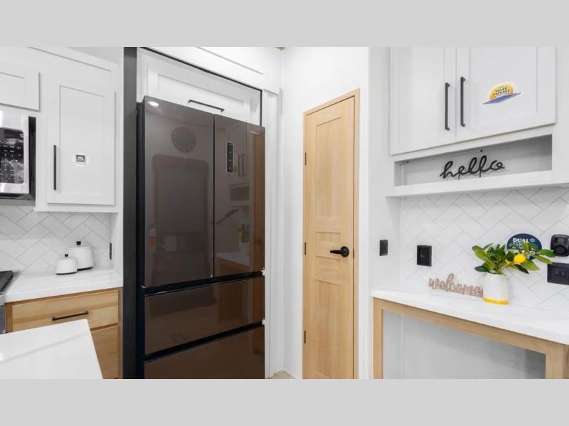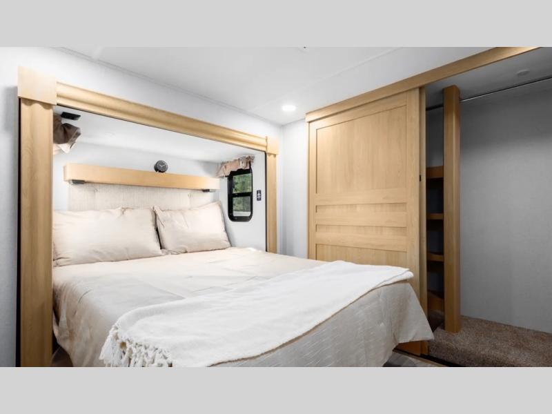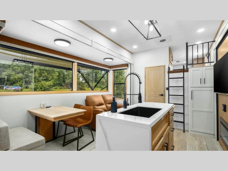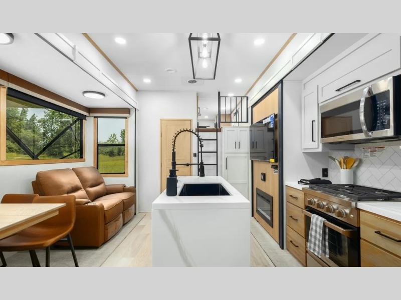 Weekend camping trips and full-time RV living is made complete in this quad slide out fifth wheel. Your crew can relax under the two power awnings, or head inside to enjoy the fireplace. There is also a 50" flat screen TV across from the theater seating, plus a free-standing dinette to dine at. There are two full baths with the front bath including a walk-in shower with a seat for your comfort, and the front private bedroom will feel just like home with its queen bed and large front wardrobe. There is even washer and dryer prep to make laundry day easier than ever. The master bedroom in back includes a second queen bed slide out, and the rear full bath has another convenience with it's exterior entry door, and