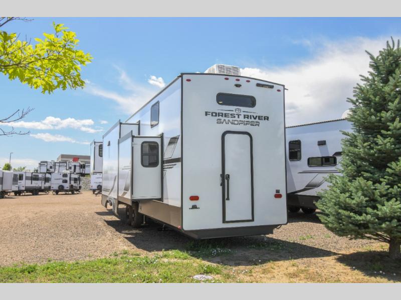 You will find the perfect balance of size, space, features, and luxury with any one of these Forest River Sandpiper fifth wheels! They are constructed with a welded aluminum framed vacuum bonded laminated superstructure, a cambered powder coated frame with rust prohibitor, and a fully enclosed underbelly for added protection against the elements. The large tinted windows come with a 80/20 UV prohibitor or you can choose the optional dual pane windows. Some hassle-free amenities include a 60k BTU on-demand water heater, full coach water filter system, tire pressure monitor system, and an electric leveling system! Inside, you'll enjoy stainless steel appliances, solid surface countertops, Beachside Sundance linoleum, recessed residential lighting, and many more comforts!