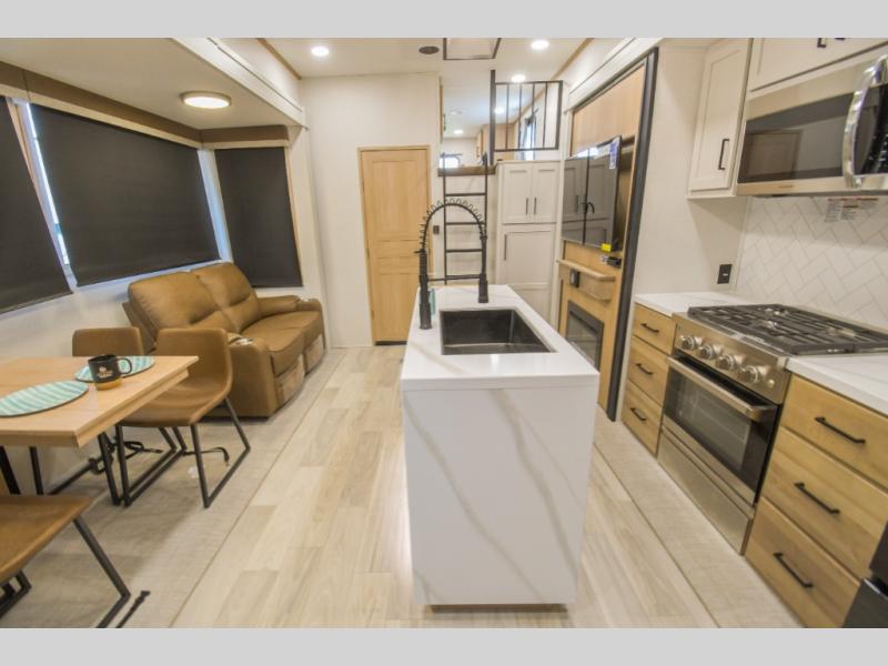 Weekend camping trips and full-time RV living is made complete in this quad slide out fifth wheel. Your crew can relax under the two power awnings, or head inside to enjoy the fireplace. There is also a 50" flat screen TV across from the theater seating, plus a free-standing dinette to dine at. There are two full baths with the front bath including a walk-in shower with a seat for your comfort, and the front private bedroom will feel just like home with its queen bed and large front wardrobe. There is even washer and dryer prep to make laundry day easier than ever. The master bedroom in back includes a second queen bed slide out, and the rear full bath has another convenience with it's exterior entry door, and