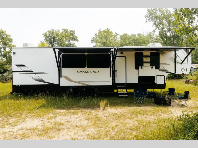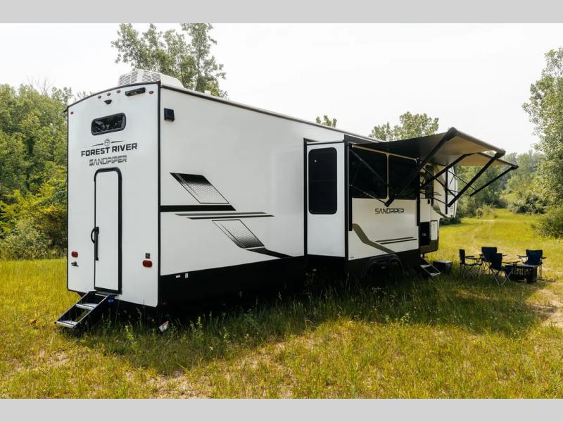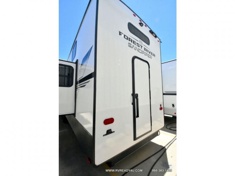 You will find the perfect balance of size, space, features, and luxury with any one of these Forest River Sandpiper fifth wheels! They are constructed with a welded aluminum framed vacuum bonded laminated superstructure, a cambered powder coated frame with rust prohibitor, and a fully enclosed underbelly for added protection against the elements. The large tinted windows come with a 80/20 UV prohibitor or you can choose the optional dual pane windows. Some hassle-free amenities include a 60k BTU on-demand water heater, full coach water filter system, tire pressure monitor system, and an electric leveling system! Inside, you'll enjoy stainless steel appliances, solid surface countertops, Beachside Sundance linoleum, recessed residential lighting, and many more comforts!