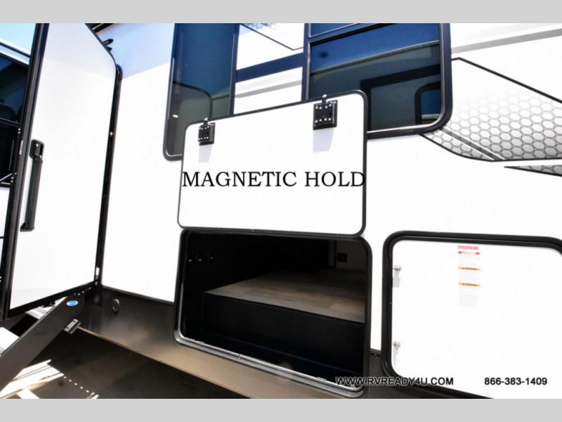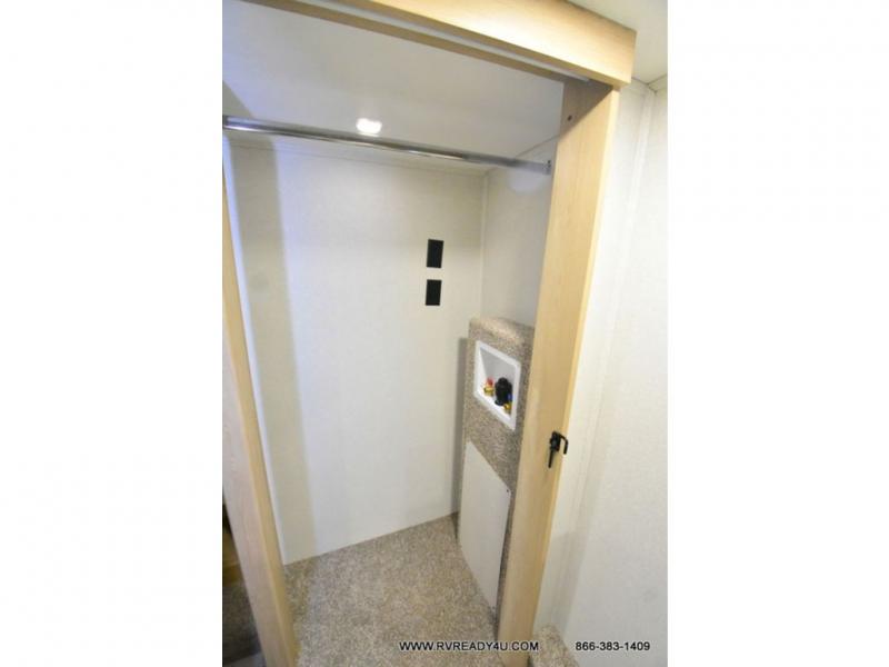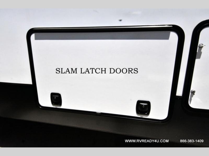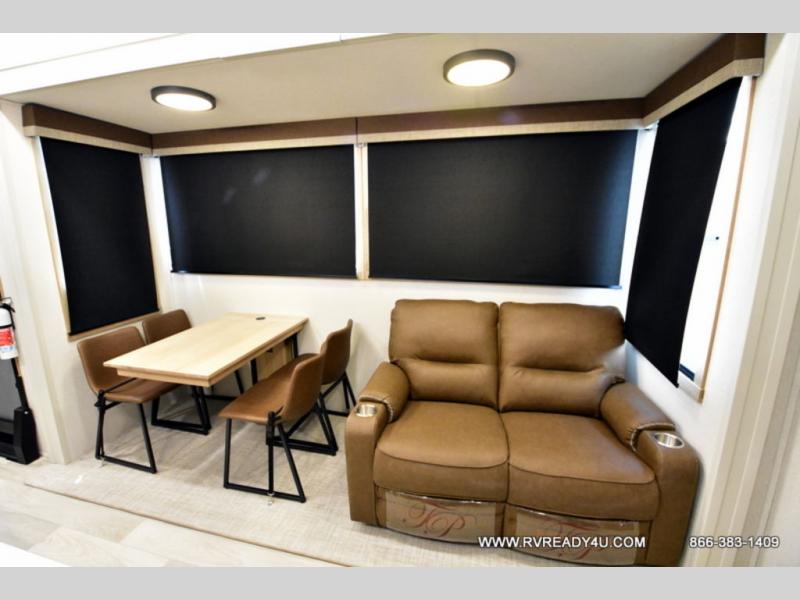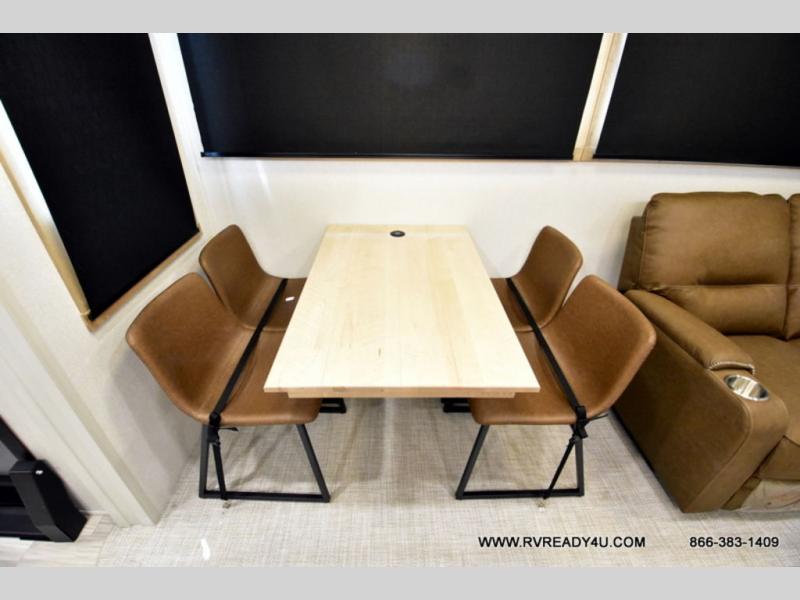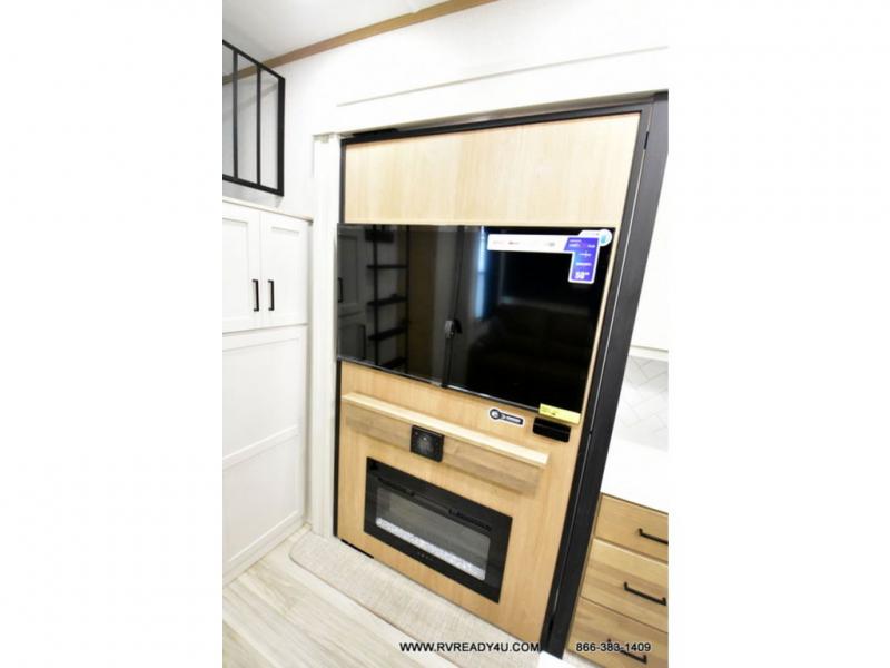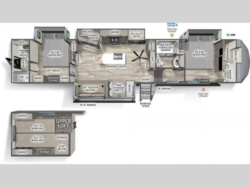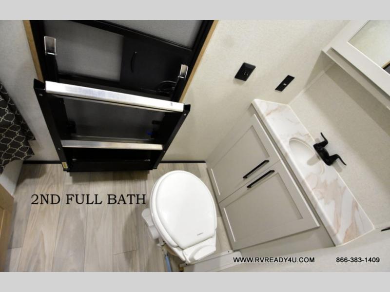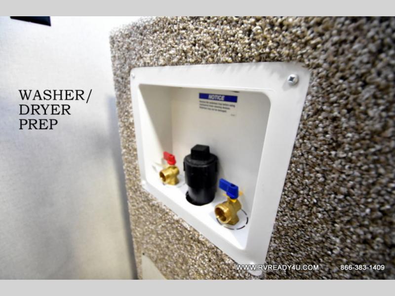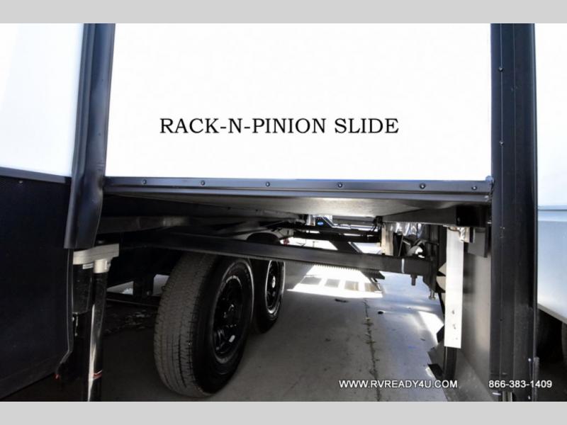 Weekend camping trips and full-time RV living is made complete in this quad slide out fifth wheel. Your crew can relax under the two power awnings, or head inside to enjoy the fireplace. There is also a 50" flat screen TV across from the theater seating, plus a free-standing dinette to dine at. There are two full baths with the front bath including a walk-in shower with a seat for your comfort, and the front private bedroom will feel just like home with its queen bed and large front wardrobe. There is even washer and dryer prep to make laundry day easier than ever. The master bedroom in back includes a second queen bed slide out, and the rear full bath has another convenience with it's exterior entry door, and