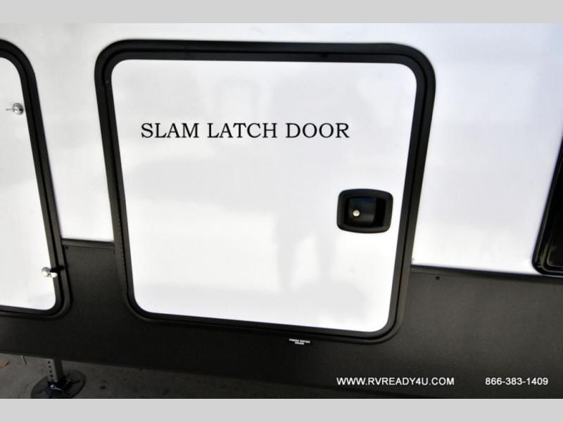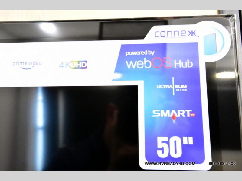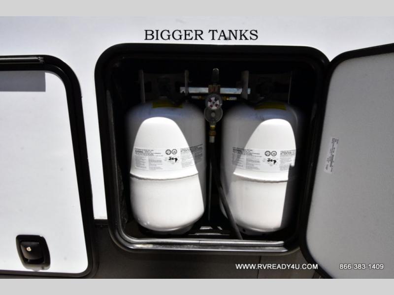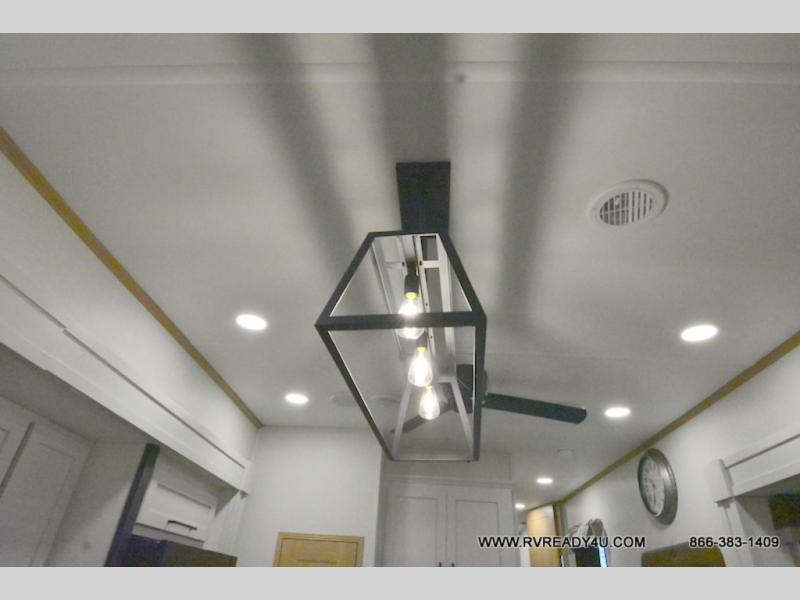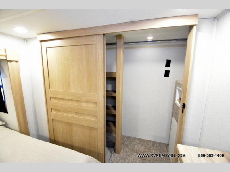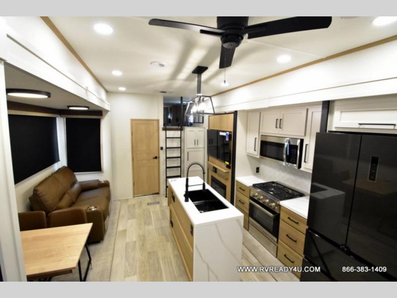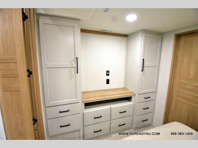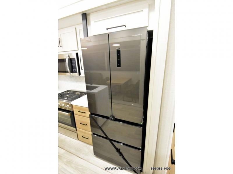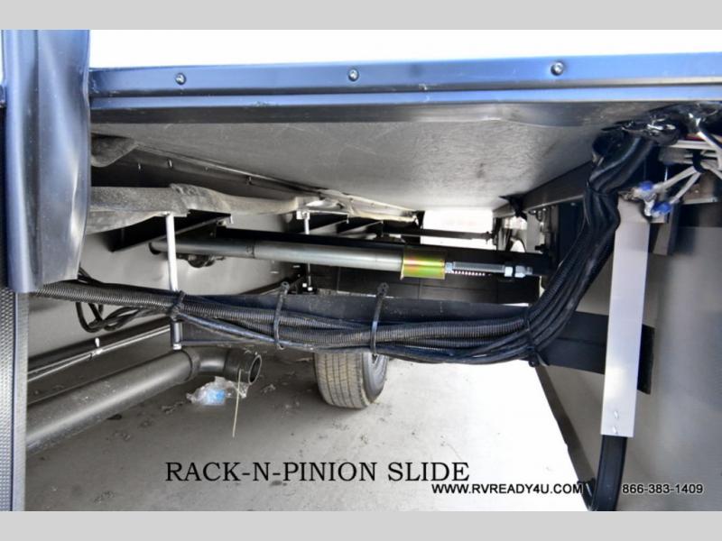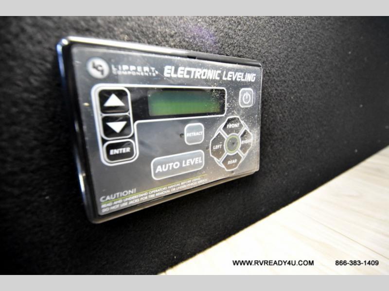 Weekend camping trips and full-time RV living is made complete in this quad slide out fifth wheel. Your crew can relax under the two power awnings, or head inside to enjoy the fireplace. There is also a 50" flat screen TV across from the theater seating, plus a free-standing dinette to dine at. There are two full baths with the front bath including a walk-in shower with a seat for your comfort, and the front private bedroom will feel just like home with its queen bed and large front wardrobe. There is even washer and dryer prep to make laundry day easier than ever. The master bedroom in back includes a second queen bed slide out, and the rear full bath has another convenience with it's exterior entry door, and