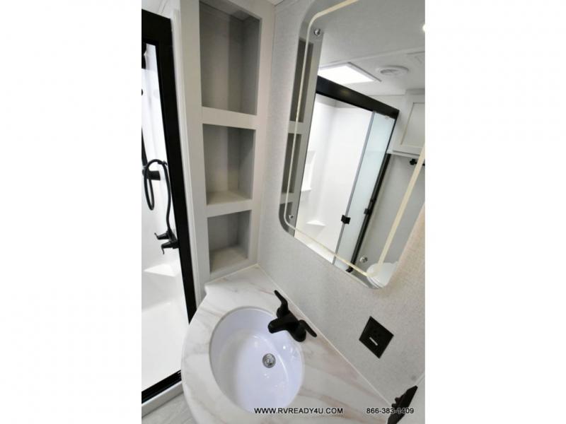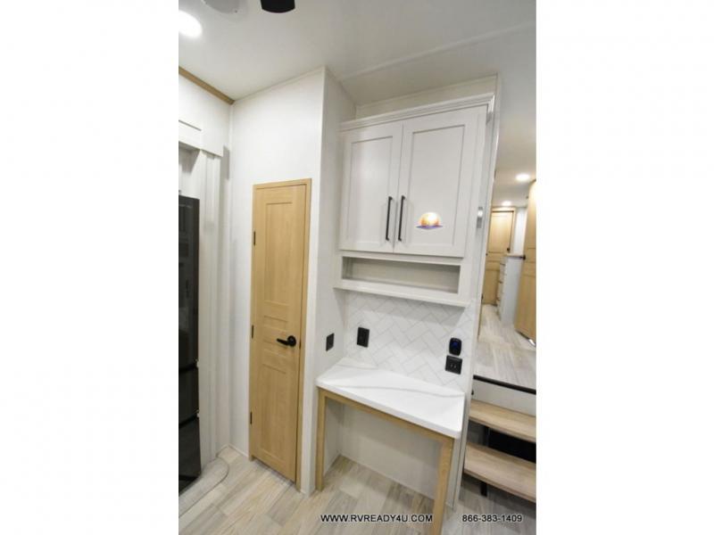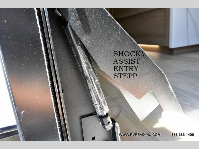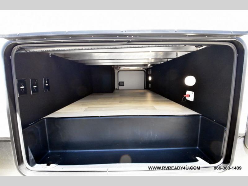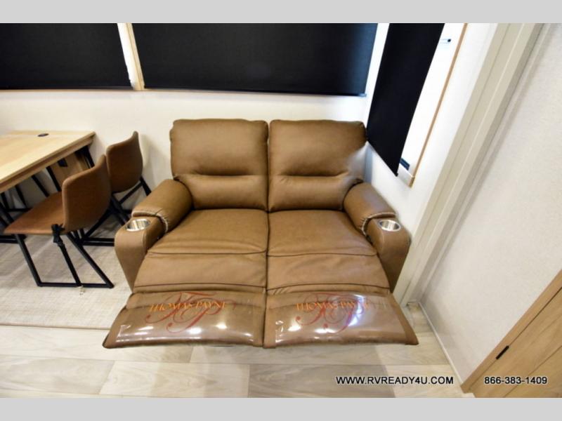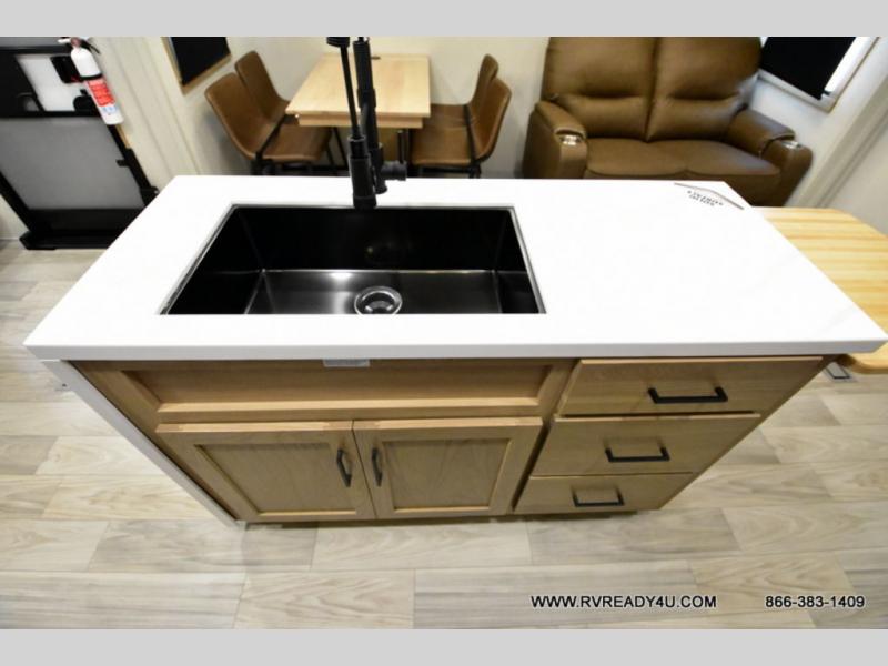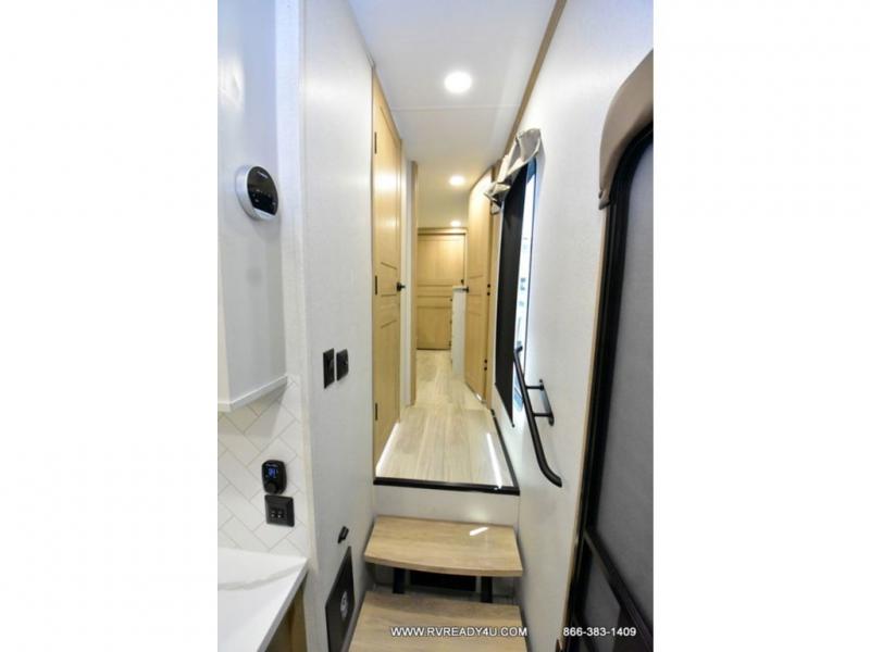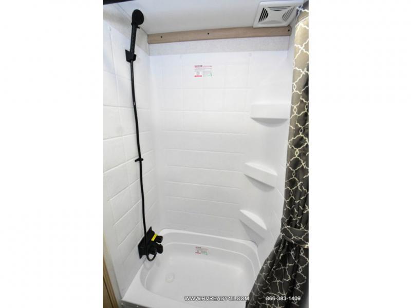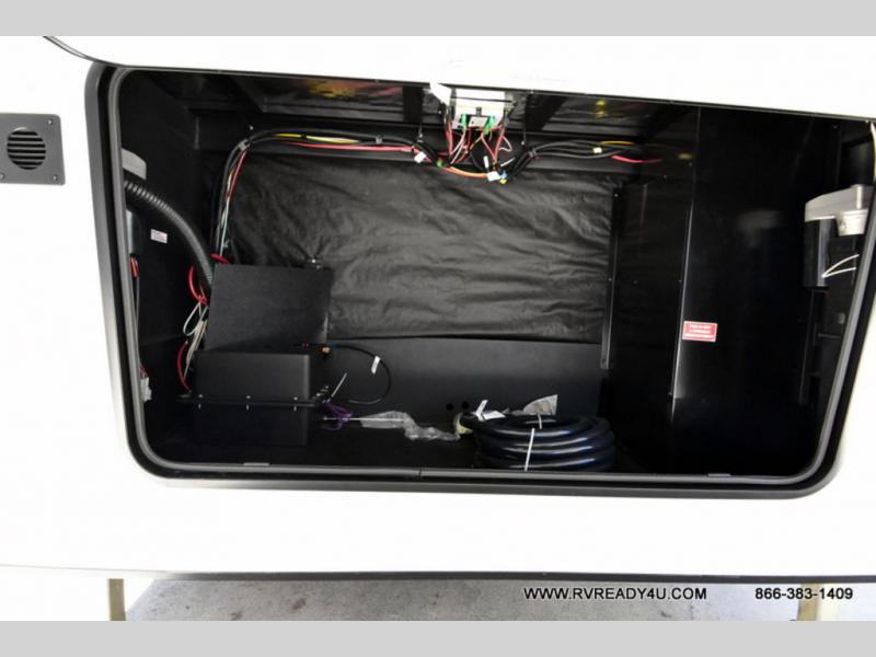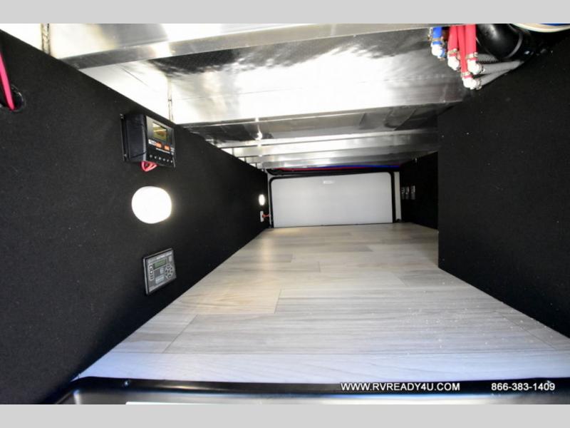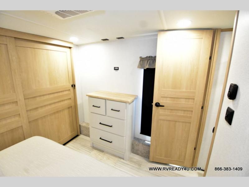 Weekend camping trips and full-time RV living is made complete in this quad slide out fifth wheel. Your crew can relax under the two power awnings, or head inside to enjoy the fireplace. There is also a 50" flat screen TV across from the theater seating, plus a free-standing dinette to dine at. There are two full baths with the front bath including a walk-in shower with a seat for your comfort, and the front private bedroom will feel just like home with its queen bed and large front wardrobe. There is even washer and dryer prep to make laundry day easier than ever. The master bedroom in back includes a second queen bed slide out, and the rear full bath has another convenience with it's exterior entry door, and