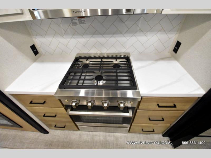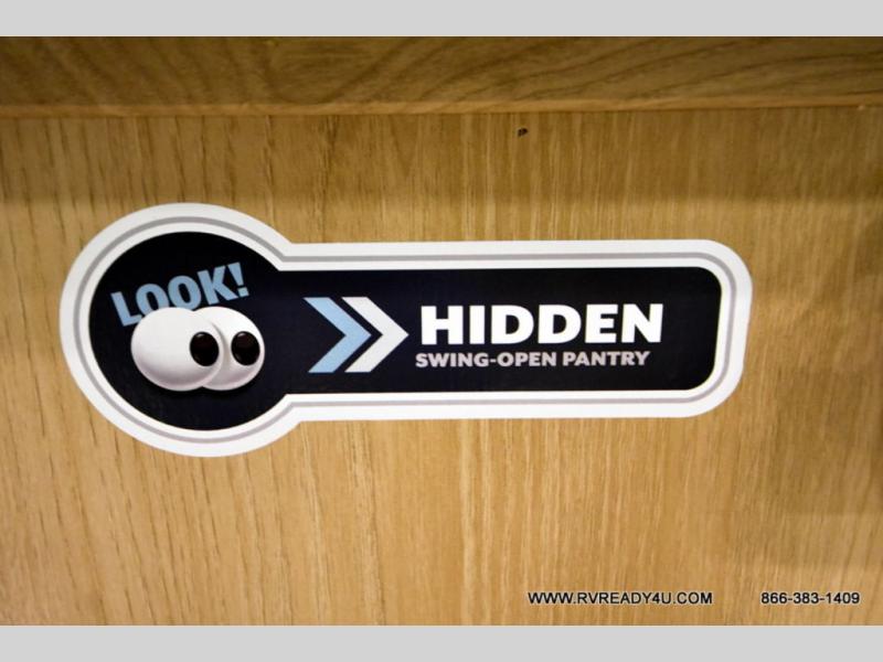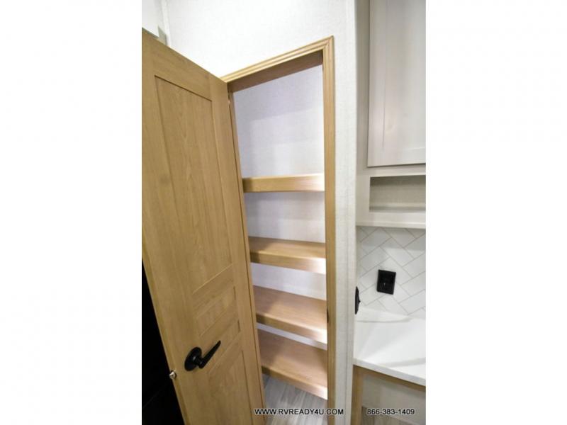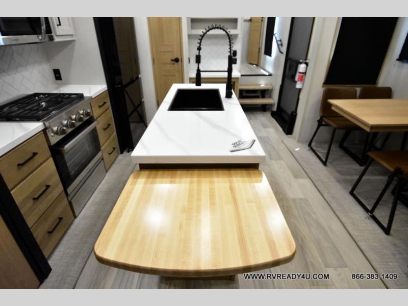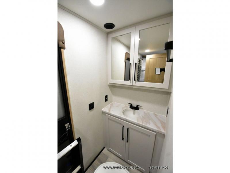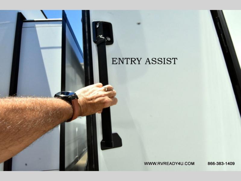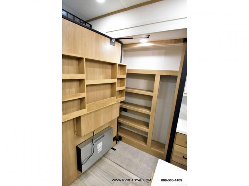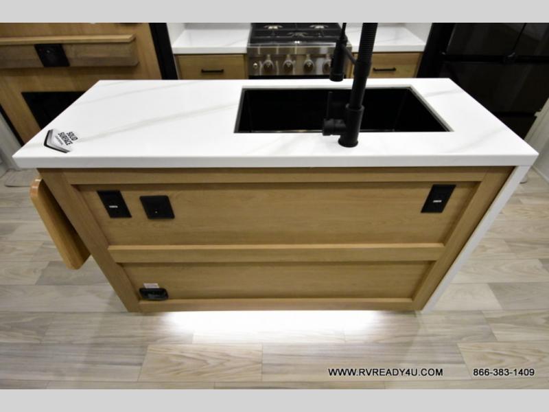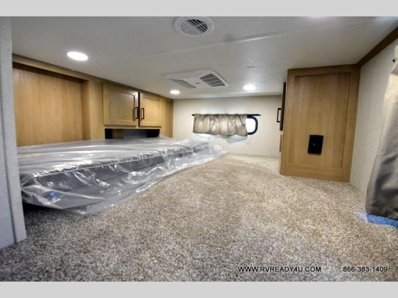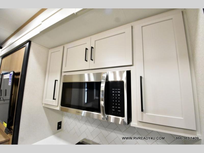 Weekend camping trips and full-time RV living is made complete in this quad slide out fifth wheel. Your crew can relax under the two power awnings, or head inside to enjoy the fireplace. There is also a 50" flat screen TV across from the theater seating, plus a free-standing dinette to dine at. There are two full baths with the front bath including a walk-in shower with a seat for your comfort, and the front private bedroom will feel just like home with its queen bed and large front wardrobe. There is even washer and dryer prep to make laundry day easier than ever. The master bedroom in back includes a second queen bed slide out, and the rear full bath has another convenience with it's exterior entry door, and