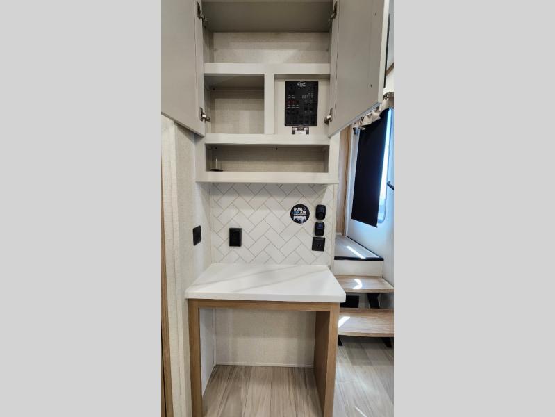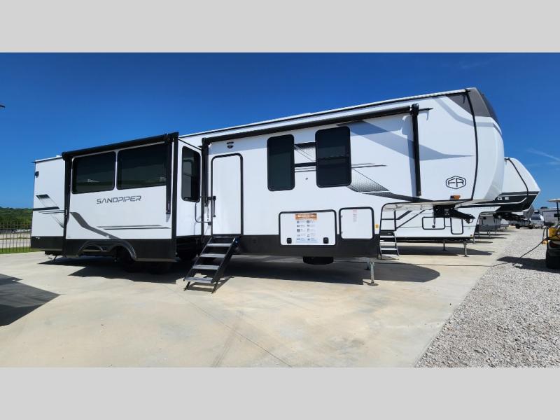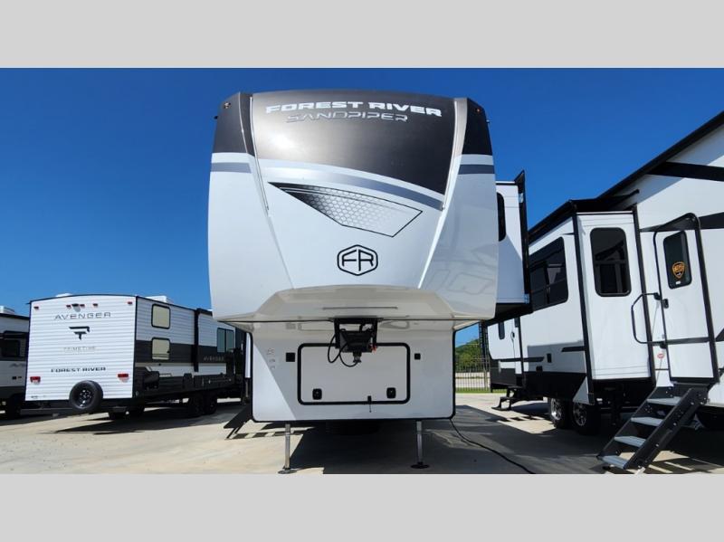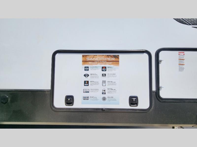 You will find the perfect balance of size, space, features, and luxury with any one of these Forest River Sandpiper fifth wheels! They are constructed with a welded aluminum framed vacuum bonded laminated superstructure, a cambered powder coated frame with rust prohibitor, and a fully enclosed underbelly for added protection against the elements. The large tinted windows come with a 80/20 UV prohibitor or you can choose the optional dual pane windows. Some hassle-free amenities include a 60k BTU on-demand water heater, full coach water filter system, tire pressure monitor system, and an electric leveling system! Inside, you'll enjoy stainless steel appliances, solid surface countertops, Beachside Sundance linoleum, recessed residential lighting, and many more comforts!