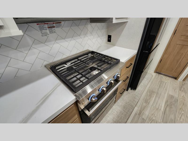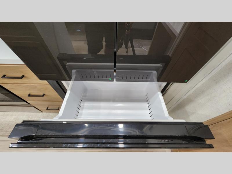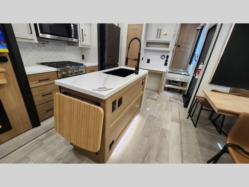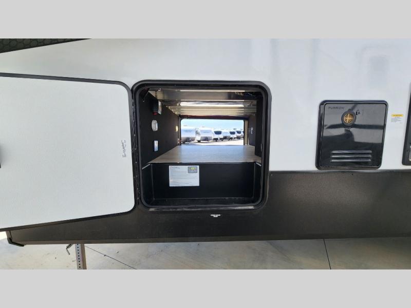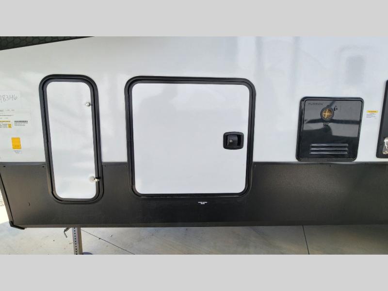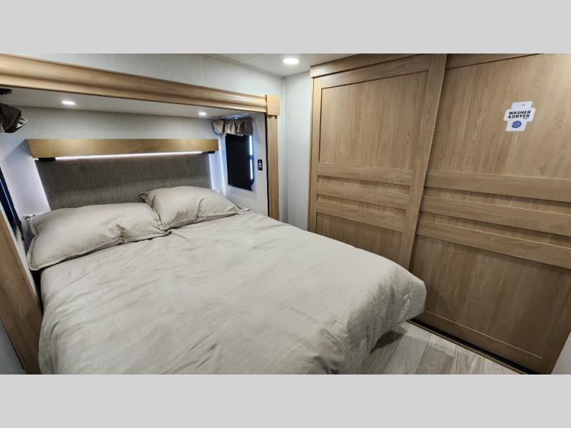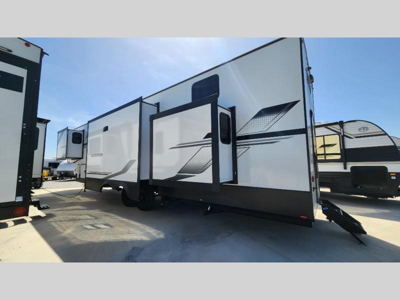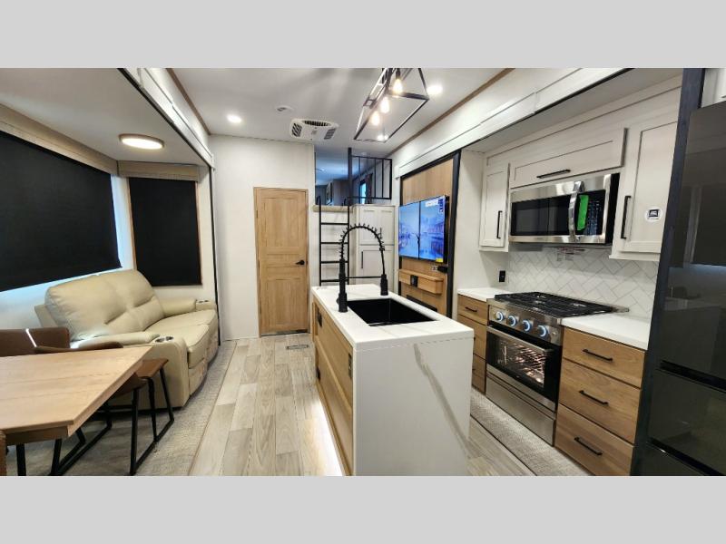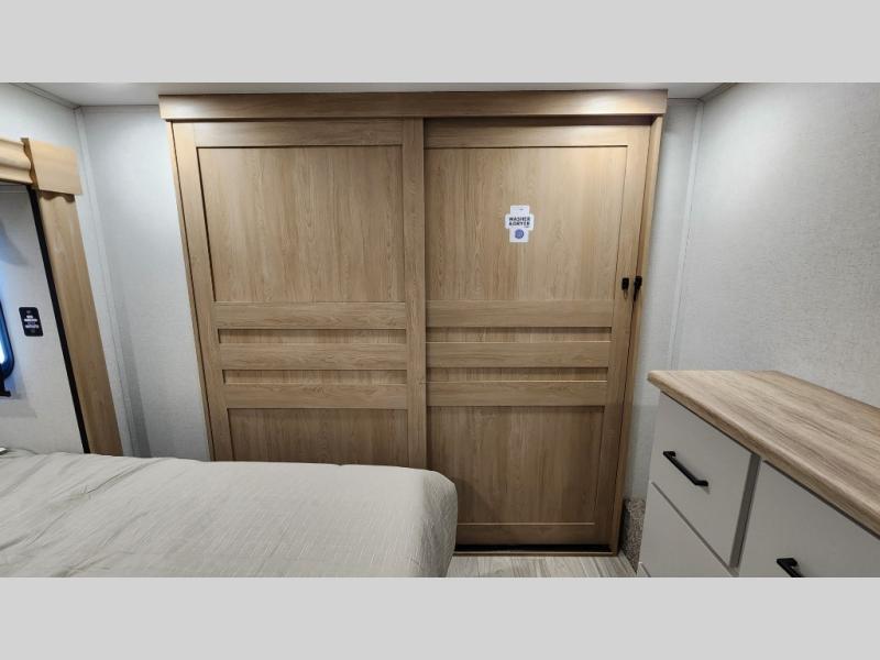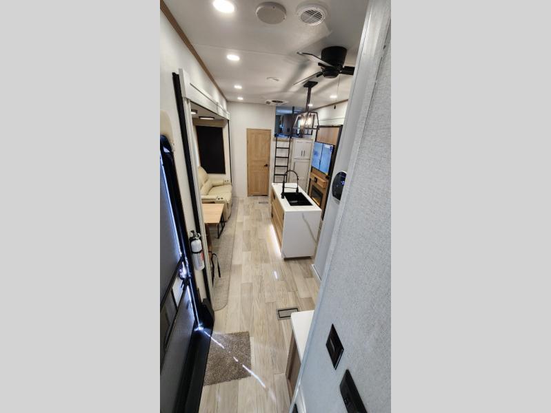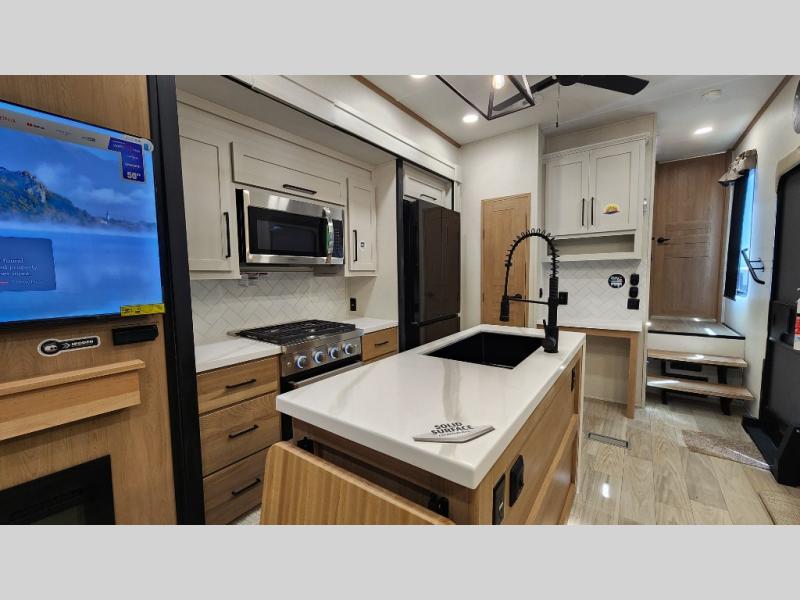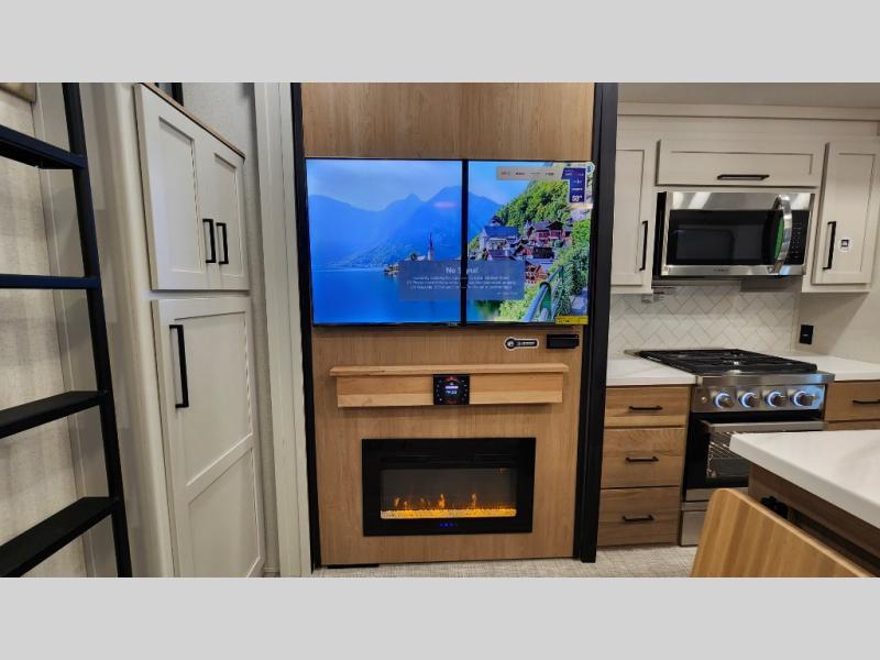 Weekend camping trips and full-time RV living is made complete in this quad slide out fifth wheel. Your crew can relax under the two power awnings, or head inside to enjoy the fireplace. There is also a 50" flat screen TV across from the theater seating, plus a free-standing dinette to dine at. There are two full baths with the front bath including a walk-in shower with a seat for your comfort, and the front private bedroom will feel just like home with its queen bed and large front wardrobe. There is even washer and dryer prep to make laundry day easier than ever. The master bedroom in back includes a second queen bed slide out, and the rear full bath has another convenience with it's exterior entry door, and