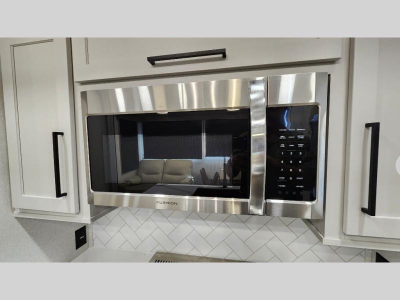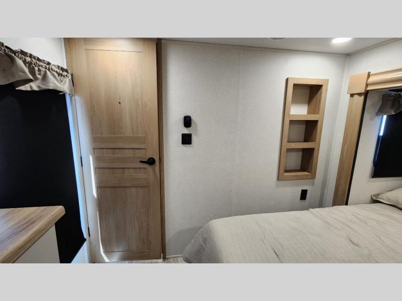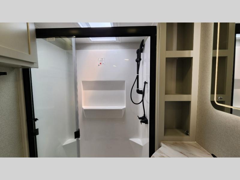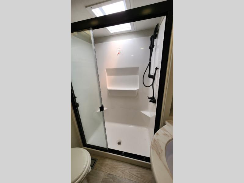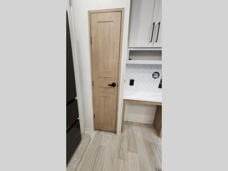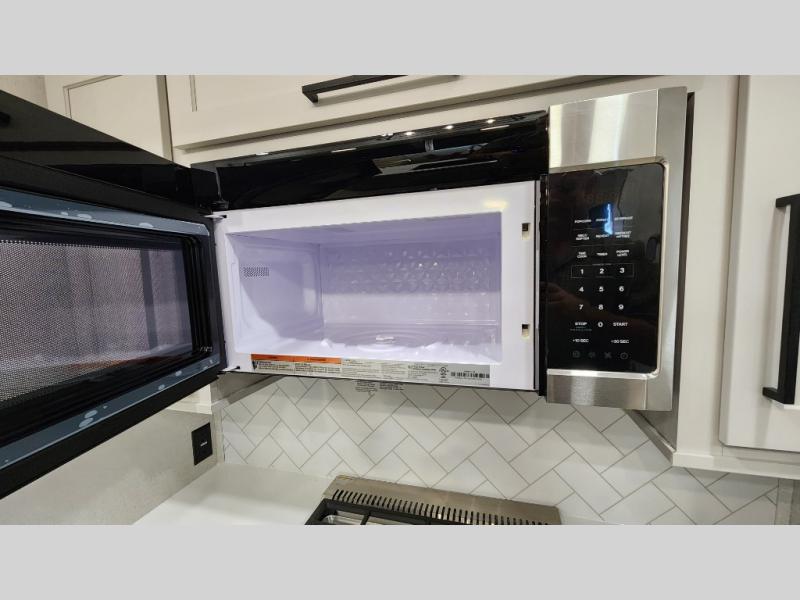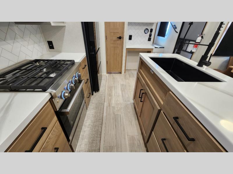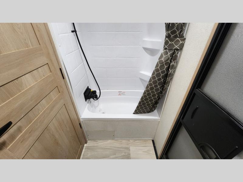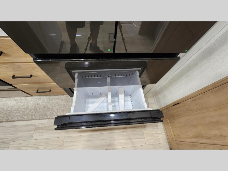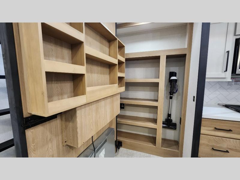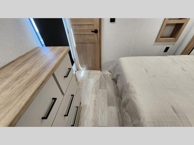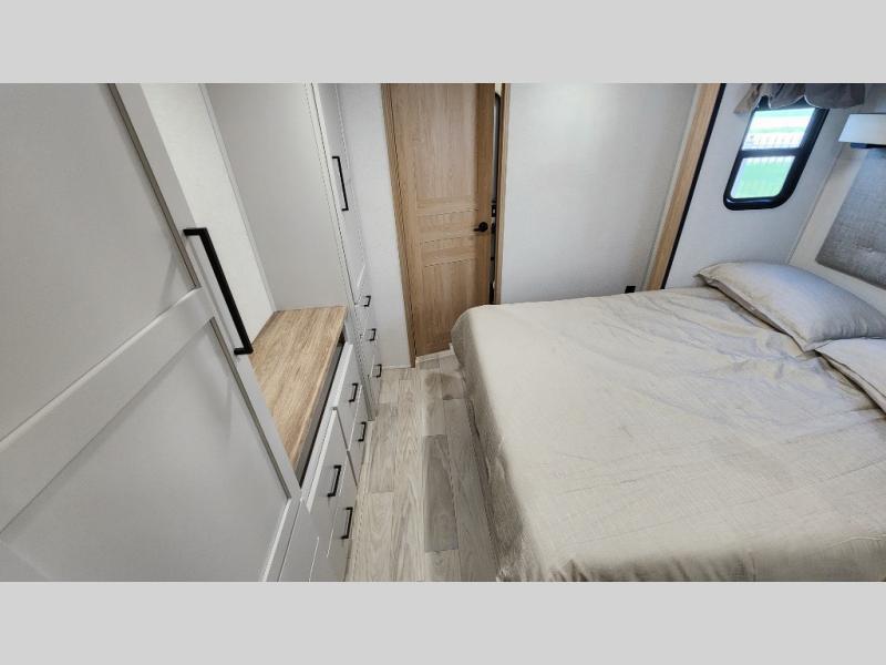 Weekend camping trips and full-time RV living is made complete in this quad slide out fifth wheel. Your crew can relax under the two power awnings, or head inside to enjoy the fireplace. There is also a 50" flat screen TV across from the theater seating, plus a free-standing dinette to dine at. There are two full baths with the front bath including a walk-in shower with a seat for your comfort, and the front private bedroom will feel just like home with its queen bed and large front wardrobe. There is even washer and dryer prep to make laundry day easier than ever. The master bedroom in back includes a second queen bed slide out, and the rear full bath has another convenience with it's exterior entry door, and