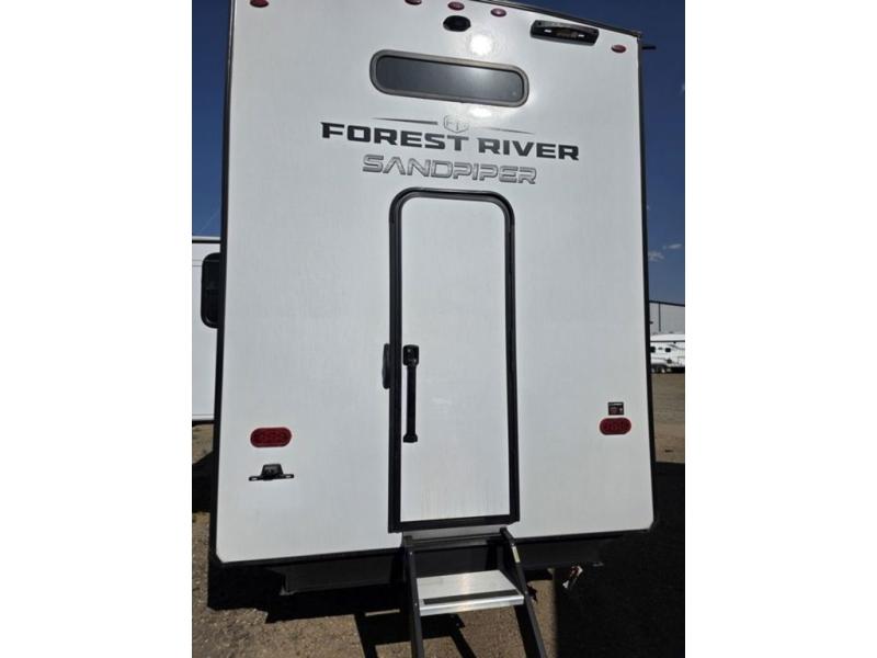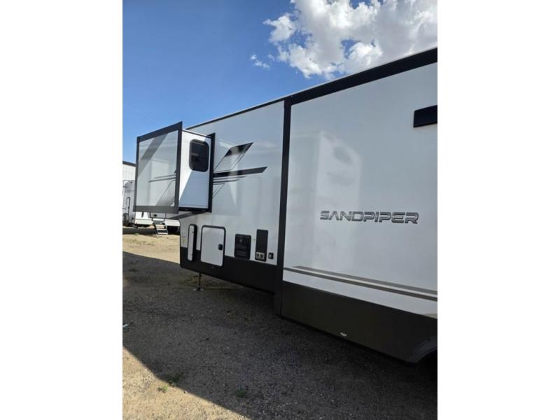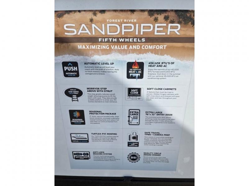 You will find the perfect balance of size, space, features, and luxury with any one of these Forest River Sandpiper fifth wheels! They are constructed with a welded aluminum framed vacuum bonded laminated superstructure, a cambered powder coated frame with rust prohibitor, and a fully enclosed underbelly for added protection against the elements. The large tinted windows come with a 80/20 UV prohibitor or you can choose the optional dual pane windows. Some hassle-free amenities include a 60k BTU on-demand water heater, full coach water filter system, tire pressure monitor system, and an electric leveling system! Inside, you'll enjoy stainless steel appliances, solid surface countertops, Beachside Sundance linoleum, recessed residential lighting, and many more comforts!