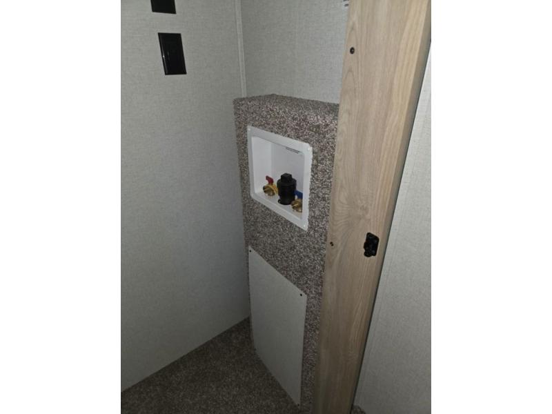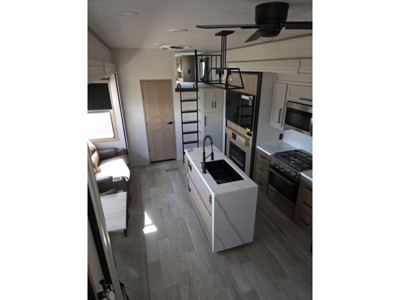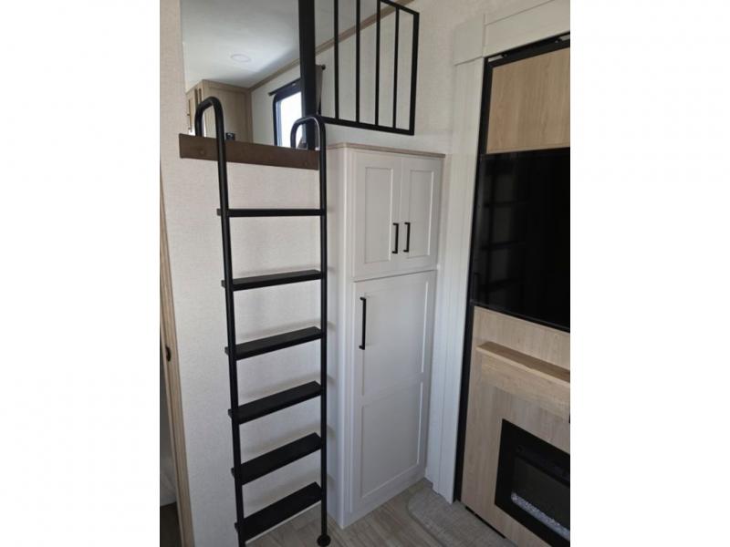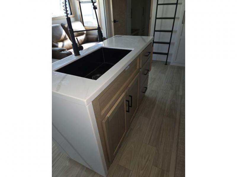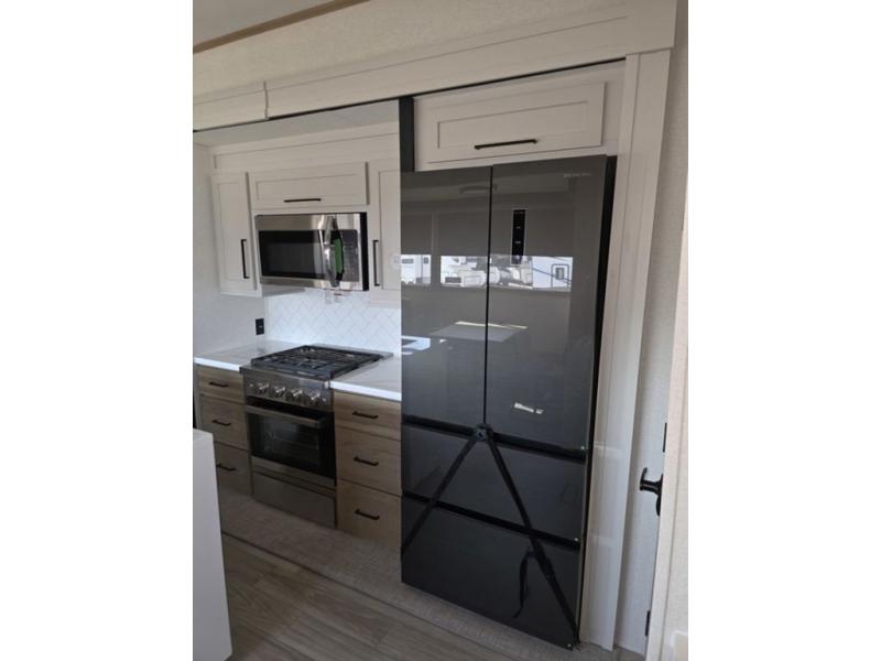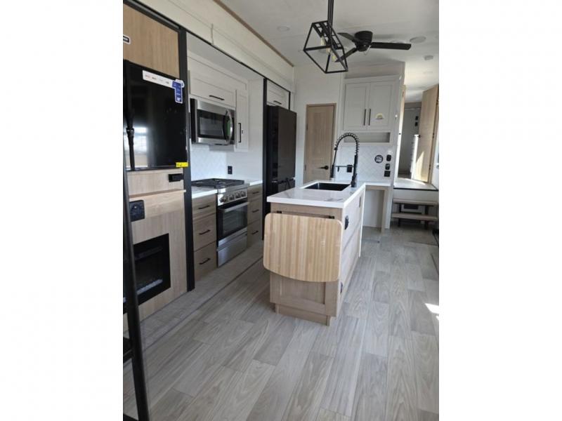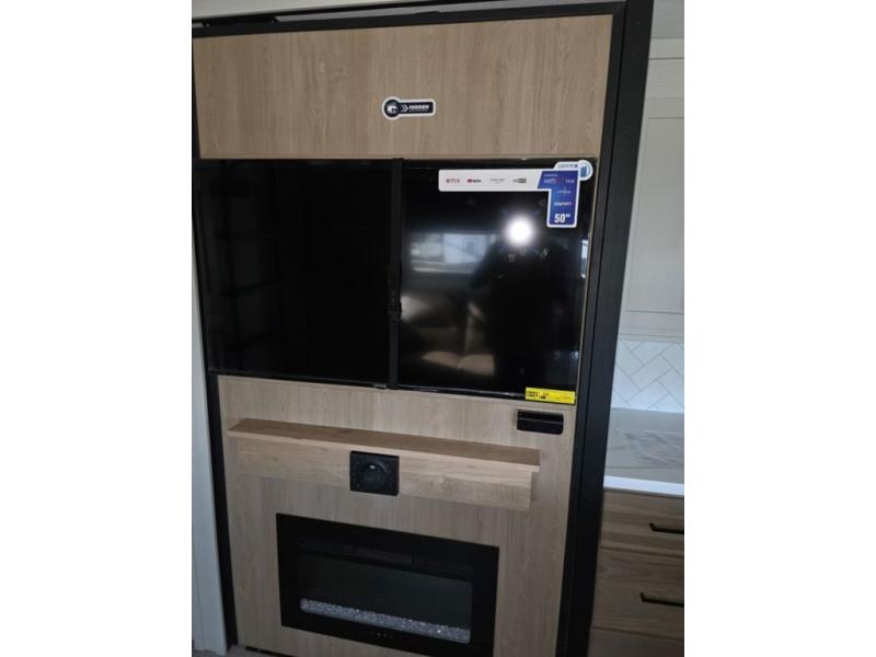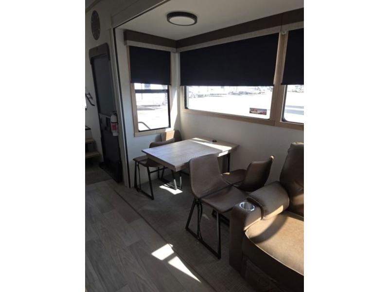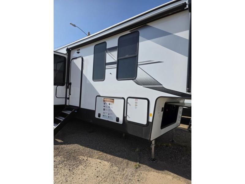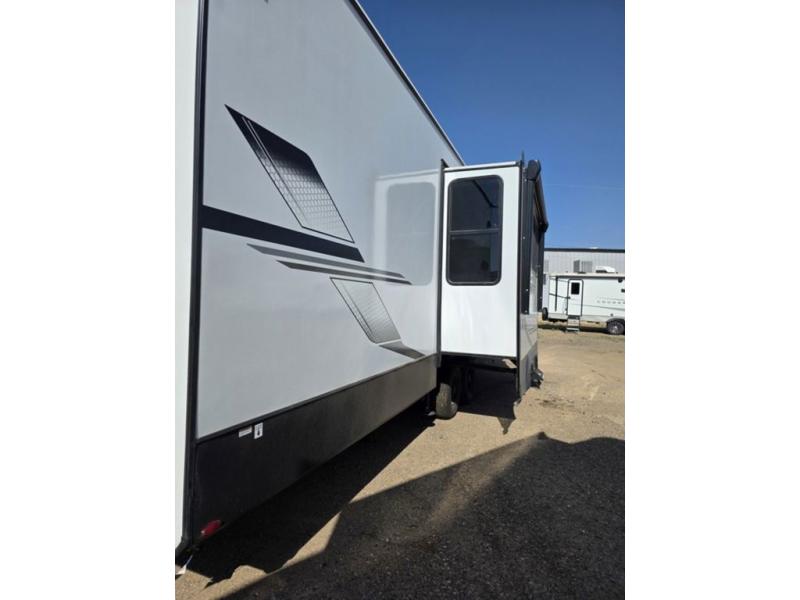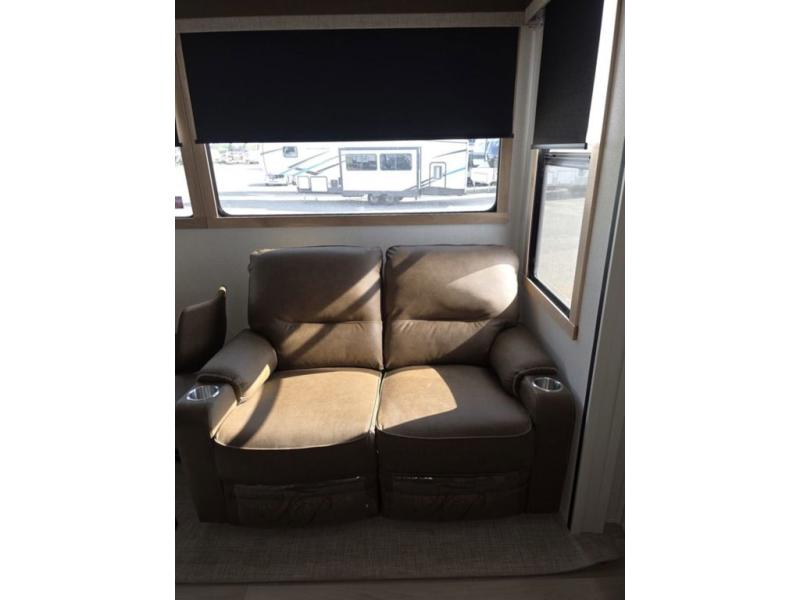 Weekend camping trips and full-time RV living is made complete in this quad slide out fifth wheel. Your crew can relax under the two power awnings, or head inside to enjoy the fireplace. There is also a 50" flat screen TV across from the theater seating, plus a free-standing dinette to dine at. There are two full baths with the front bath including a walk-in shower with a seat for your comfort, and the front private bedroom will feel just like home with its queen bed and large front wardrobe. There is even washer and dryer prep to make laundry day easier than ever. The master bedroom in back includes a second queen bed slide out, and the rear full bath has another convenience with it's exterior entry door, and
