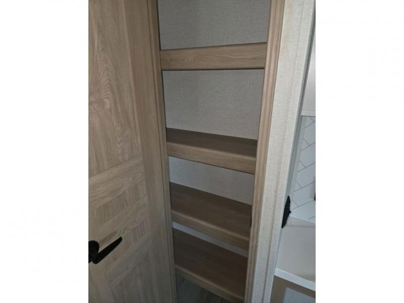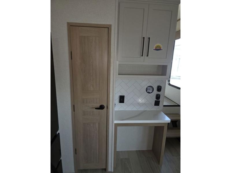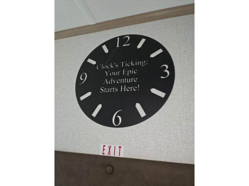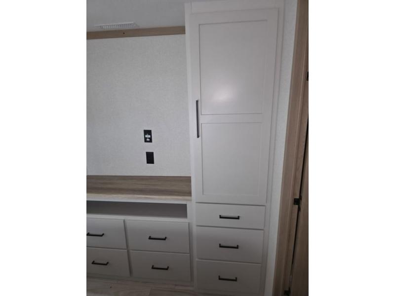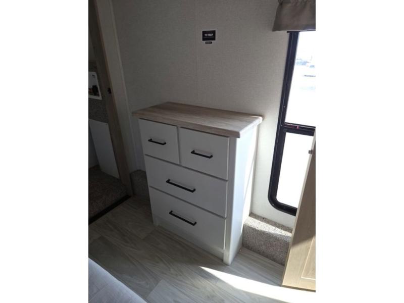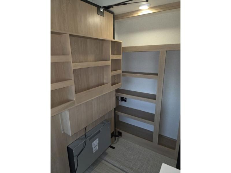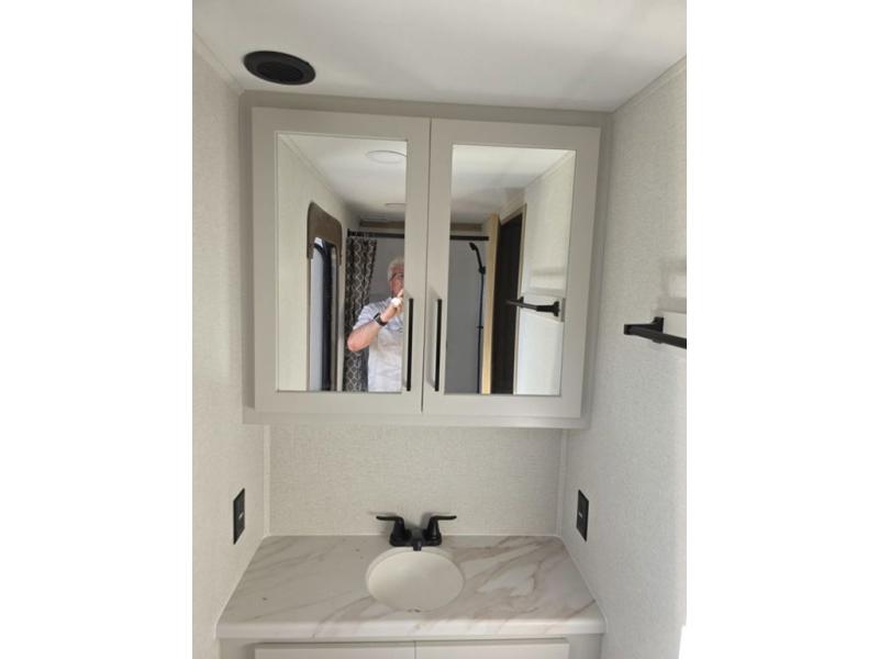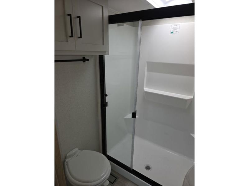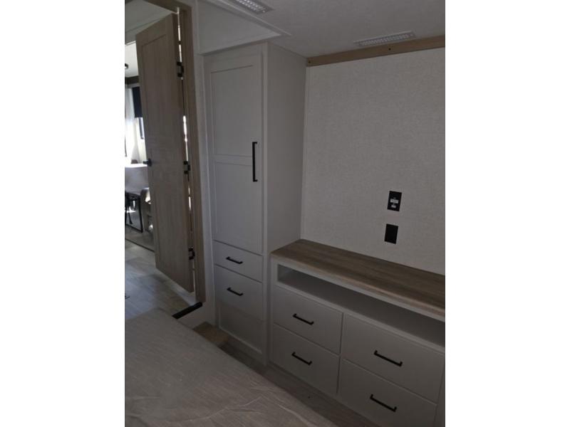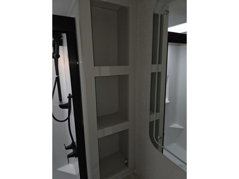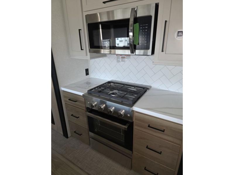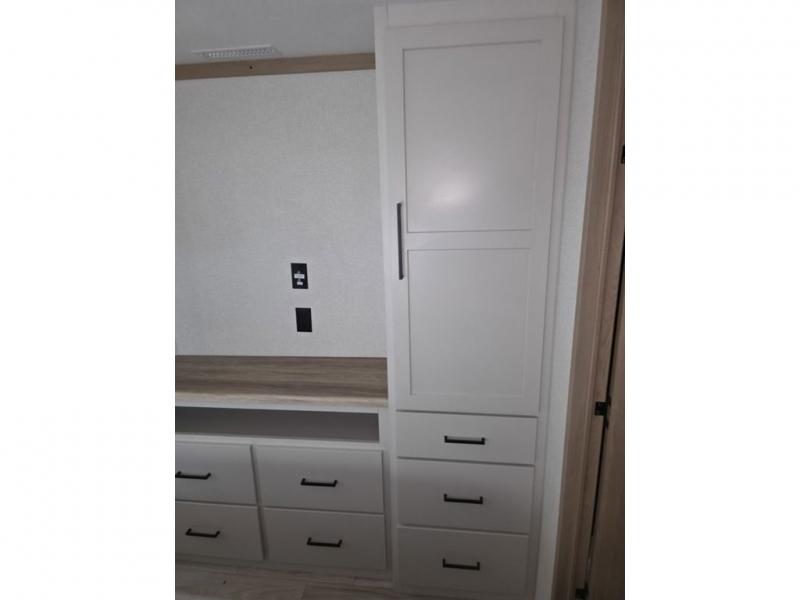 Weekend camping trips and full-time RV living is made complete in this quad slide out fifth wheel. Your crew can relax under the two power awnings, or head inside to enjoy the fireplace. There is also a 50" flat screen TV across from the theater seating, plus a free-standing dinette to dine at. There are two full baths with the front bath including a walk-in shower with a seat for your comfort, and the front private bedroom will feel just like home with its queen bed and large front wardrobe. There is even washer and dryer prep to make laundry day easier than ever. The master bedroom in back includes a second queen bed slide out, and the rear full bath has another convenience with it's exterior entry door, and