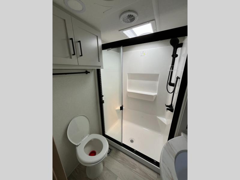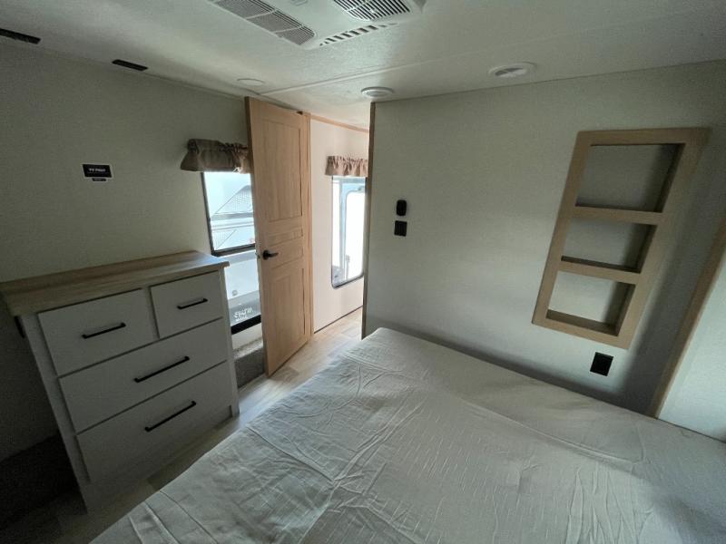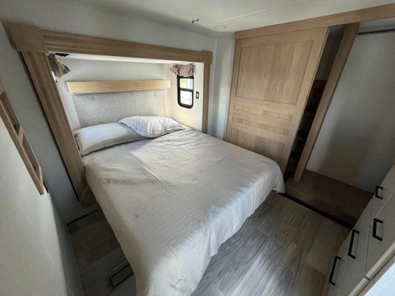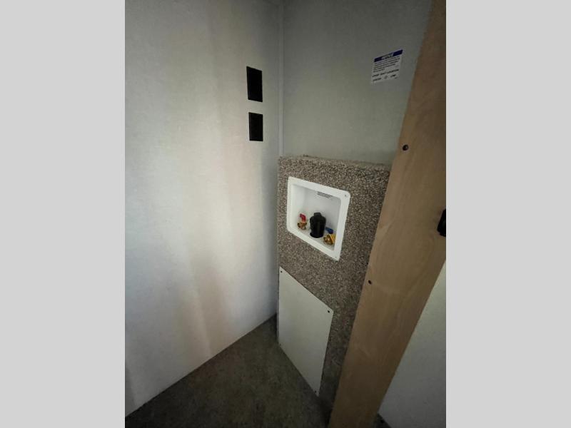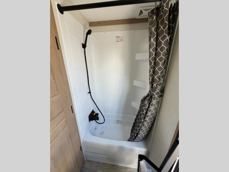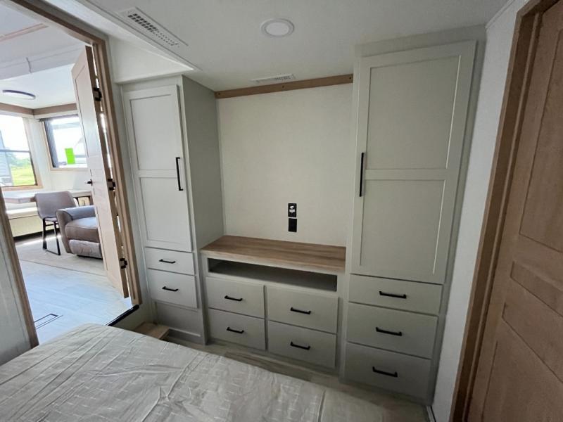 Weekend camping trips and full-time RV living is made complete in this quad slide out fifth wheel. Your crew can relax under the two power awnings, or head inside to enjoy the fireplace. There is also a 50" flat screen TV across from the theater seating, plus a free-standing dinette to dine at. There are two full baths with the front bath including a walk-in shower with a seat for your comfort, and the front private bedroom will feel just like home with its queen bed and large front wardrobe. There is even washer and dryer prep to make laundry day easier than ever. The master bedroom in back includes a second queen bed slide out, and the rear full bath has another convenience with it's exterior entry door, and