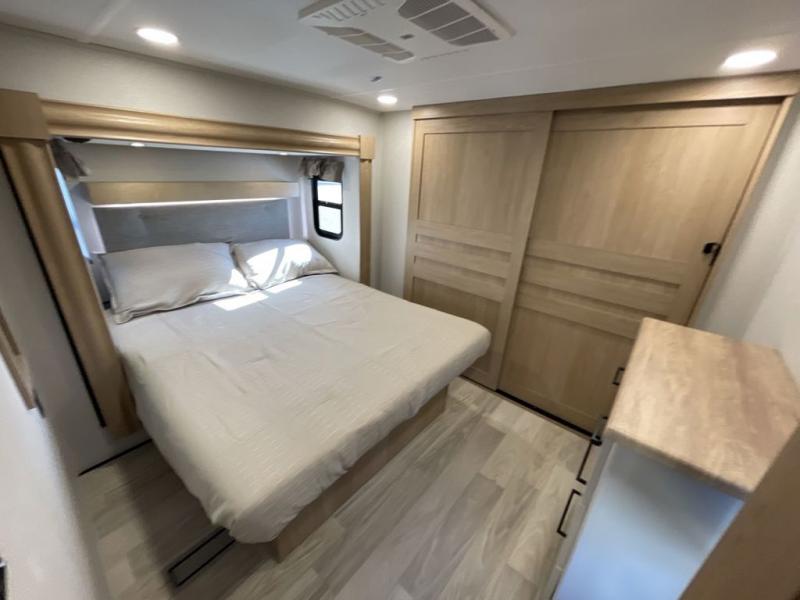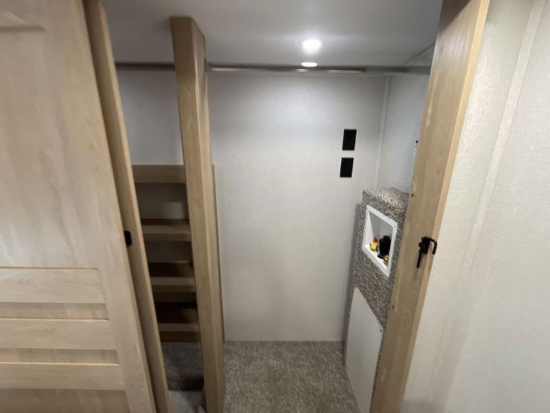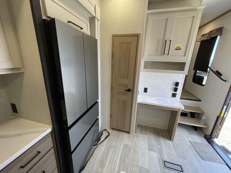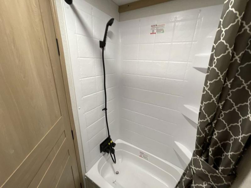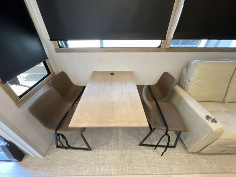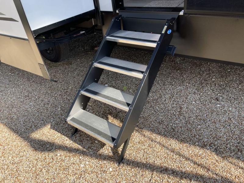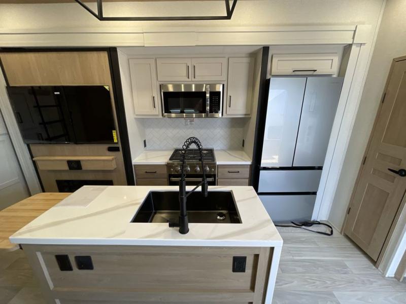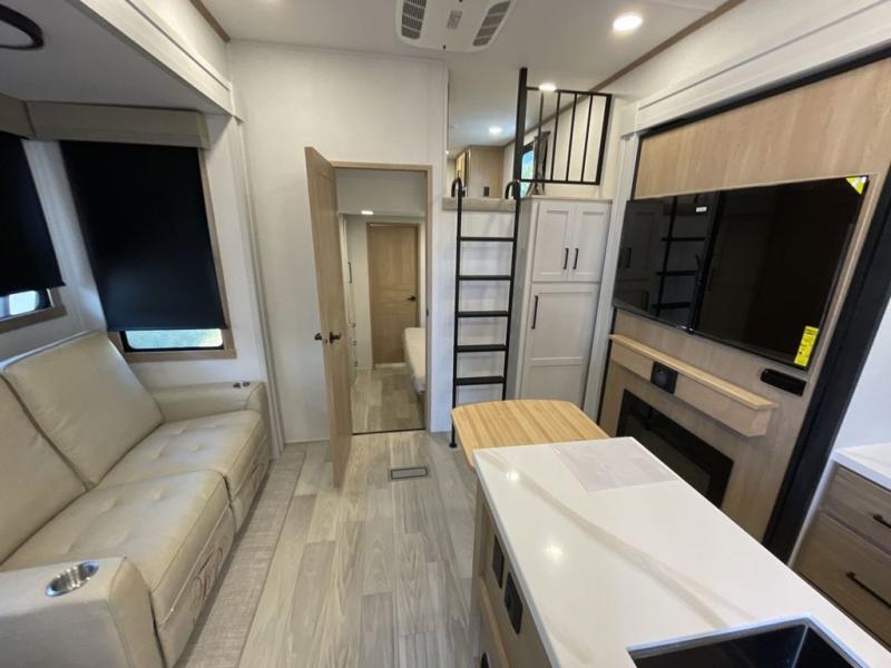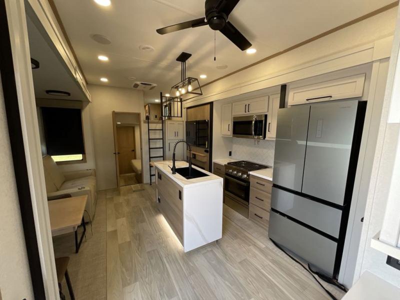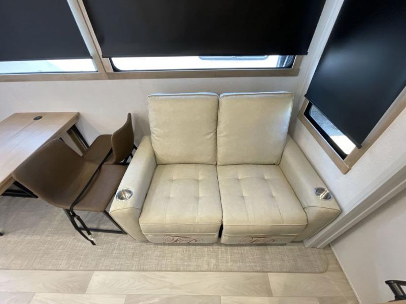 Enjoy a home on wheels with this fifth wheel! There are two bedrooms to choose from plus an upper loft with two 32" x 74" bunk mats, cabinets, and TV prep. The front private bedroom has a queen bed slide across from a dresser and next to a front wardrobe that is prepped to add an optional washer and dryer. The second bedroom has a queen bed slide across from a dresser with wardrobes on either side, plus it's very own full rear bathroom which has a tub and a rear entry/exit door to the unit. The second full bathroom has a one-piece fiberglass shower so everyone can get ready quickly in the morning. Prepare your best home cooked meals with the kitchen island and three burner cooktop then enjoy it at the free-standing dinette. Relax in true comfort each night in the theater seating across from the fireplace and 50" TV at the entertainment center!