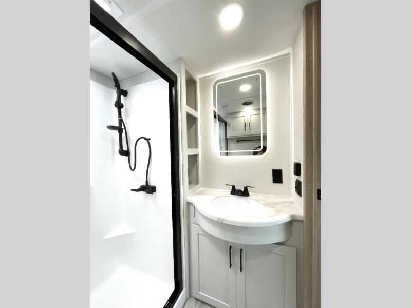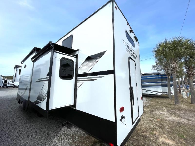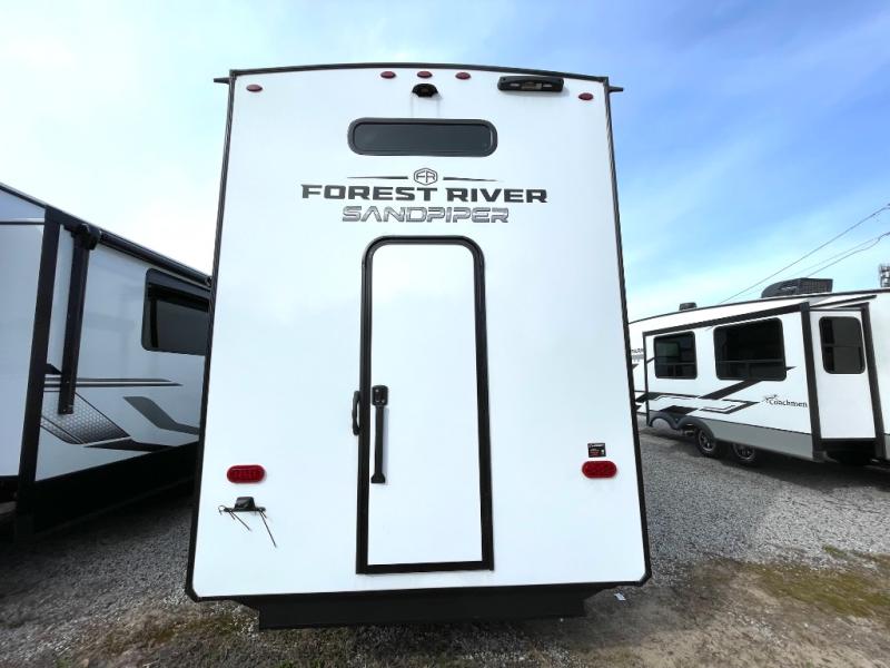 You will find the perfect balance of size, space, features, and luxury with any one of these Forest River Sandpiper fifth wheels! They have a cambered powder coated frame with rust prohibitor, and a fully enclosed underbelly for added protection against the elements. Also, the power front jacks with spring-loaded pins enhance the convenience, speed, and safety. The large, tinted windows come with a 80/20 UV prohibitors. Some hassle-free amenities include a 60k BTU on-demand water heater, porcelain foot flush toilet(s), tire pressure monitor system, and an electric leveling system! Inside, you'll enjoy stainless steel kitchen package, solid surface kitchen countertops, Beachside Sundance Congoleum linoleum, recessed residential lighting, and many more comforts!